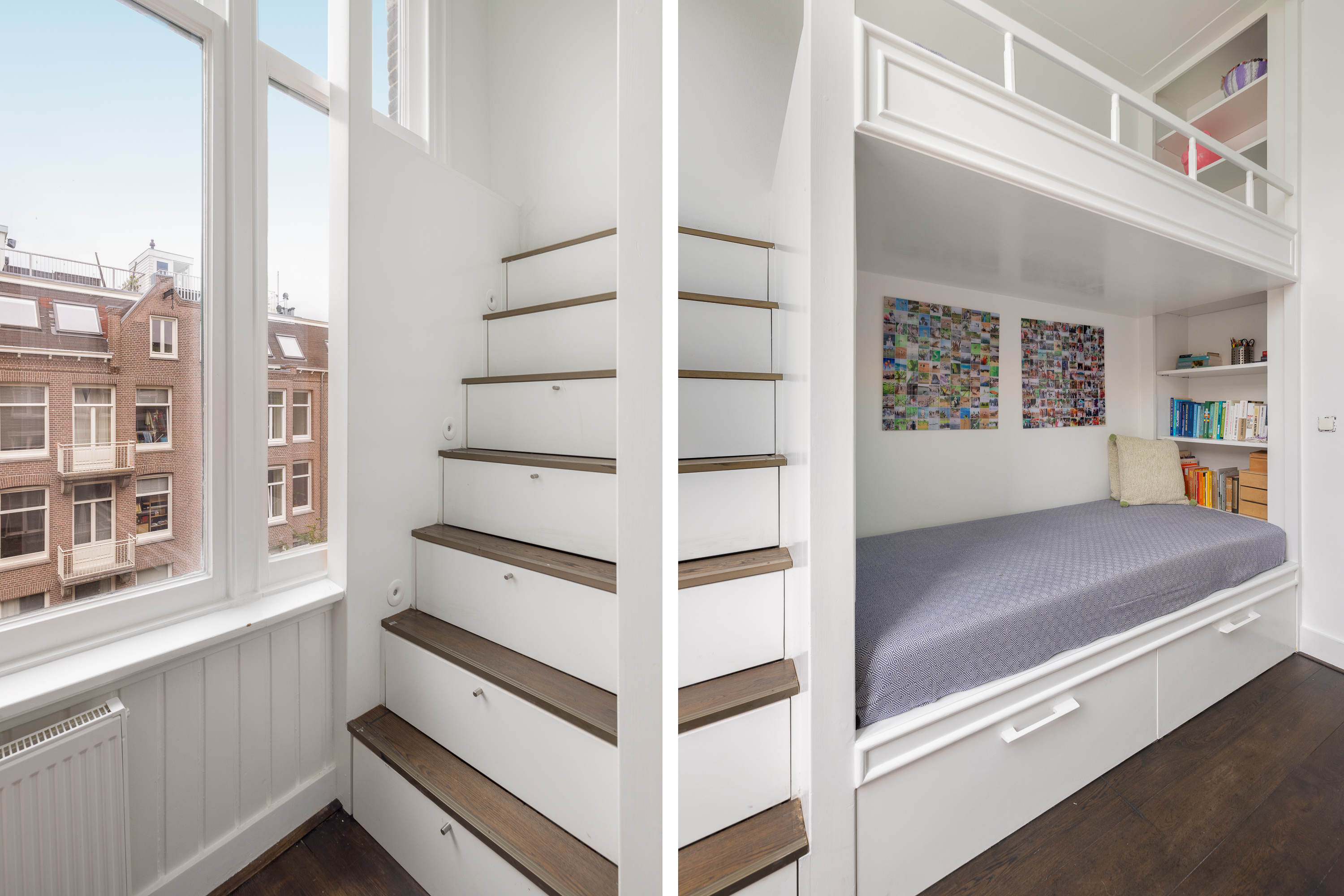 Landing. Here you will also find a separate toilet with a sink. At the rear is a well-sized bedroom with two built-in closets and large windows. The bathroom features a spacious bathtub, walk-in shower, wide sink with mirror, and a built-in closet that provides access to the bedroom at the rear of the house. At the front of the house are two bedrooms. One bedroom has space for a king-size bed with a built-in closet, and the other bedroom has a practical and cozy custom-made bunk bed with spacious drawers both under the bed and in the bed’s stairs. These also function as steps to reach the top bed. The bottom bed can be easily removed, leaving a loft bed. Centrally located on this floor, you will also find a very spacious walk-in closet, which can also be set up as a study.