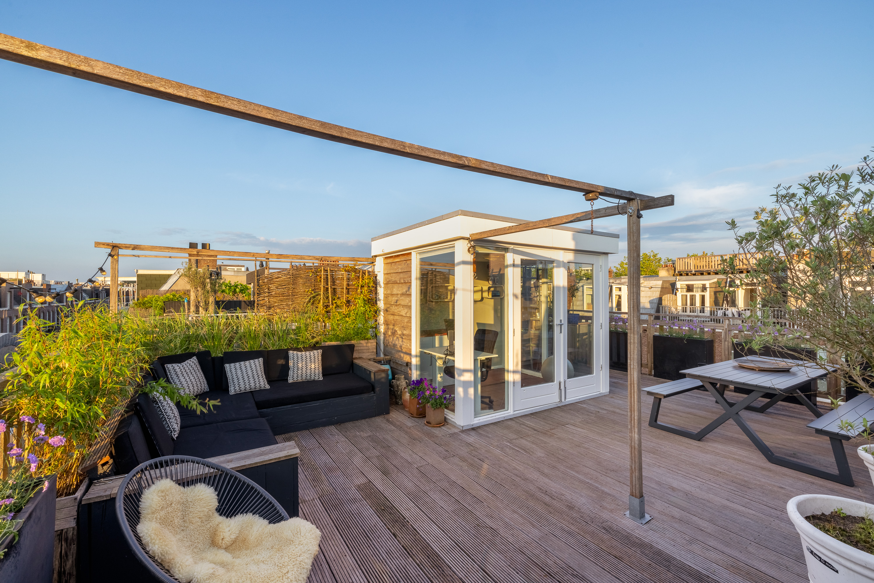 At a fantastic location in the popular Amsterdam Oud-Zuid, we offer this wonderfully bright and spacious double upper house. The beautiful roof terrace provides plenty of privacy, and you can enjoy the sun all day long. Multiple seating areas can be created. The house has three bedrooms, a spacious walk-in closet, and a roof terrace structure that can also be set up as a home office or yoga space. At the front of the house, there is also a lovely balcony.