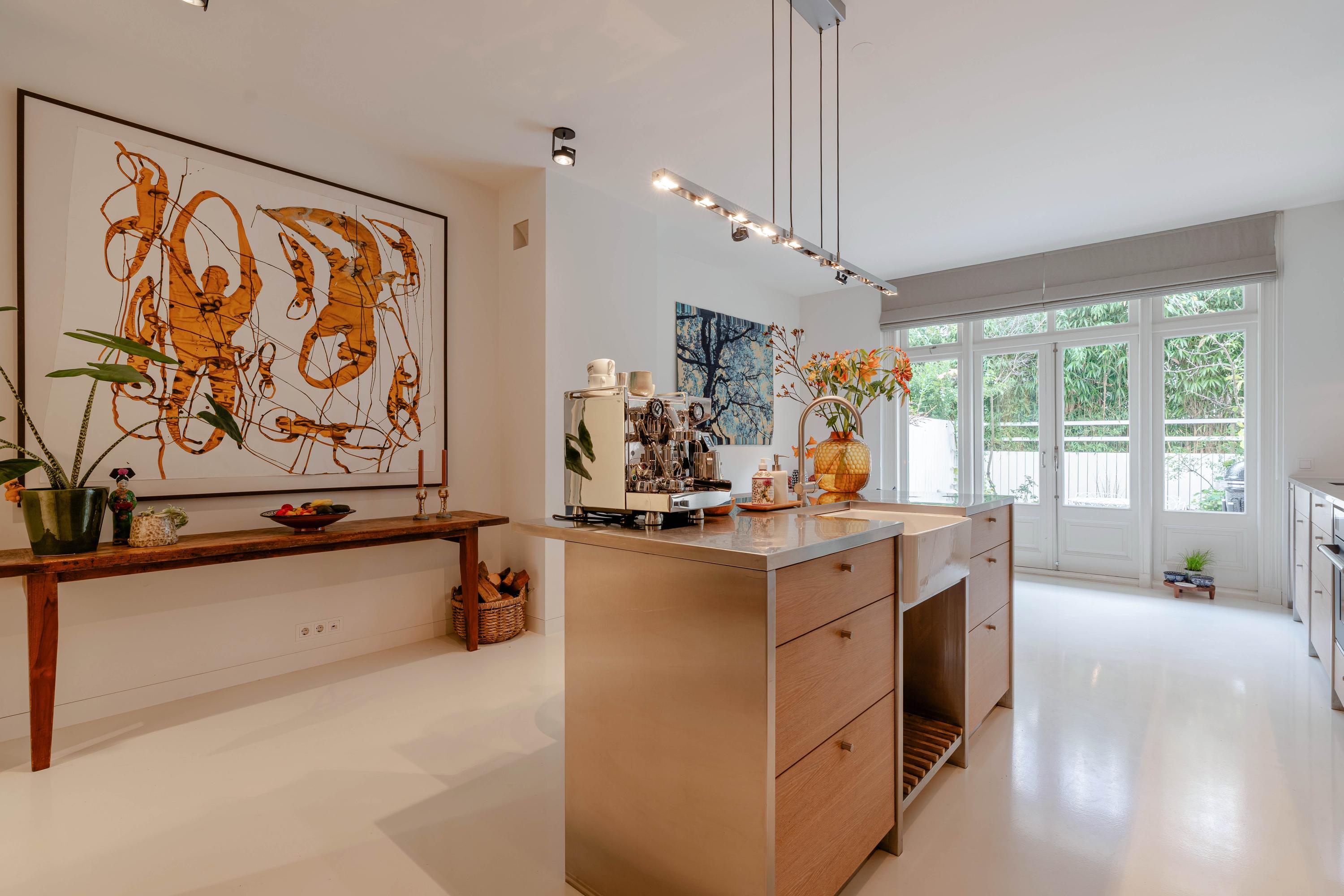Through the entrance, you step into the generous hallway. The character of the home is immediately evident, with high ceilings and beautiful original details preserved throughout much of the property. From the hall, you access the spacious living kitchen at the rear. This luxurious, custom-designed kitchen is fitted with high-quality built-in appliances, including two sinks (one with a Quooker), a five-burner gas stove with extractor hood, a separate oven, microwave, full-size refrigerator, freezer, dishwasher, and a warming drawer, ideal for preparing larger dinners. The kitchen also features a fireplace.