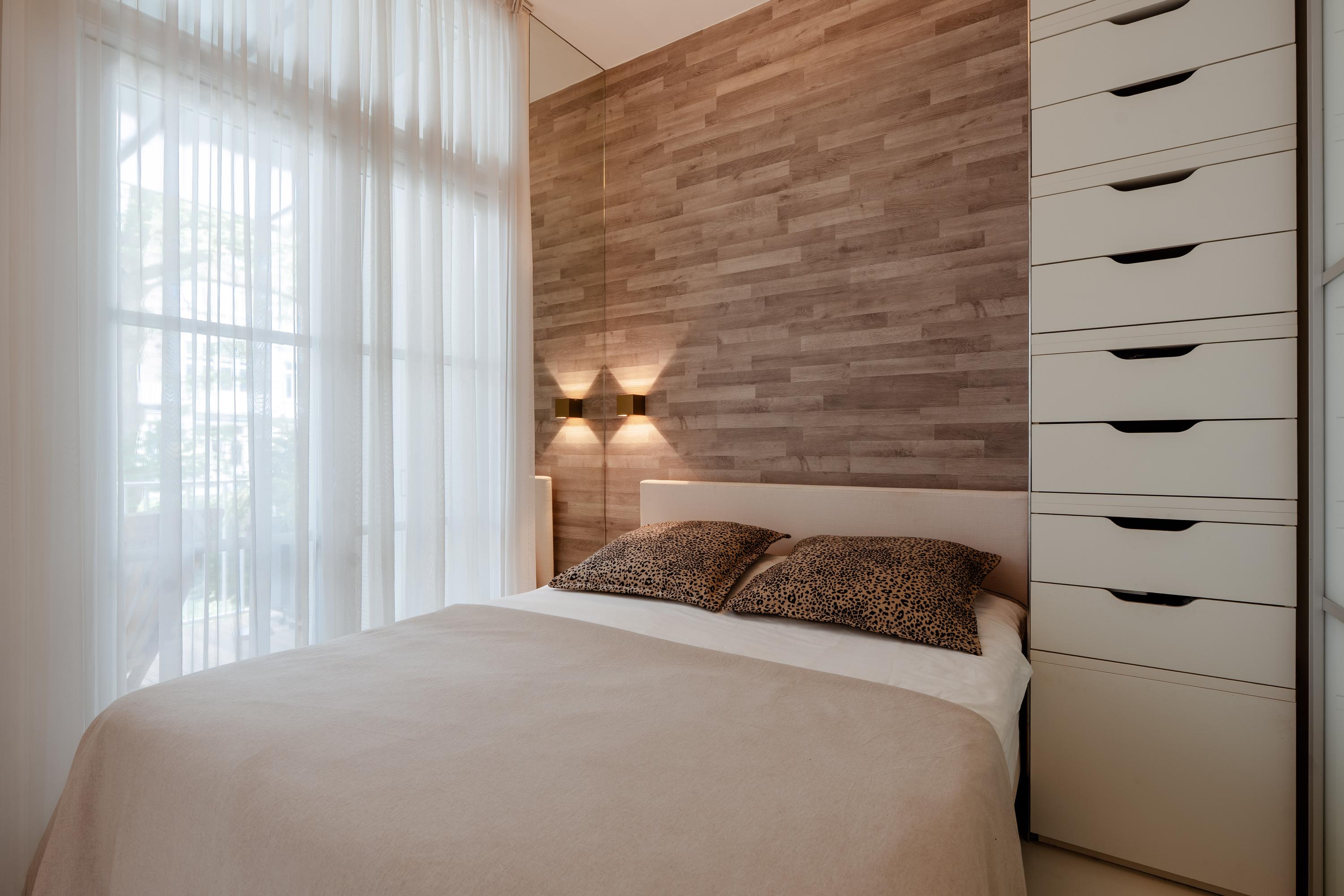 The bedroom is quietly located at the rear of the apartment and also features double French doors to the balcony. The balcony is accessible both from the kitchen and from the bedroom.