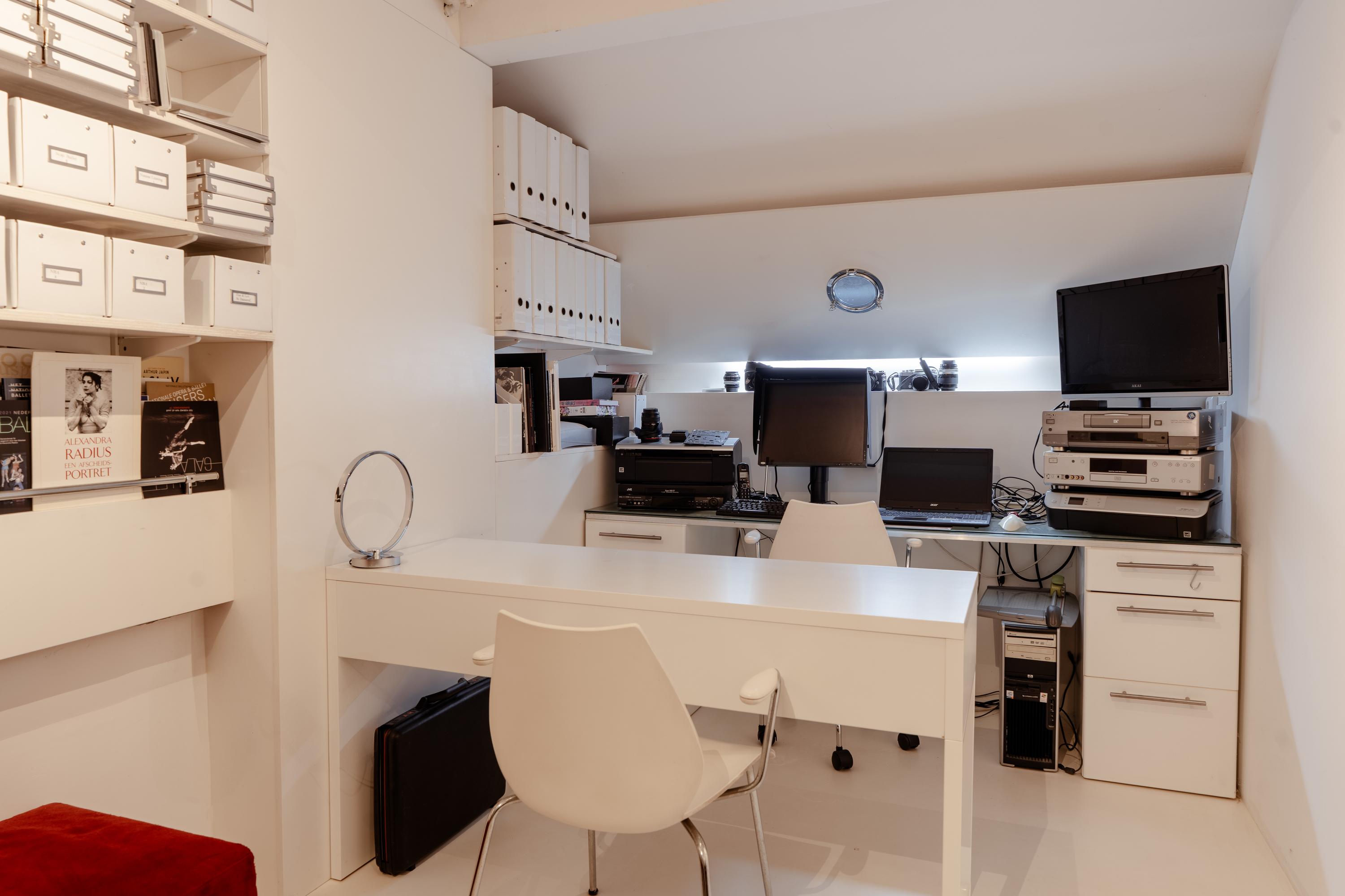 A red-carpeted staircase leads to the basement level with underfloor heating. This space of approximately 13 m² is perfectly suitable as a guest room, yoga or fitness area, with ample storage possibilities. The space is currently used as an office.