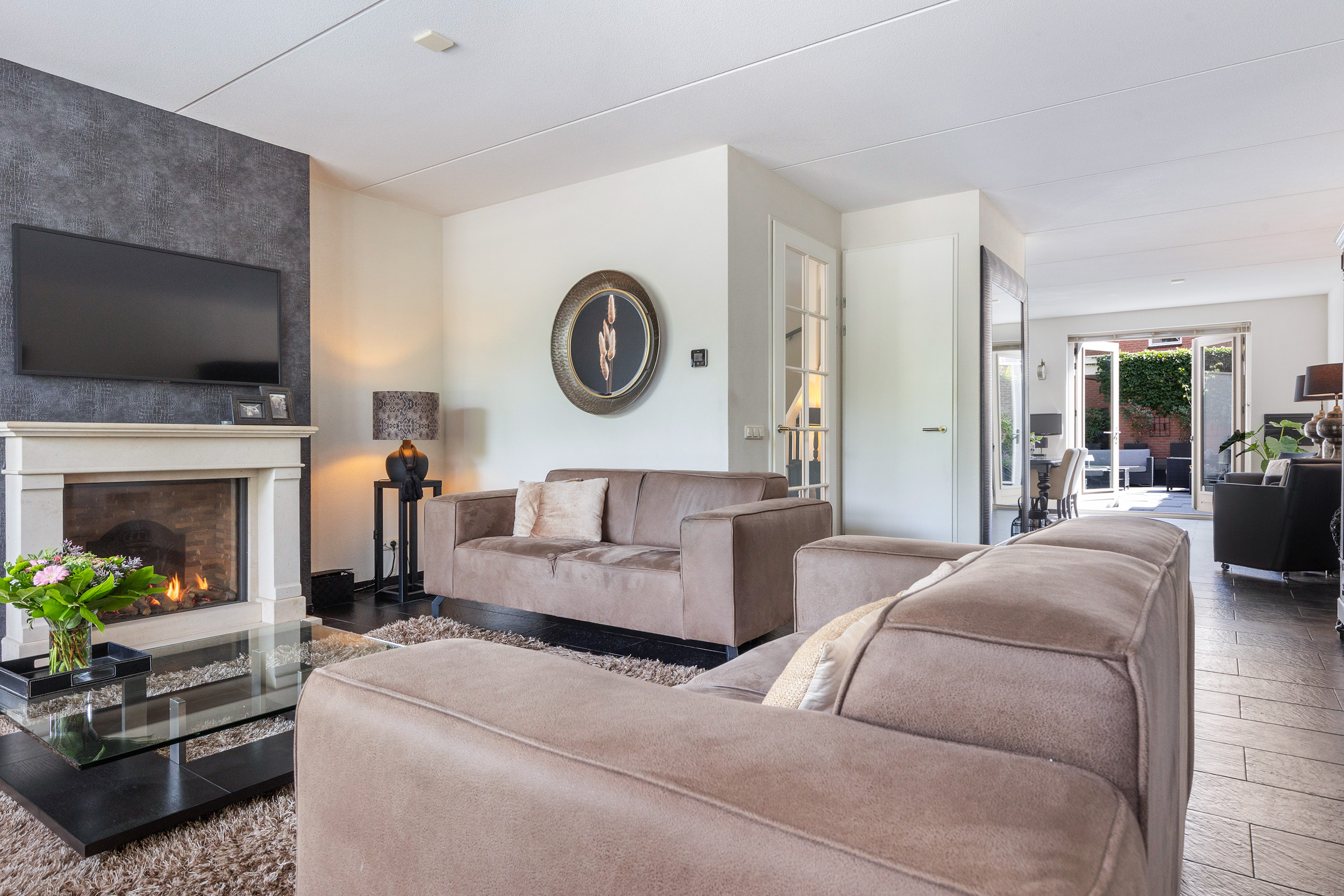 De lichte woonkamer met karakteristieke erker en stijlvolle gashaard vormt het hart van het huis. Dankzij de royale opzet en de vele raampartijen is dit een aangename plek om samen te zijn. Vanuit de woonkamer loopt u door naar de ruime woonkeuken (ca. 26 m²), waar plaats is voor een grote eettafel. De keuken is voorzien van diverse inbouwapparatuur en heeft openslaande deuren naar de tuin – ideaal om binnen en buiten naadloos met elkaar te verbinden.