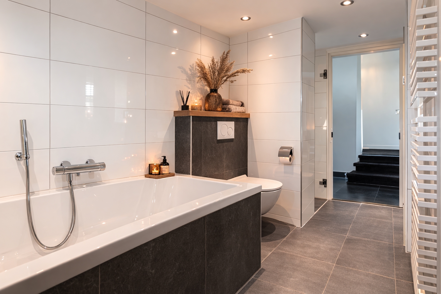 Three steps lead down to the lower section of the extension, where a modern bathroom is located. This bathroom is fitted with a walk-in shower with glass screen and rain shower, a double-ended bath, a wall-mounted WC, a designer radiator and electric underfloor heating. The oak vanity unit with twin basins and mirrored cabinet forms a stylish ensemble. A large window with opening section provides pleasant natural light and ventilation.