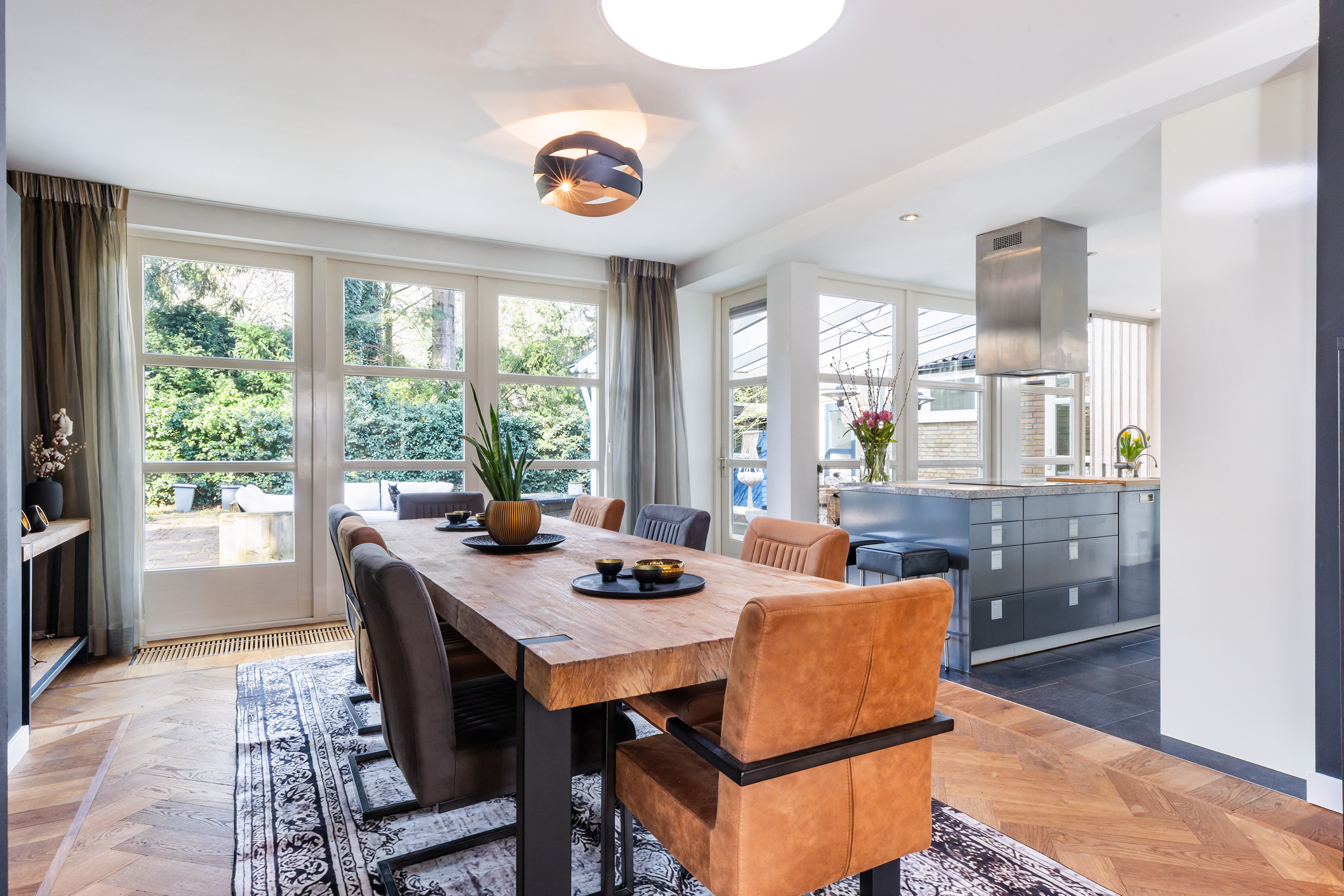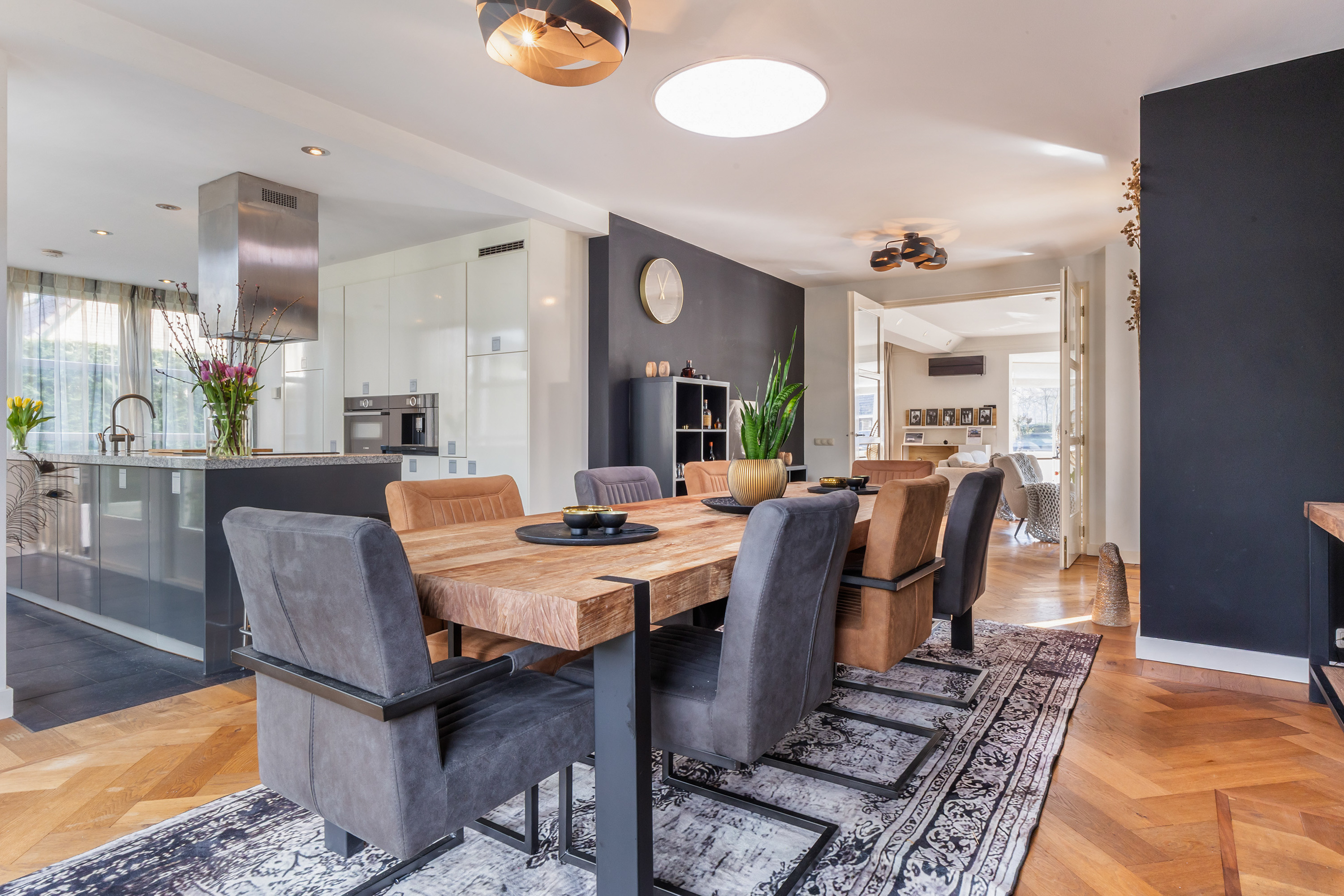 The kitchen forms the heart of the home and offers ample space for a large dining table. A gas fireplace and a roof lantern provide additional atmosphere and natural light. Double doors open onto the garden, while a single door provides access to the veranda. The high-end Leicht kitchen is finished in gloss white and grey, with a granite worktop and fitted with premium appliances including a coffee machine, combination oven, dishwasher, refrigerator, induction hob with stainless steel extractor hood and a Quooker tap.