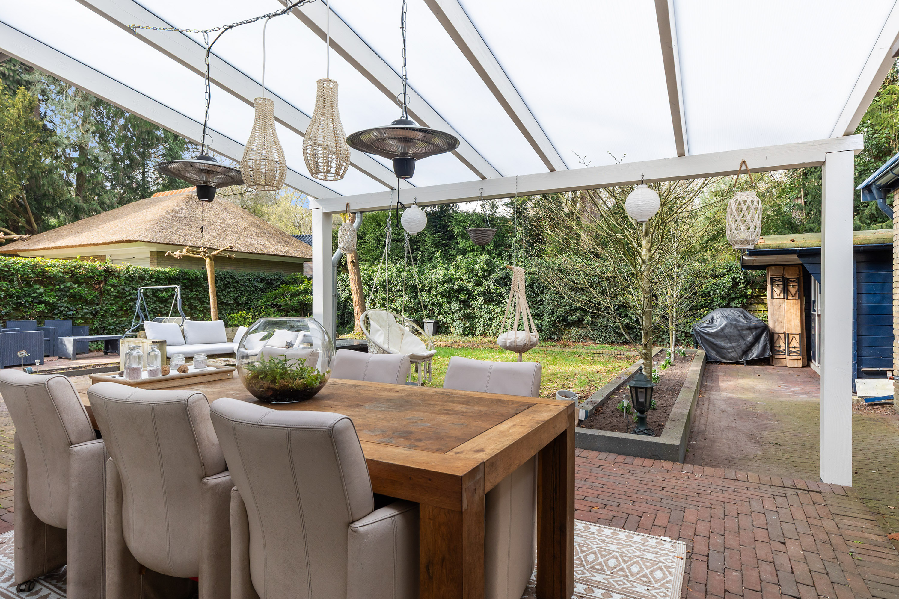 The sunny rear garden, facing south-west, has been designed for ease of maintenance and offers a high degree of privacy. Fully enclosed, it is ideal for both children and pets. The garden features a combination of paving, lawn, mature planting and gravel areas. In addition, there is a wooden garden house and a practical log store. The spacious veranda at the rear of the property, constructed in timber with a translucent roof and zinc drainage, provides a comfortable and sheltered outdoor living space. Adjacent to the dining area is a large electrically operated awning, complete with integrated heating and lighting.