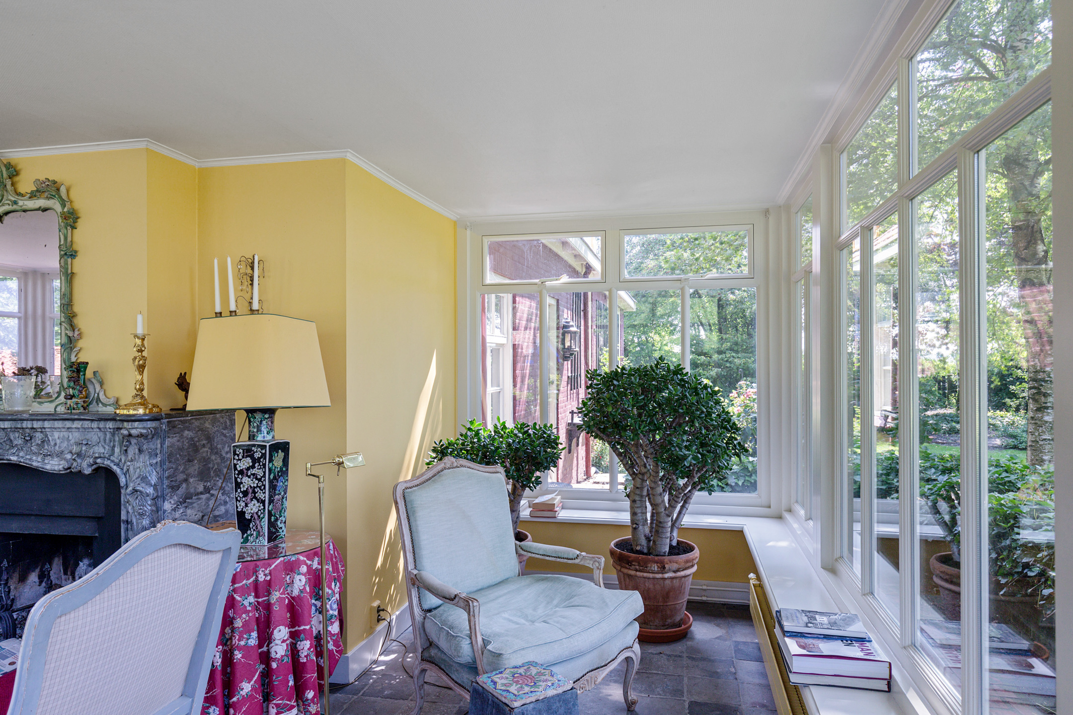 Full of character, it boasts a Stevenson or Norwich cornice, a French dessus-de-porte from the 18th century, a faux marble fireplace, and a trumeau from a Frisian town hall, all contributing to its historic charm.
