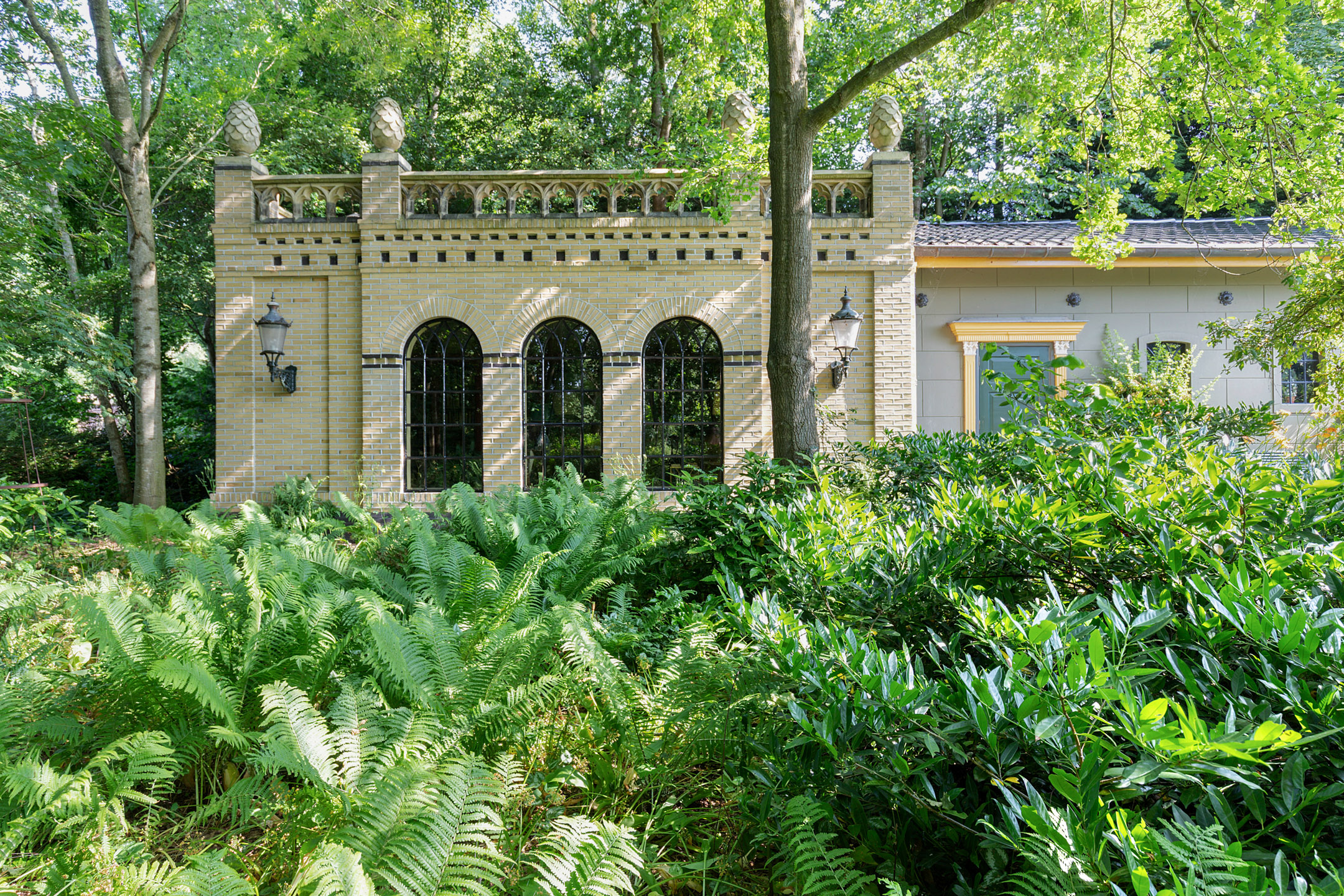 A striking feature is the elegant garden dome, designed by F. van der Velde, resting on concrete pillars and topped with a gilded pinecone by artist Axel van der Horst, inspired by the Marekerk in Leiden.