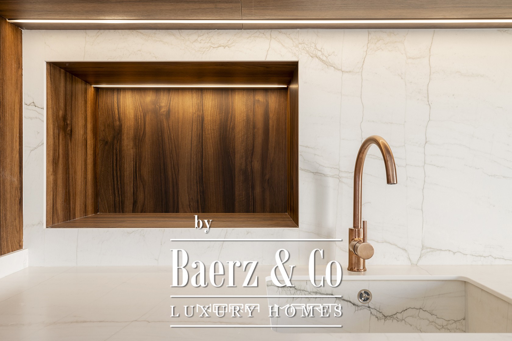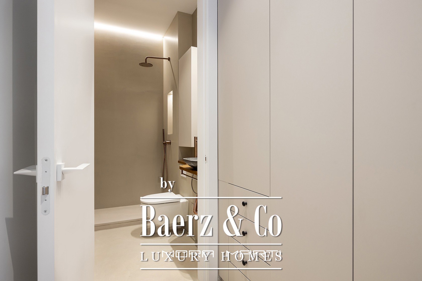 The apartment offers two well-proportioned bedrooms and two bathrooms, with an internal layout that instills a sense of openness and clarity. Restored galleries and windows shape the living experience, drawing in natural light and animating each space with warmth and rhythm throughout the day. Every lighting element has been chosen following an architectural light study, fostering a quietly sophisticated ambience from dawn to dusk.