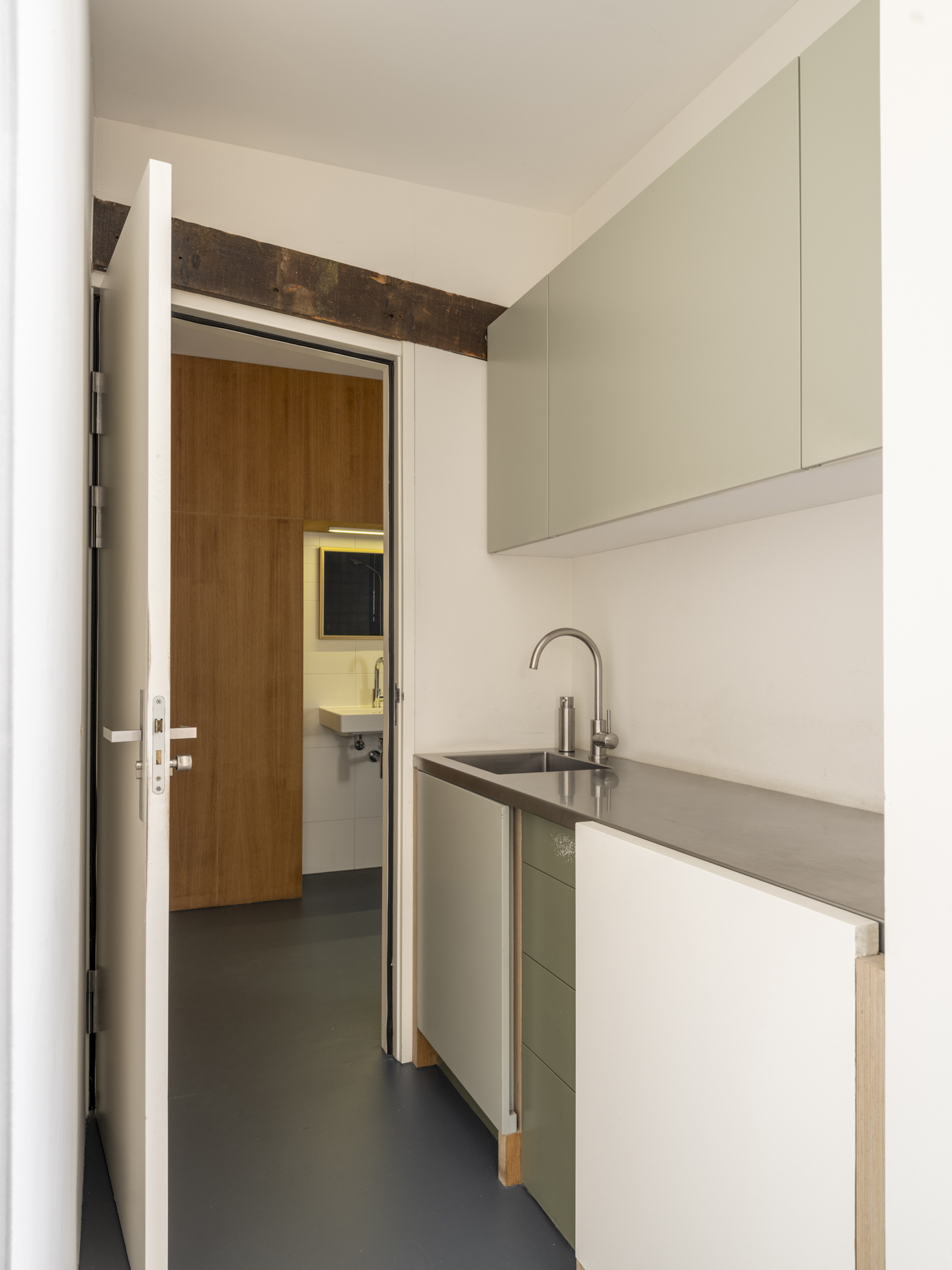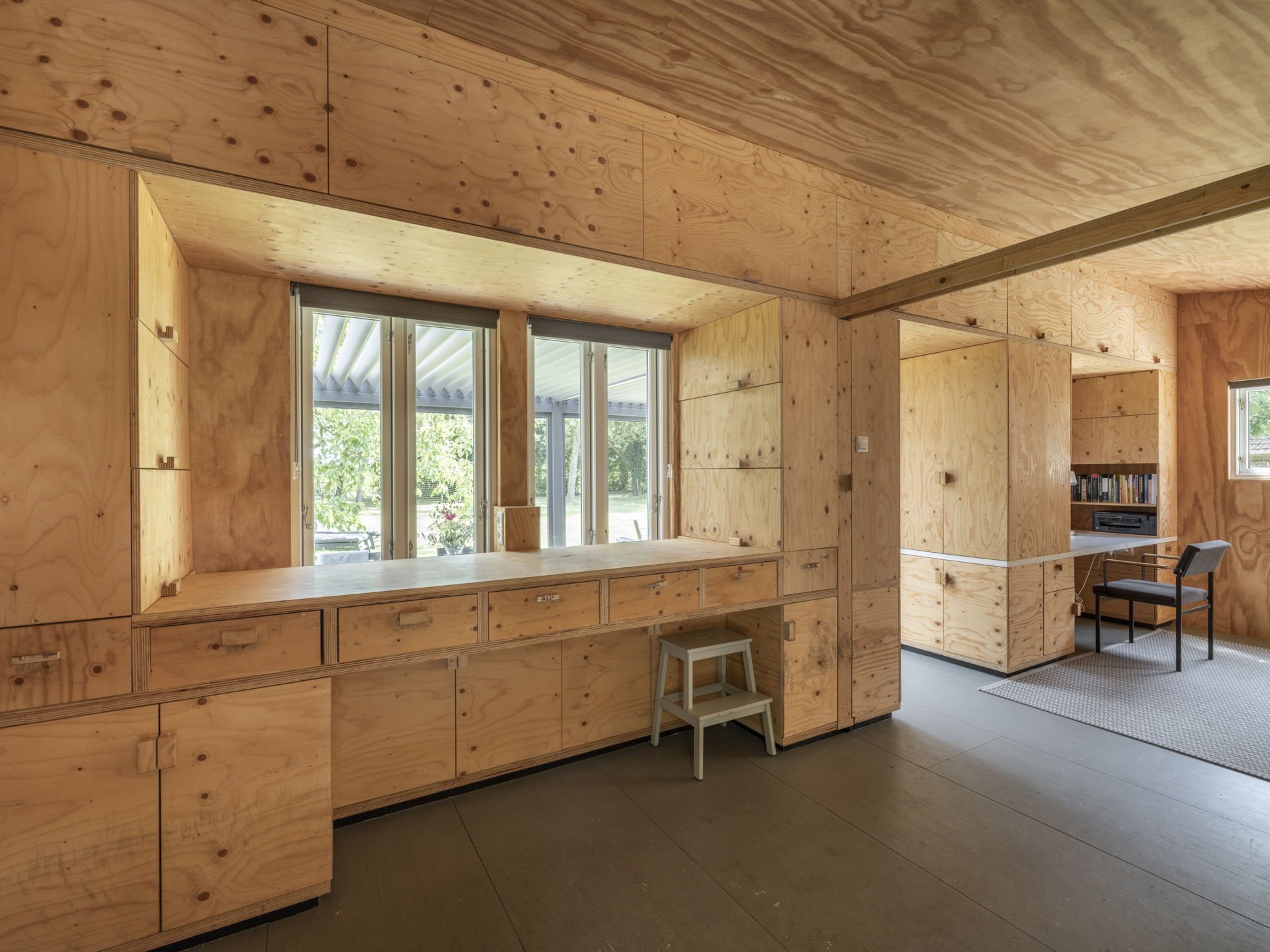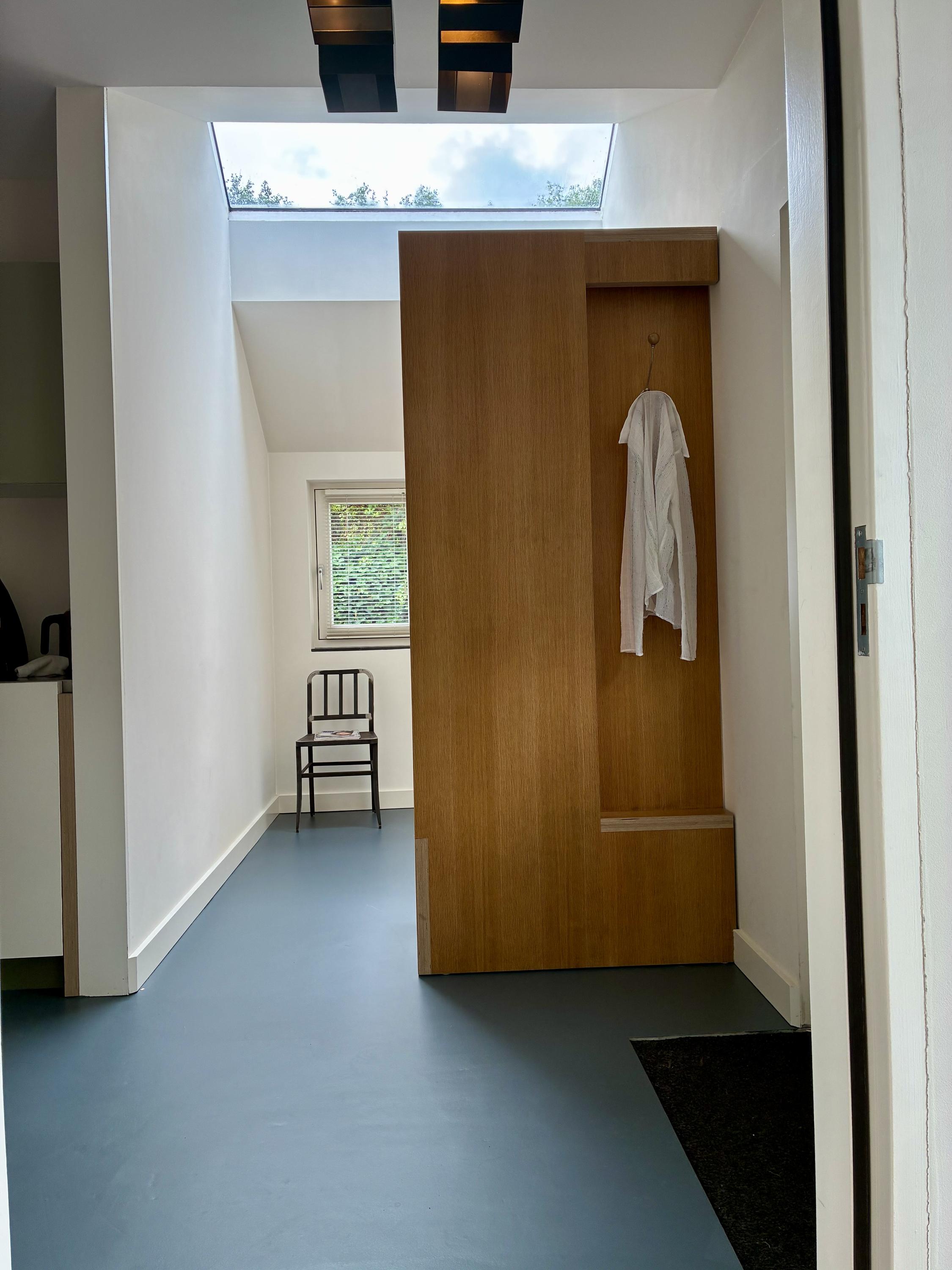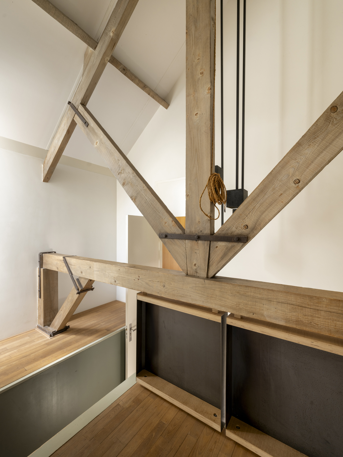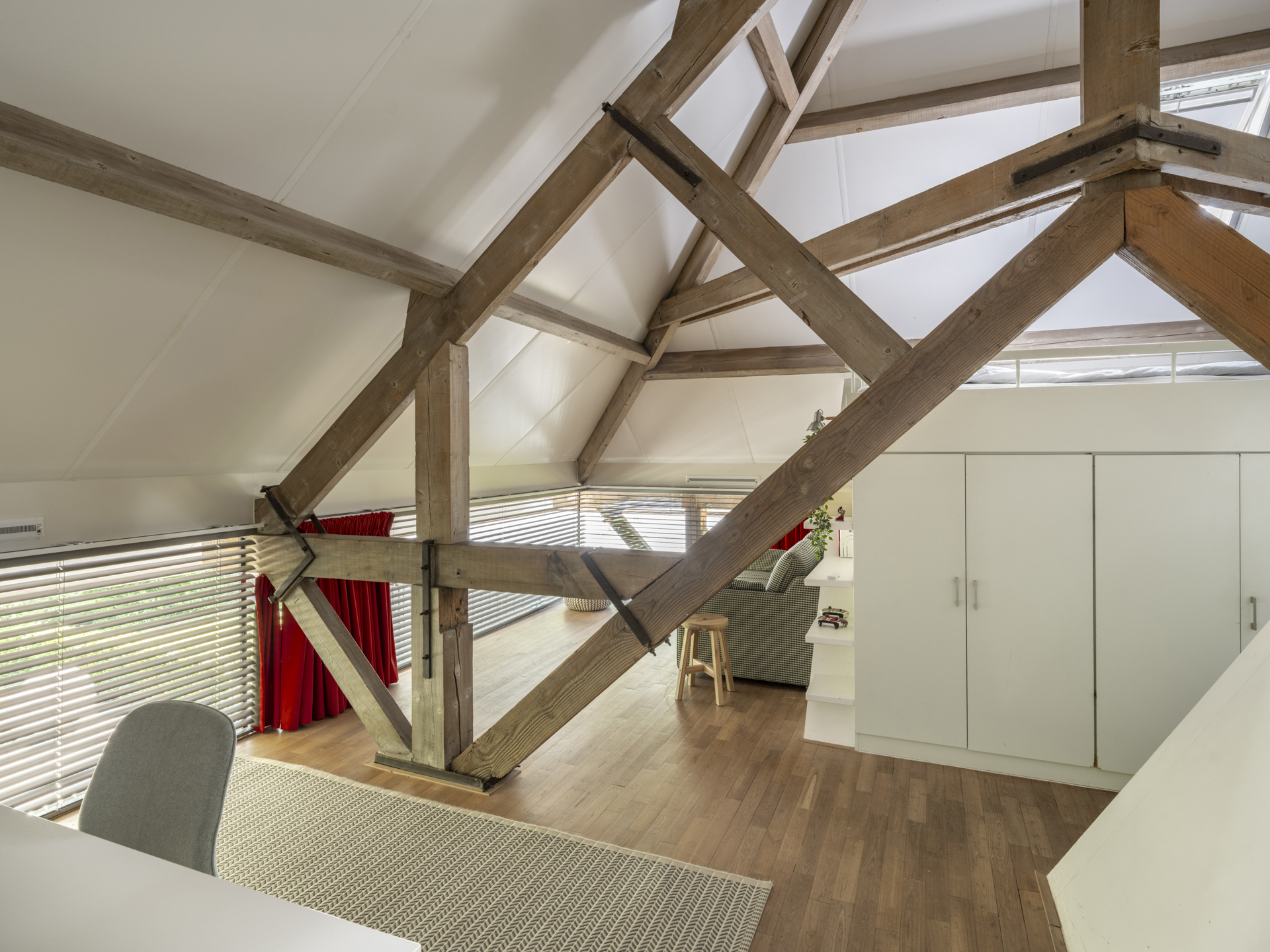 ), the conversion into a modern residence has been executed with exceptional attention to detail and natural light. The original character of the barn has been preserved, while it has simultaneously been transformed into a comfortable, contemporary home. Tapered light shafts connect the ground floor spaces with the roof, positioned in such a way that the existing structural framework and beams remain a visible and integral part of the house.