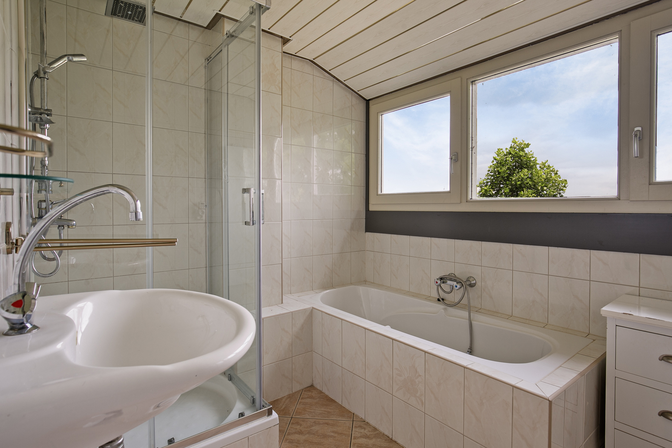 This part of the house is arranged on the 1st floor with 3 bedrooms and the bathroom. On the landing, there is a closet with sliding doors. The bedrooms have laminate flooring, stucco walls and a plasterboard ceiling. Two bedrooms enjoy plenty of light through windows in the facade and the third bedroom is equipped with a skylight. The fully tiled bathroom is equipped with a bathtub, a separate shower and a sink. A dormer window provides plenty of extra space and light.