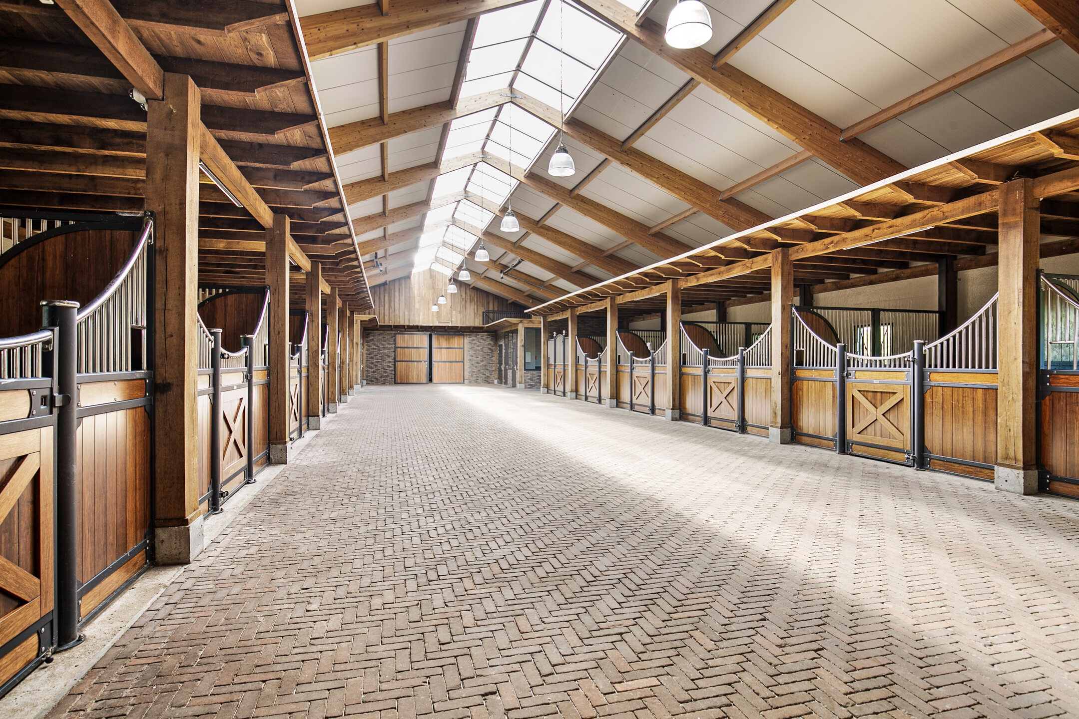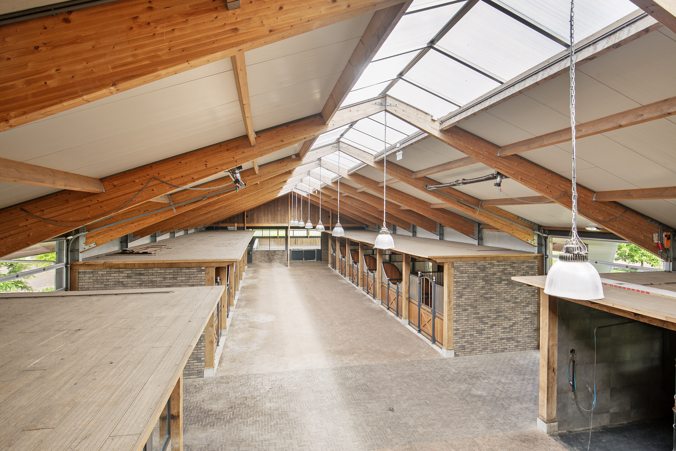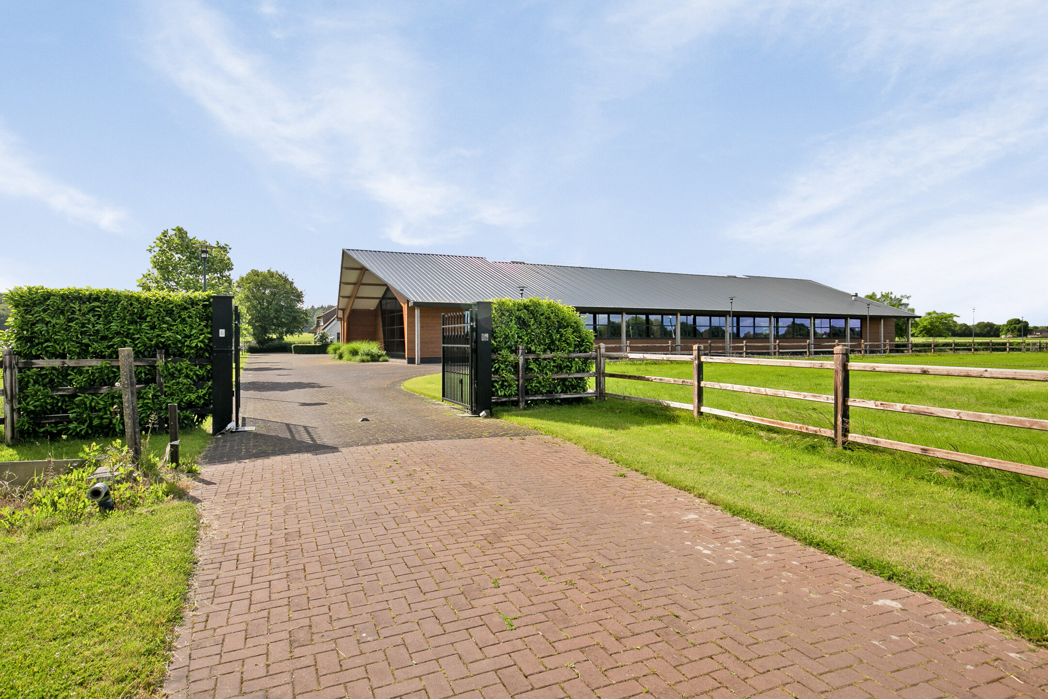 The luxurious reception area offers a beautiful view over the indoor arena through large windows, as well as over the outdoor area with the outdoor arena, lunging circle, horse walker and paddocks. A complete overview! The reception area is accessible from the outdoor arena from the elevated terrace and equipped with a tiled floor with underfloor heating and furnished with a complete bar and a gas fireplace. The bar is equipped with a sink, a dishwasher, coffee machine, combination oven/microwave and a wine fridge. The large exterior windows have electrically operated screens and the acoustic ceiling has recessed lighting. From the reception area, there is direct access to the riding hall with indoor arena. The arena measures approx. 20x40 metres and is fitted with fine wooden rafters and a hardwood arena surround. This arena edge fence can be opened automatically from the stable area, giving direct access to the arena. There is an Equisport ebb and flow floor. The entire end wall consists of imposing windows and the side wall also has plenty of windows. The insulated roof is also equipped with a wide skylight in the ridge. A portal connects the indoor arena and reception area with a toilet room and the multi-purpose room on the 1st floor. The porch has a tiled floor, stucco walls and a stucco ceiling. There is a fixed sink with a cabinet and a storage cupboard offers plenty of storage space. The fully tiled toilet room is equipped with a floating toilet and urinal. The multi-purpose room on the first floor is finished with a PVC floor, stucco walls and a ceiling of insulation panels. Here, too, room-high windows in the rear façade offer a nice view of the outdoor arena, paddocks and other facilities. Next to the indoor arena is a spacious technical room. This is where the sprinkler system, the ebb and flow system, the central heating combi boilers, the unit for the solar panels and the floor heating, as well as the meter cupboard are located.The beautifully finished stable area exudes ambiance and warmth due to the frequent use of wood. The stable is equipped with 12 horse stalls, 2 washing rooms, a tack room, canteen, a laundry room and a toilet room. At the rear of the stable area is a large storage and stabling area, where there are also 2 rearing stalls and a fixed staircase provides access to the attic and mezzanine above the stalls. The horse boxes (approx. 3.50x3.50 m) are fitted with partly hardwood, partly stainless steel and partly powder-coated and lowered front walls with hinged doors. All stalls have an outside hatch. The washing areas are finished with a rubber floor and fully tiled walls. There is also a solarium.The stable area has a floor of baked bricks, wooden rafters and an insulated roof. A large skylight has been installed in the ridge of the roof. Large, translucent roller doors provide access to the surrounding yard. The tack room is furnished with custom-made cupboards, saddle supports and a sink. The room is finished with a tiled floor and panelled walls. The canteen has a tiled floor, wallpapered walls and a wooden beam ceiling. The canteen has kitchen equipment, which is equipped with a sink, fridge and dishwasher. The partly tiled toilet room is equipped with a floating toilet and a hand basin. The laundry room has connections for washing equipment and the installation of the solar panels. The room is finished with a tiled floor. The storage and stabling area is accessible from the stable area through sliding doors and also offers space for 2 rearing stables. A fixed staircase provides access to the attic space and mezzanine on the 1st floor. The rearing stables are equipped with partly hardwood, partly galvanised front and partition walls. The loft area is equipped with fixed cupboards with plenty of storage space and the flybuster system. The attic is finished with a wooden floor.