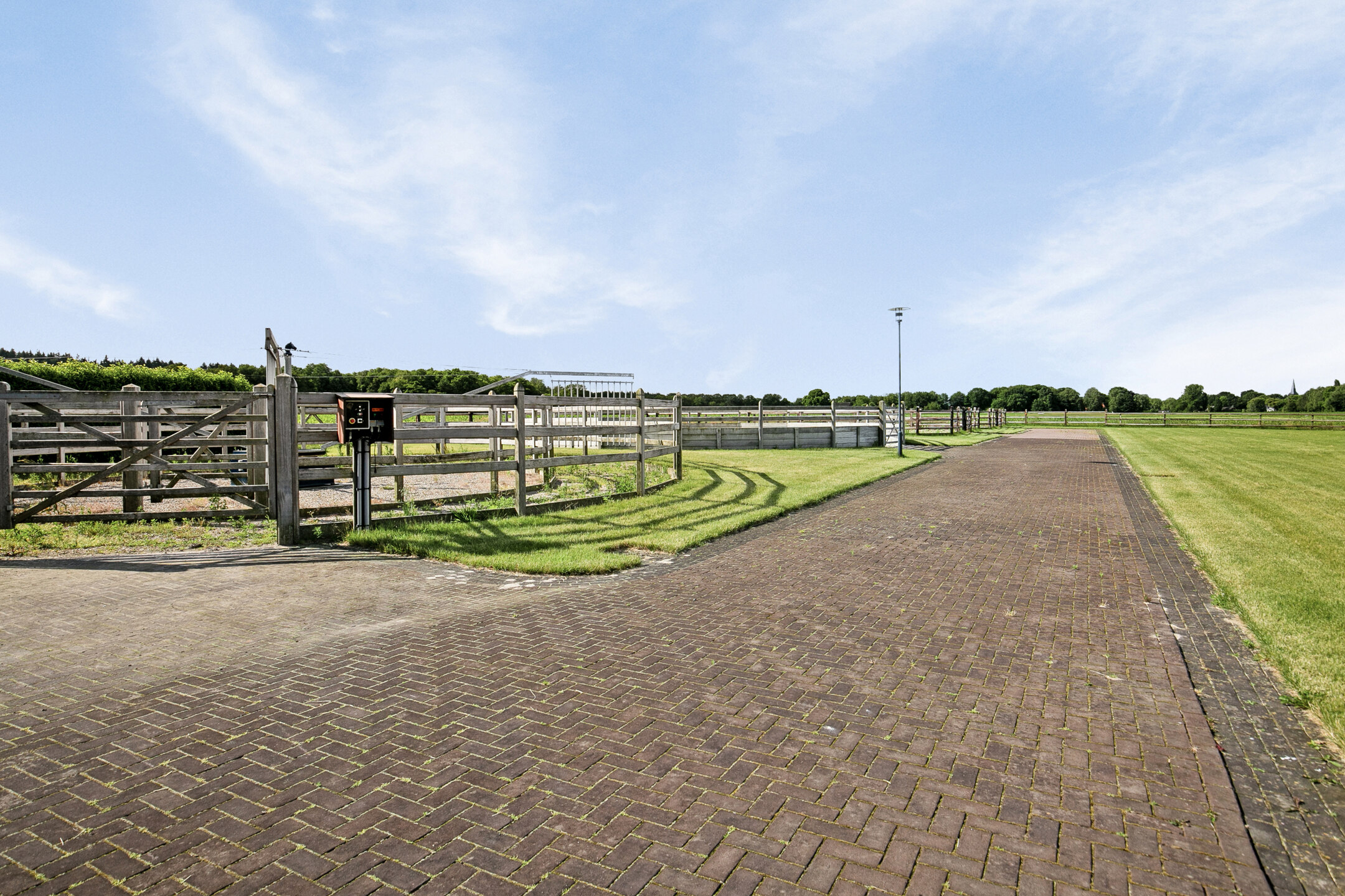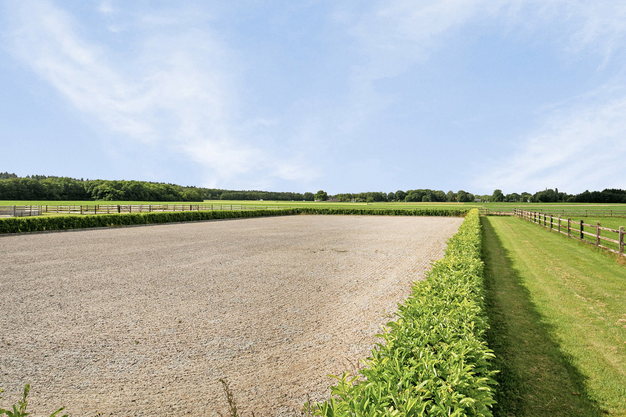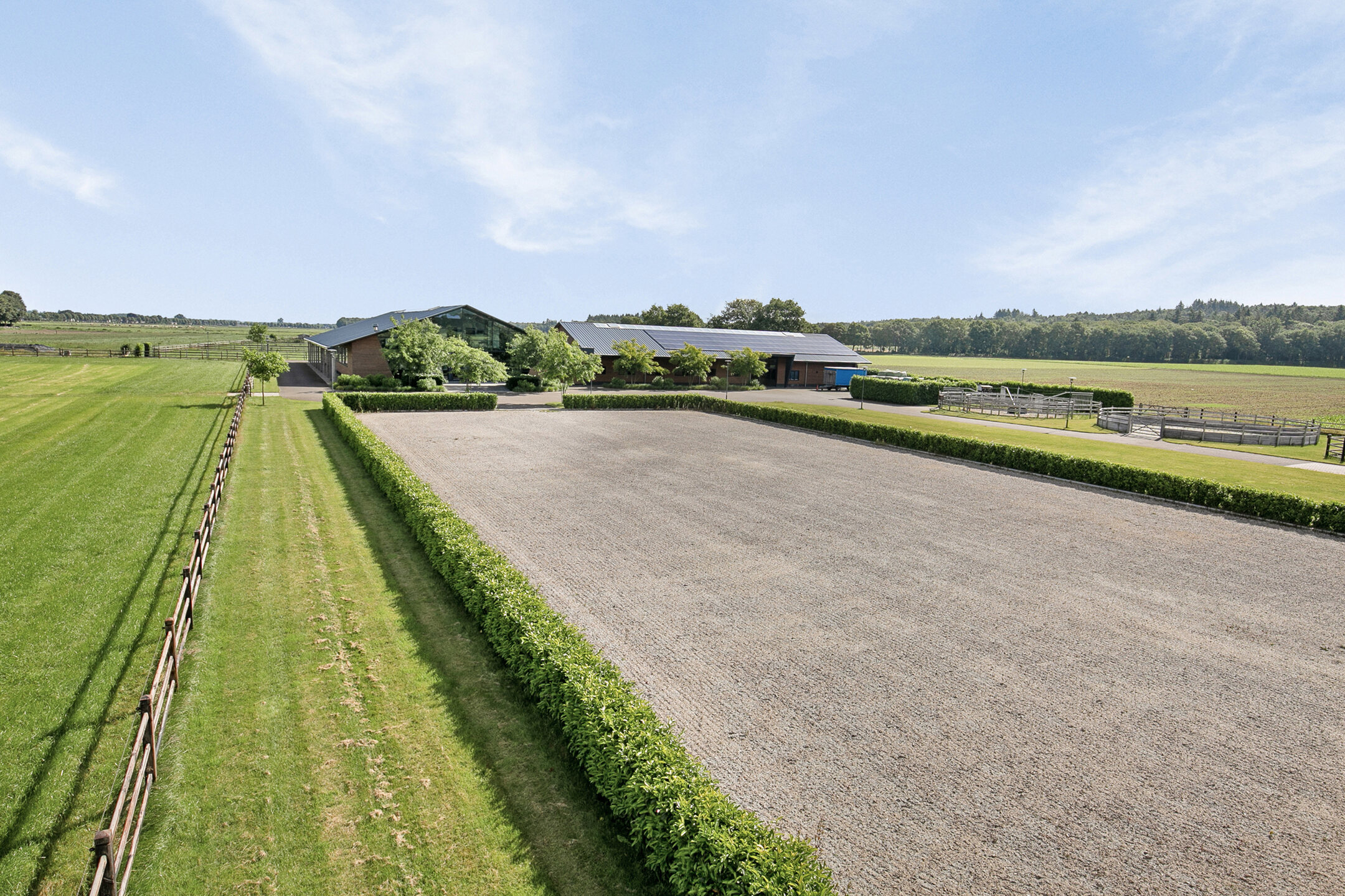 The outside grounds at the rear of the property are equipped with an outdoor arena, a horse walker, a lunging circle, manure pit and paddocks. The entire yard is paved with baked clinkers. The outdoor arena measures approx. 30x60 metres and has an Equisport ebb and flow riding surface. The arena is fenced off with a beech hedge. The horse walker is suitable for 4 horses and has a wooden fence. The sandy soil is mixed with flakes. The lunging circle is equipped with an ebb and flow riding surface and a wooden fence. There are 2 paddocks, which are equipped with a drained sandy soil and a wooden fence. Pastures are located around the accommodation and fenced with wood. Extension of pasture land is possible by buying or leasing neighbouring plots.
