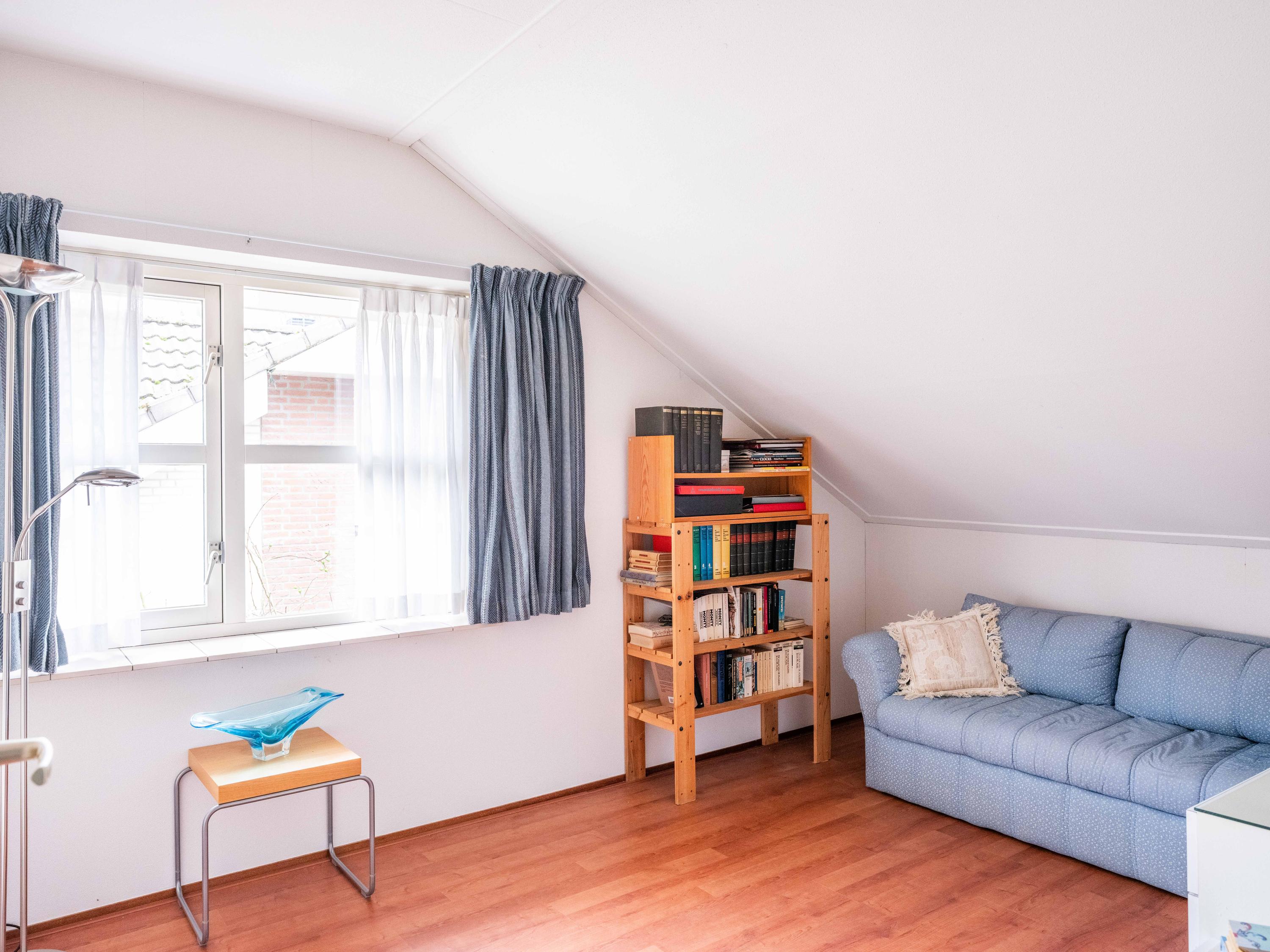 On the ground floor, you will also find a spacious room on the garden side, which can be used as an office, but is also ideal as a bedroom. The bathroom on the ground floor has a bathtub with shower, double sink, and toilet.