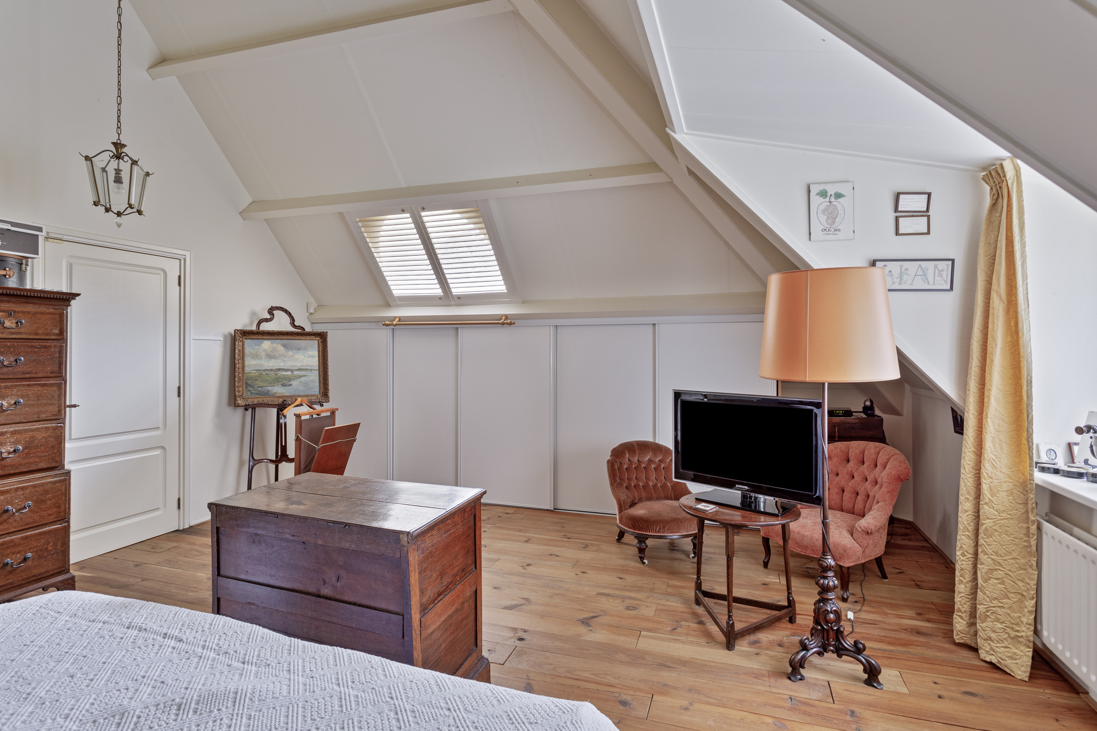 hoofdslaapkamer voorzijde (ca. 29 m²) met inbouwschuifkasten en een dakkapel, wandafwerking stucwerk, grenen planken vloer, dakbeschot in het zicht;