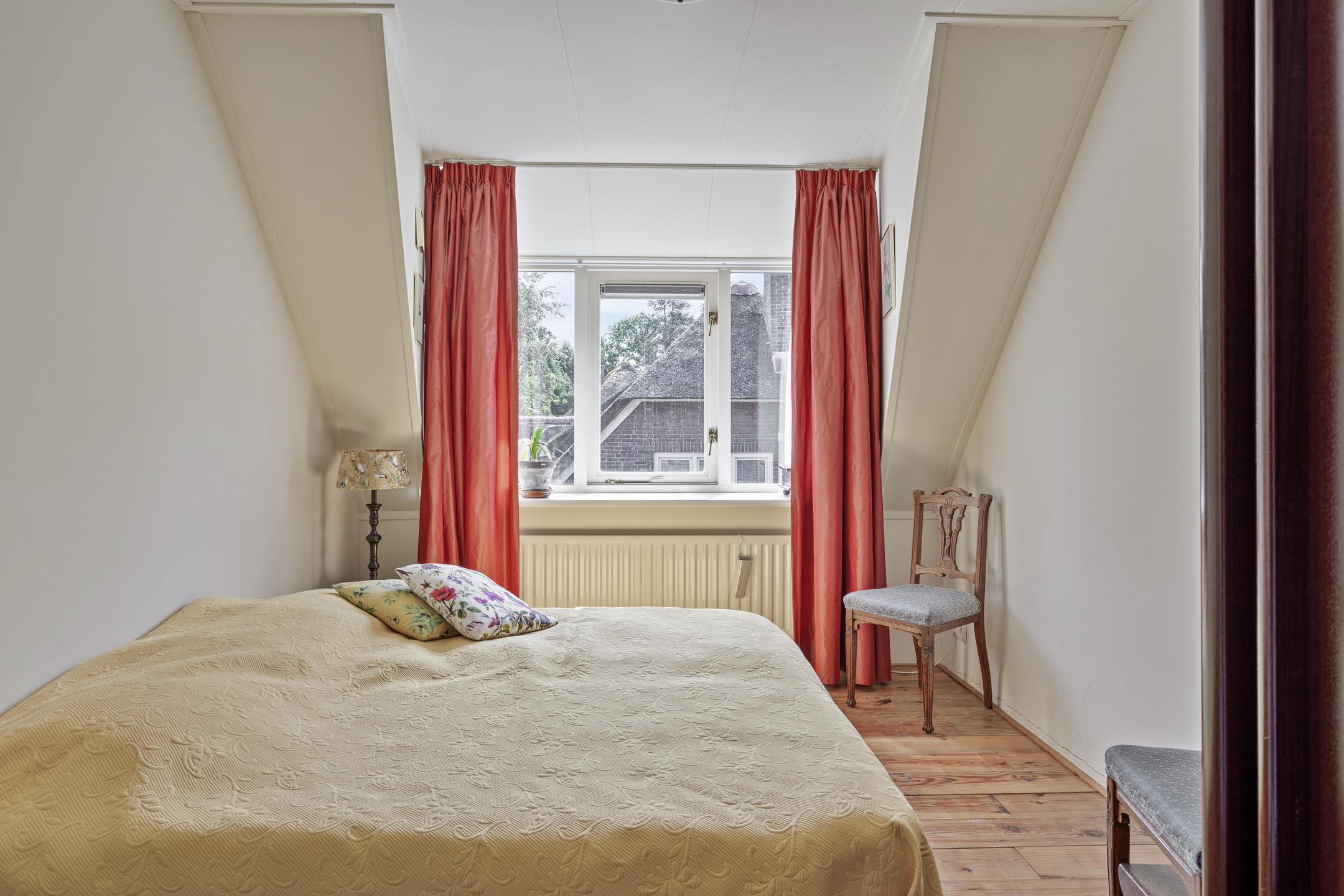 slaapkamer rechtsachter, met een inbouwkast en een dakkapel, wandafwerking structuurverf, grenen planken vloer, plafond afgewerkt met gipsplaten;