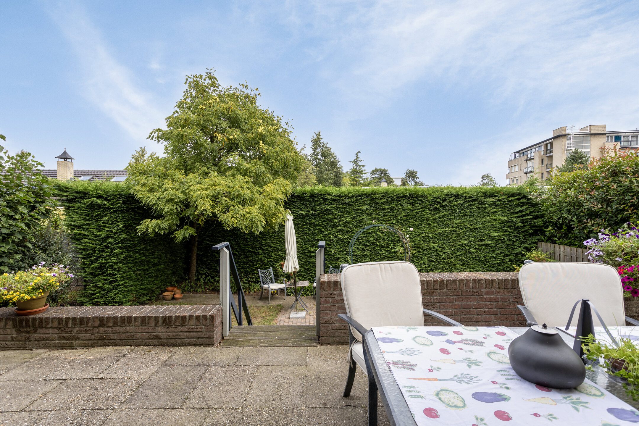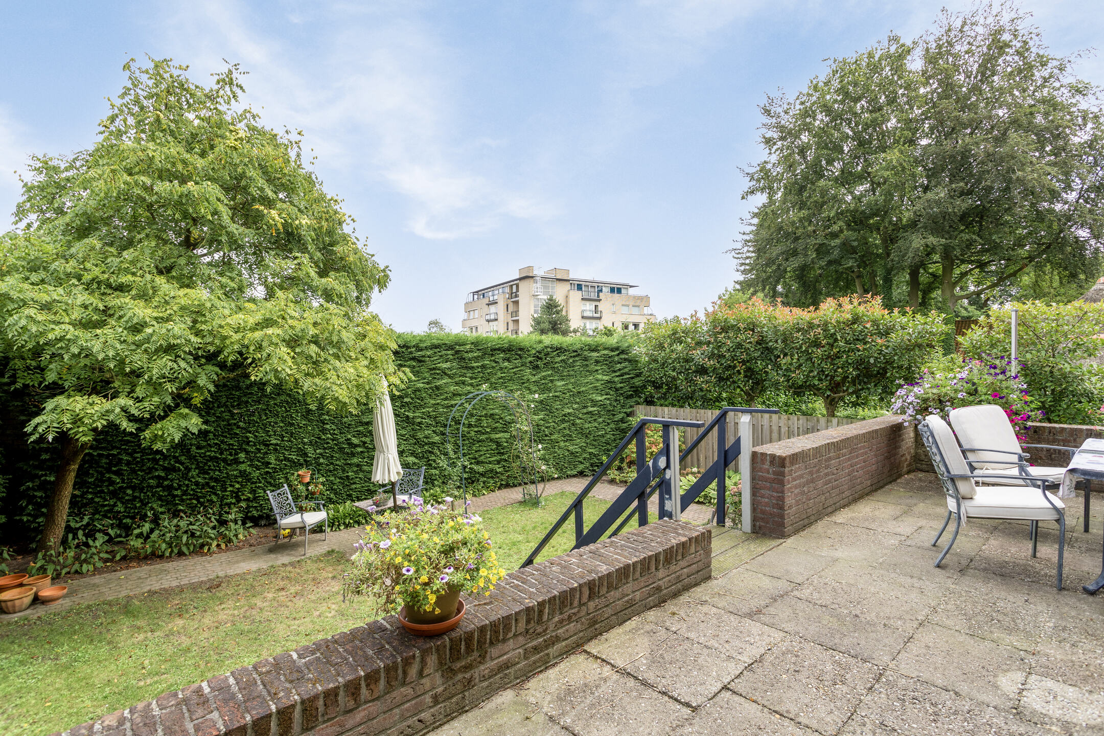 De tuin is beschut gelegen waarbij direct aansluitend achter de woonkamer een terras aanwezig is voor de gezellige uren. Via een trap bereikt u het groene deel van de tuin welke volledig omheind is en waar vandaan u de woning rondom kan bereiken. Het geheel is groen omheind en aan de voorzijde voorzien van een elektrische poort en deurbelinstallatie.