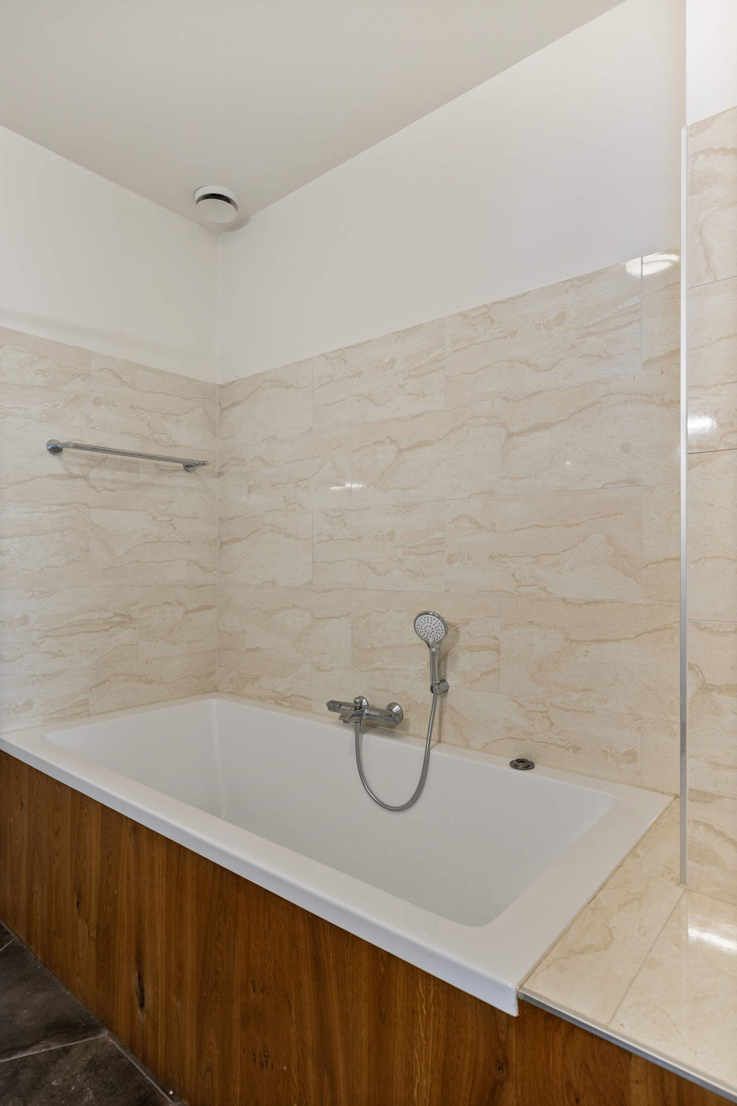 The modern bathroom is equipped with a walk-in shower, washbasin with vanity unit, and bathtub.