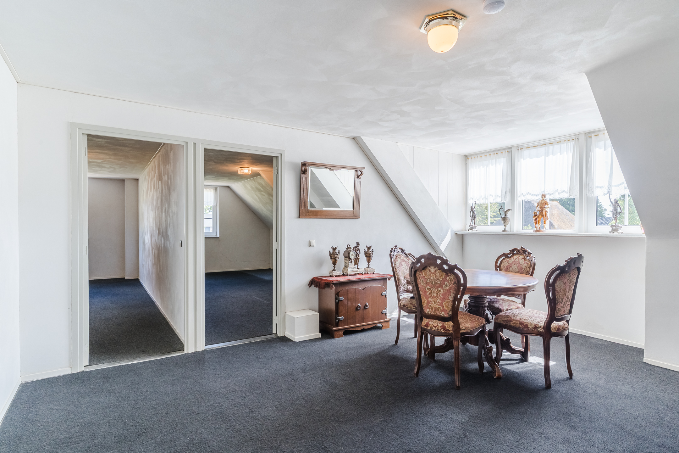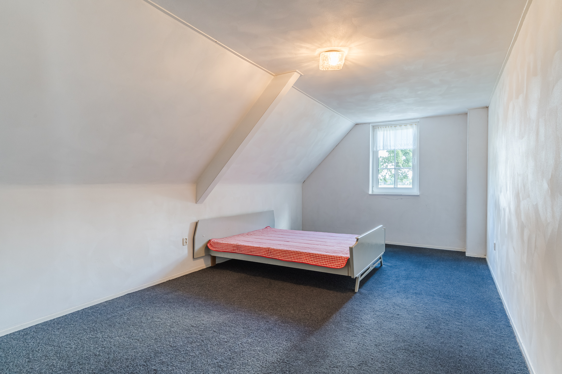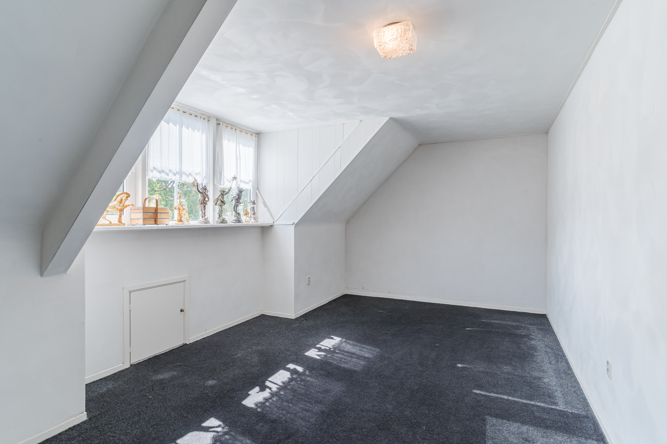 Approx. 34.5 m², carpet flooring, plastered walls and ceiling, with dormer window. Access to 3 bedrooms, storage room and unfinished bathroom.
