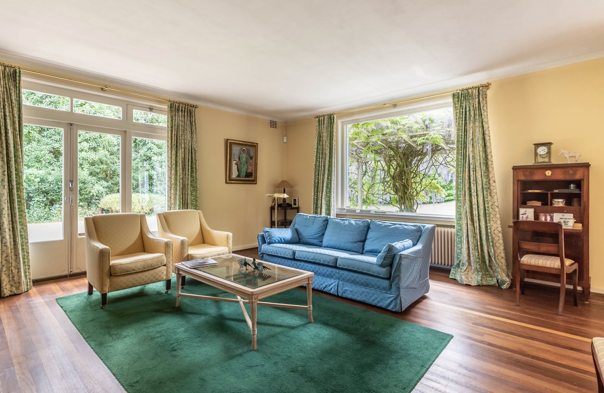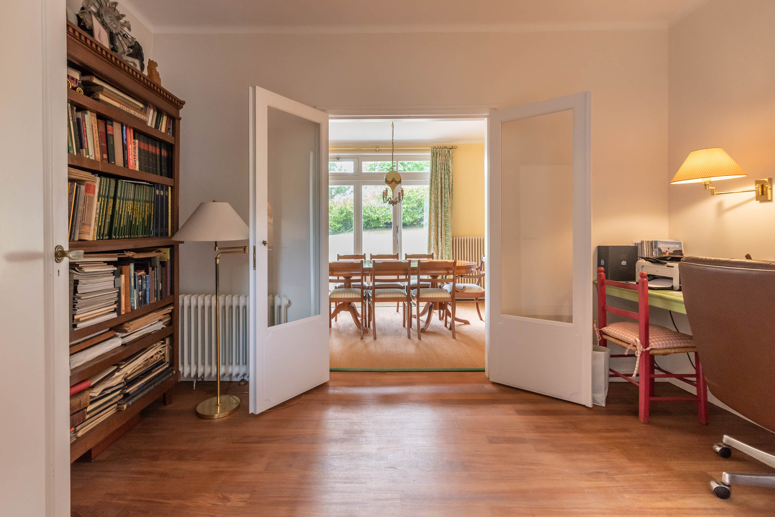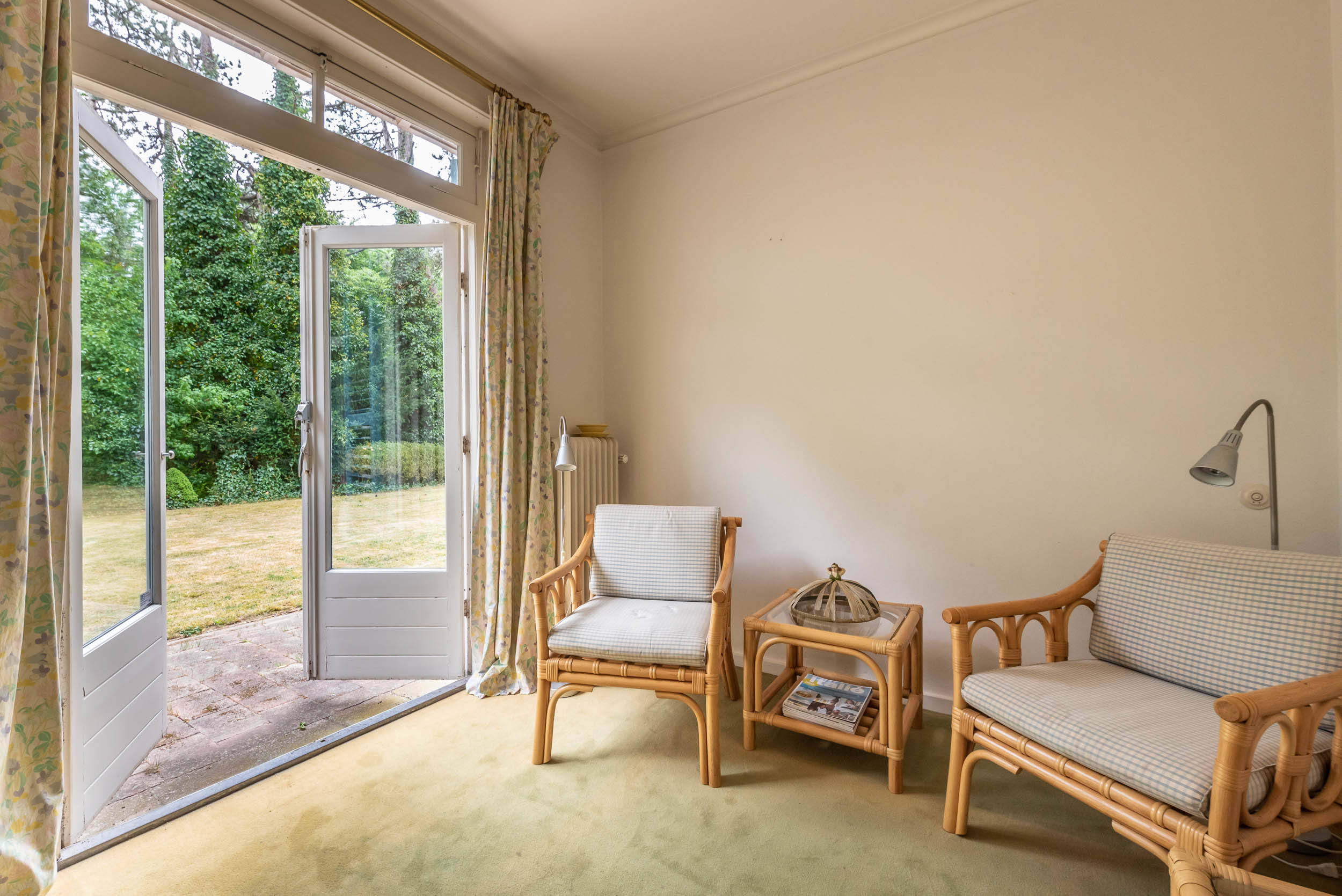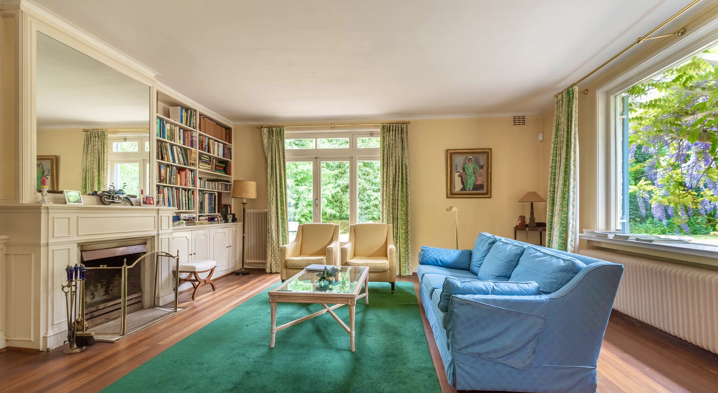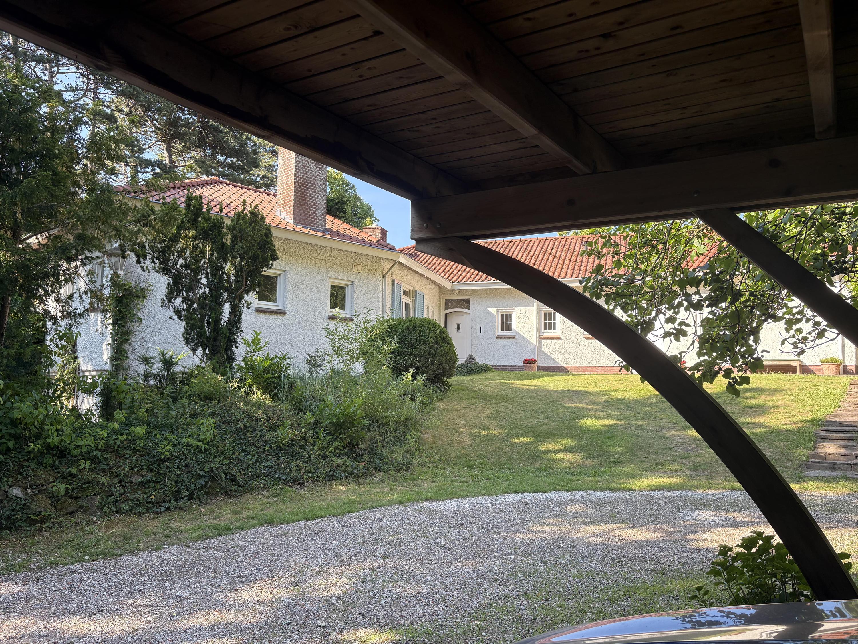 A sweeping driveway leads to a double carport with round point and ample parking, complemented by an indoor garage. The living area of 221 m² is arranged in both the original 1953 house and a 2001 extension, maintaining architectural continuity throughout. Interiors are composed for comfort: airy rooms are connected by French doors to the unusually varied and sunlit garden. The main living spaces blend parquet and terrazzo flooring, open fireplaces, and bespoke built-ins, shaping an atmosphere of understated warmth.