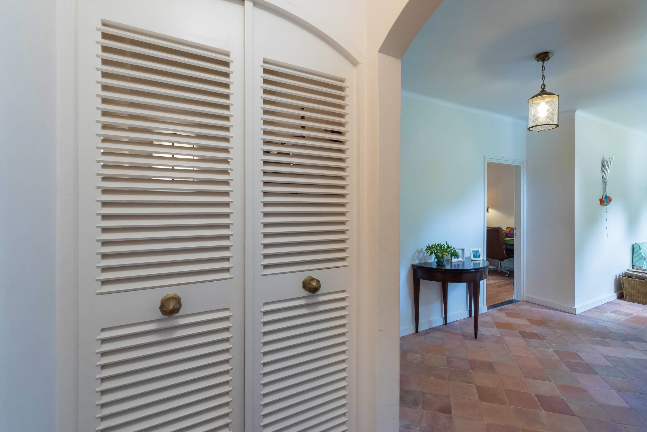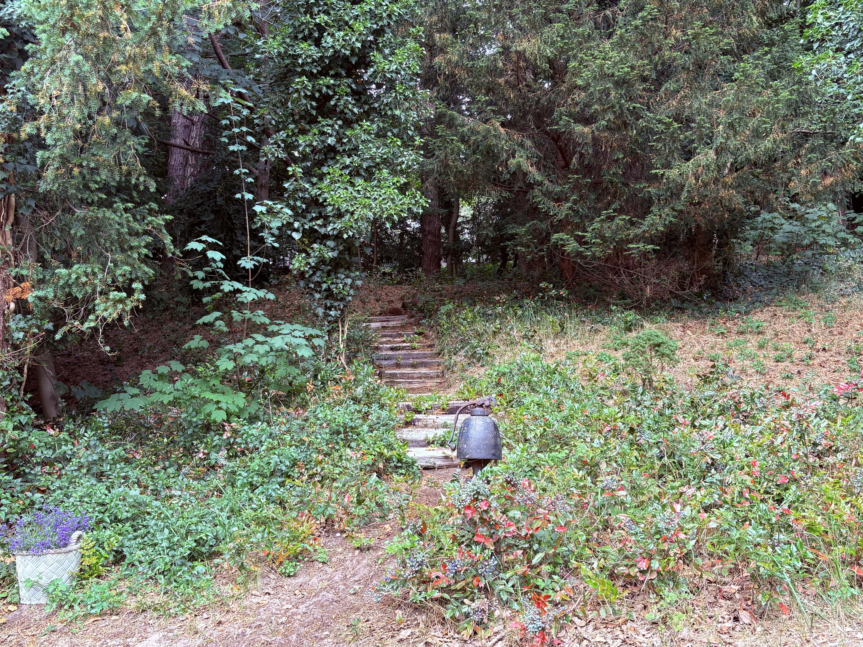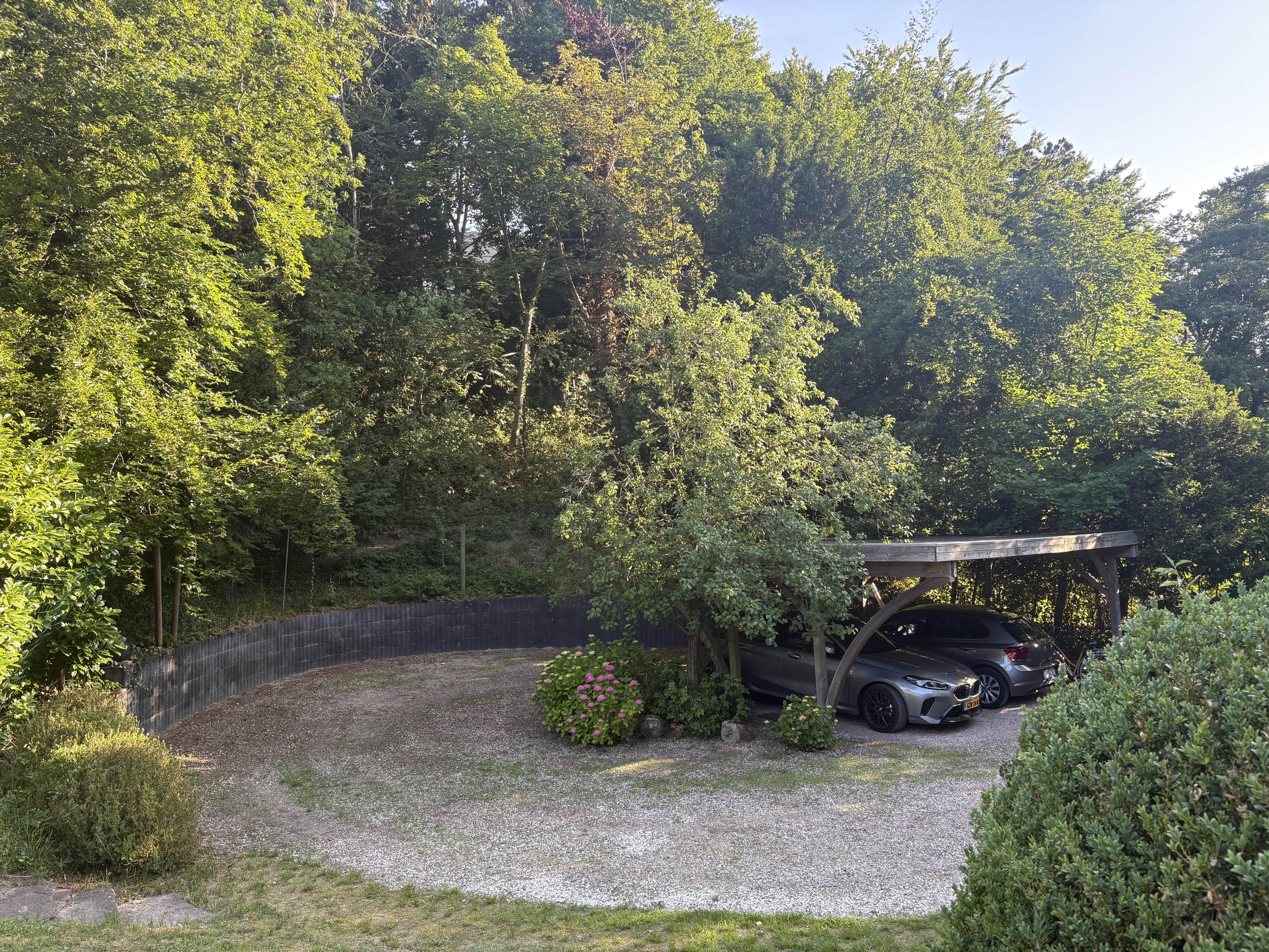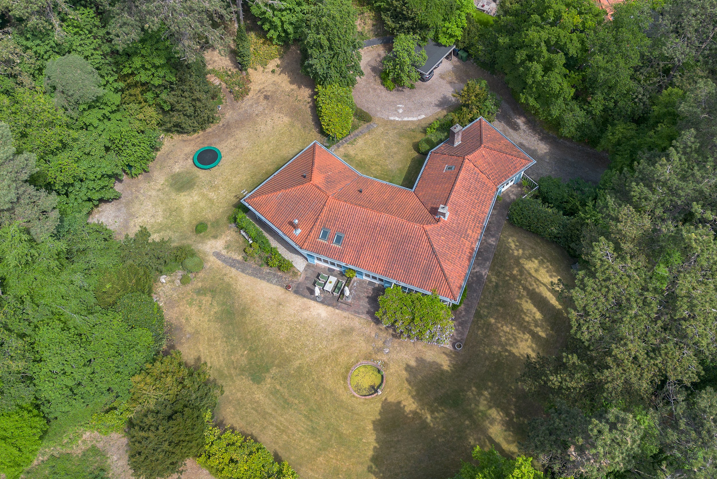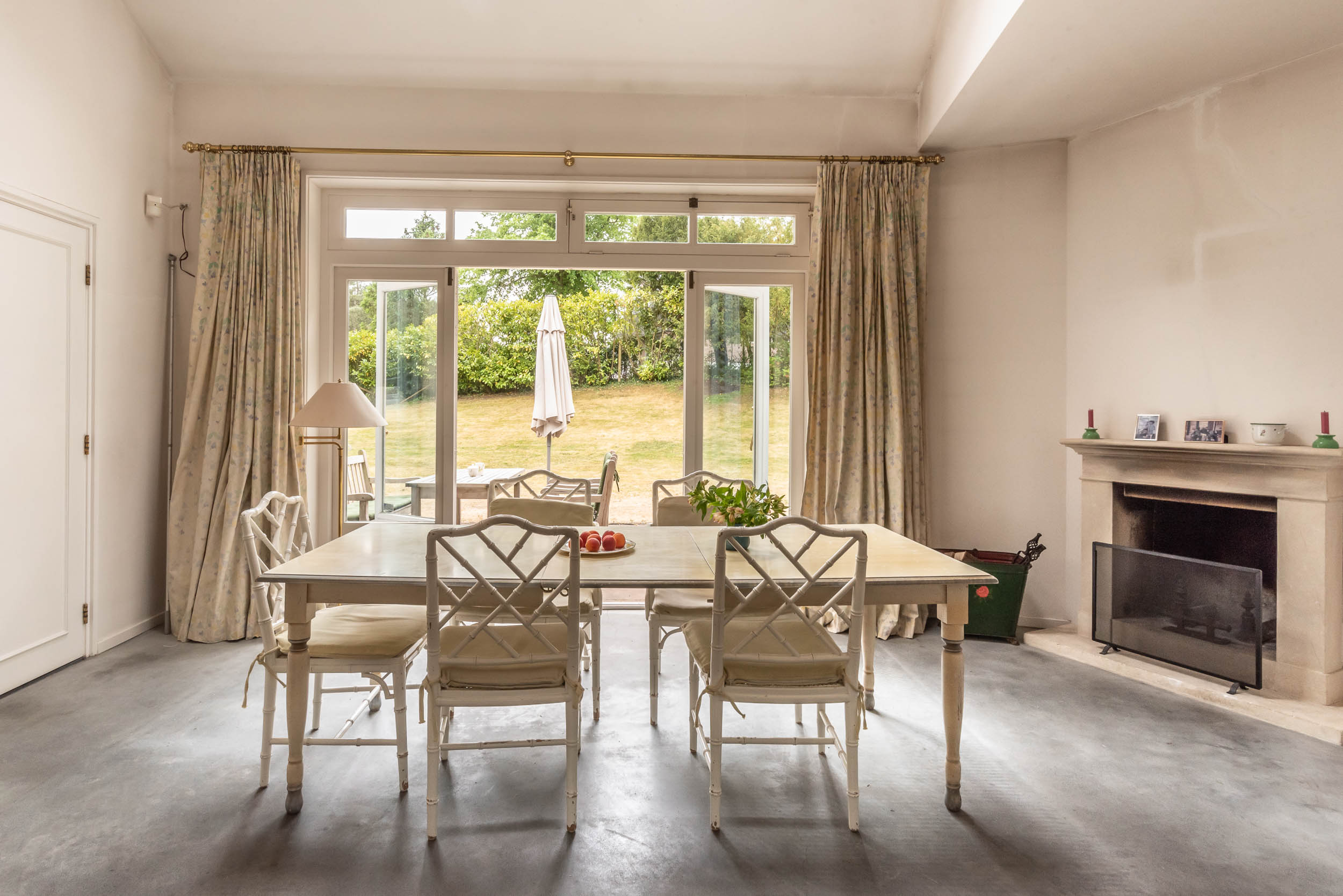A sweeping driveway leads to a double carport with round point and ample parking, complemented by an indoor garage. The living area of 221 m² is arranged in both the original 1953 house and a 2001 extension, maintaining architectural continuity throughout. Interiors are composed for comfort: airy rooms are connected by French doors to the unusually varied and sunlit garden. The main living spaces blend parquet and terrazzo flooring, open fireplaces, and bespoke built-ins, shaping an atmosphere of understated warmth.
