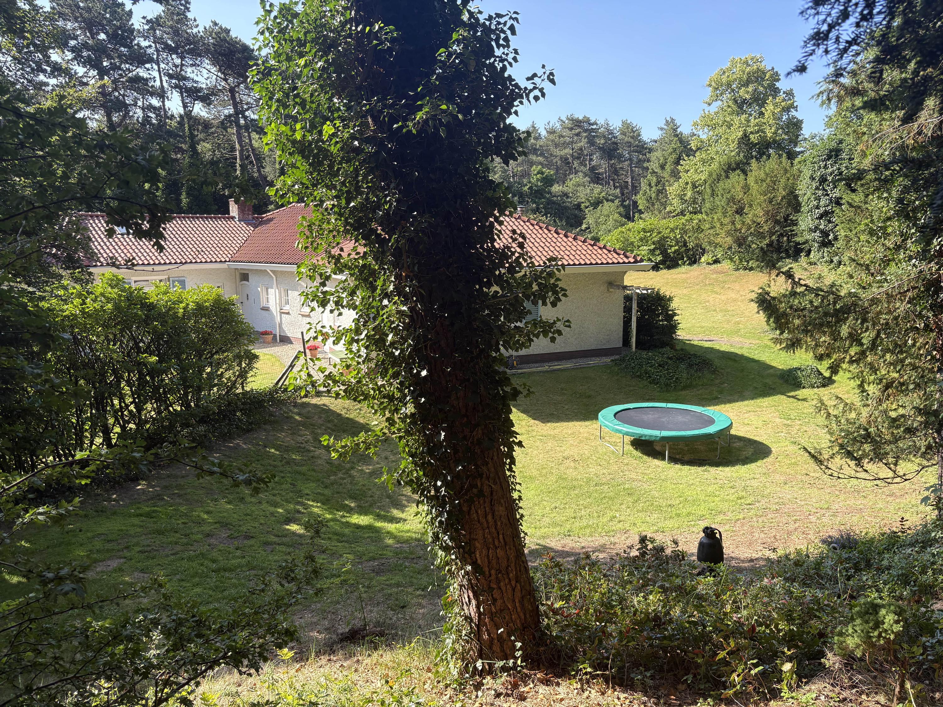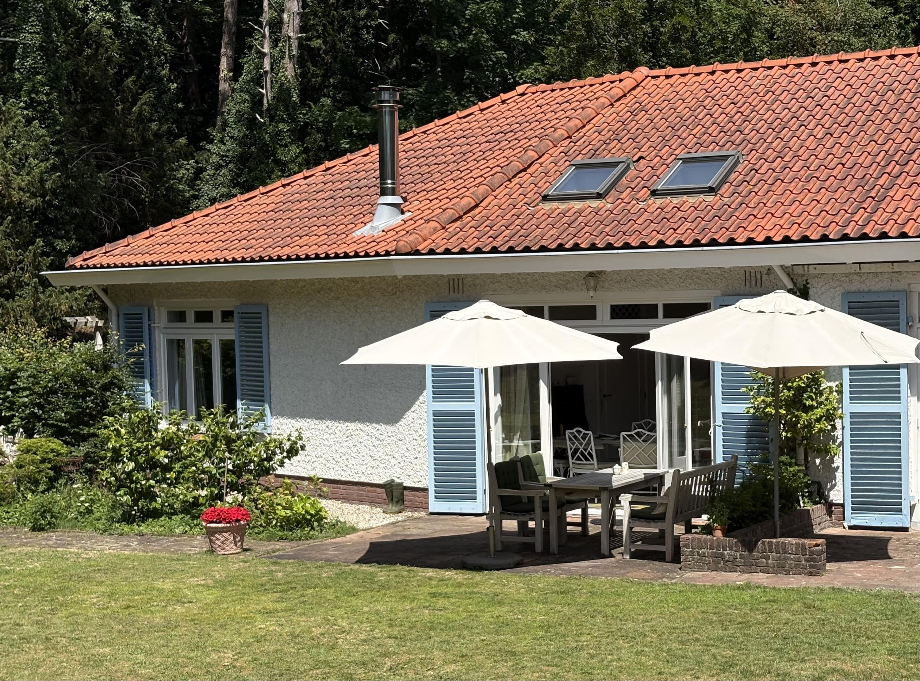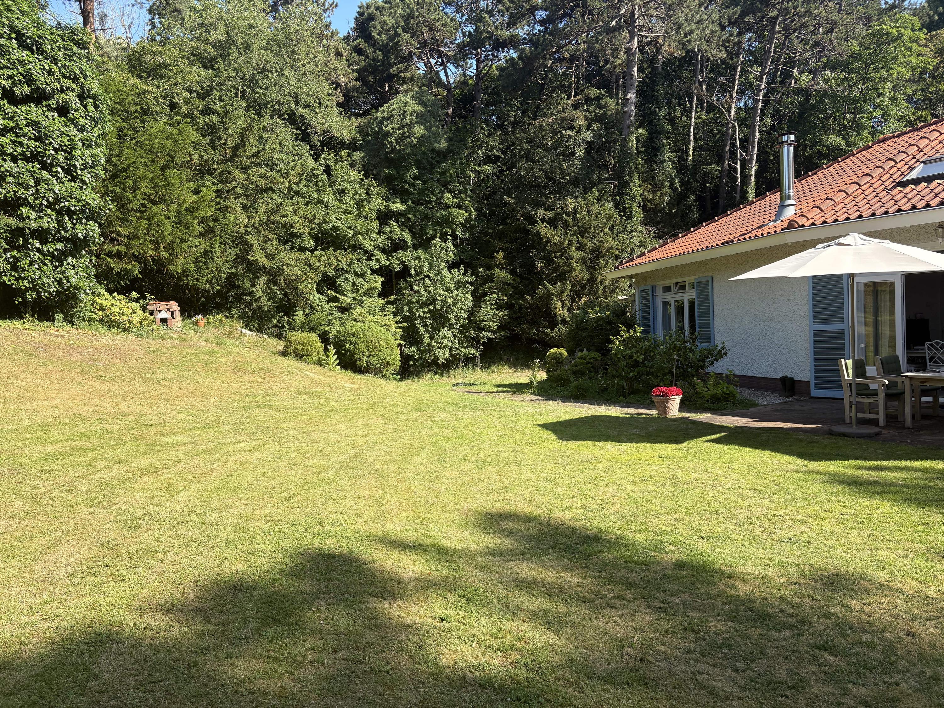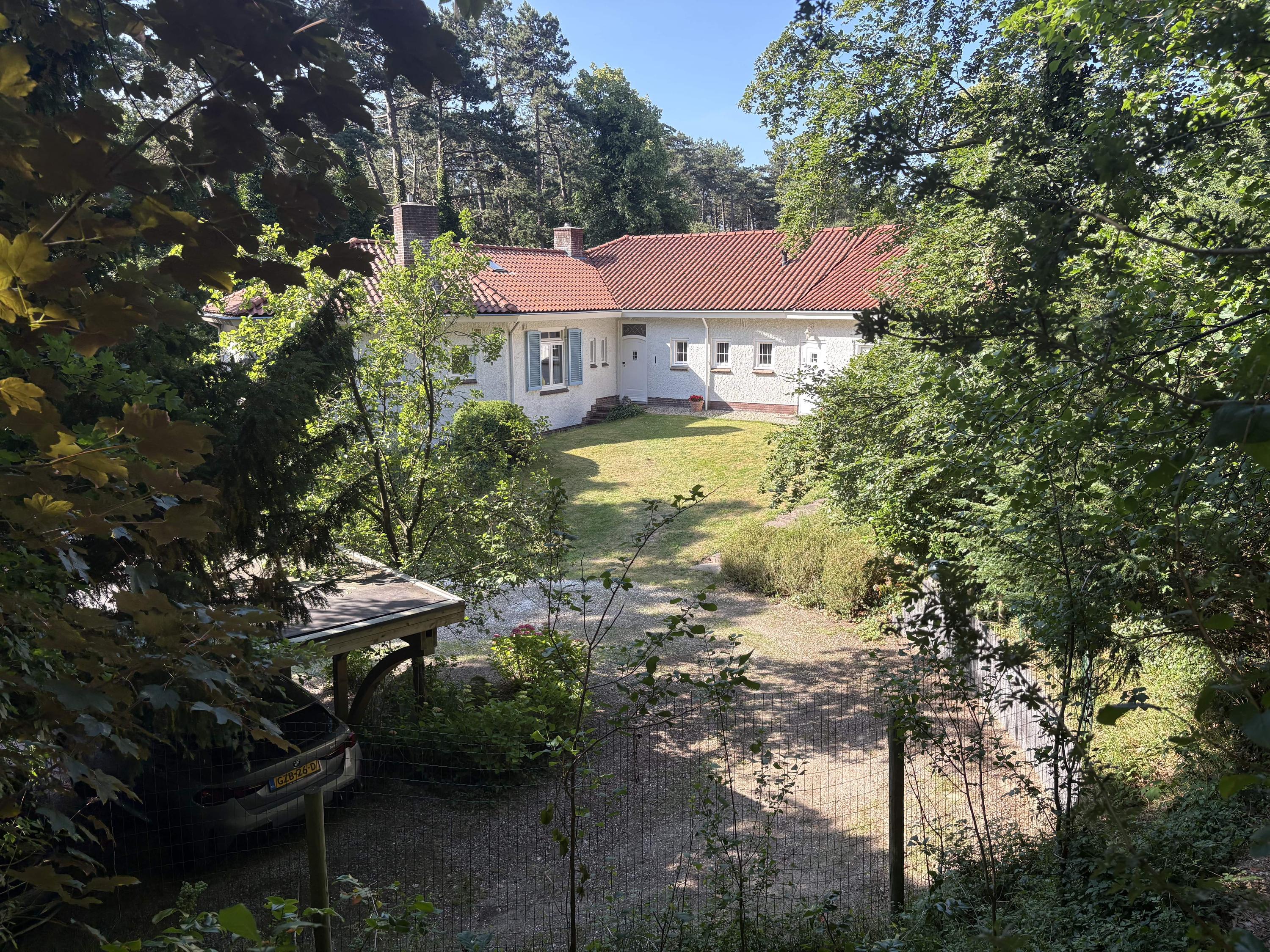 Detached villa Bloemendaal offers a refined architectural presence within the sought-after Duin en Daal villa park. Designed by H.W. van Kempen, this property evokes Mediterranean lightness with its subtle blue Louvre shutters, hipped roof, and the authentic character of French tiles in the hallway. Set on a substantial 4420 m² private plot, the house is surrounded by mature trees and elevated above the road, providing optimal privacy.