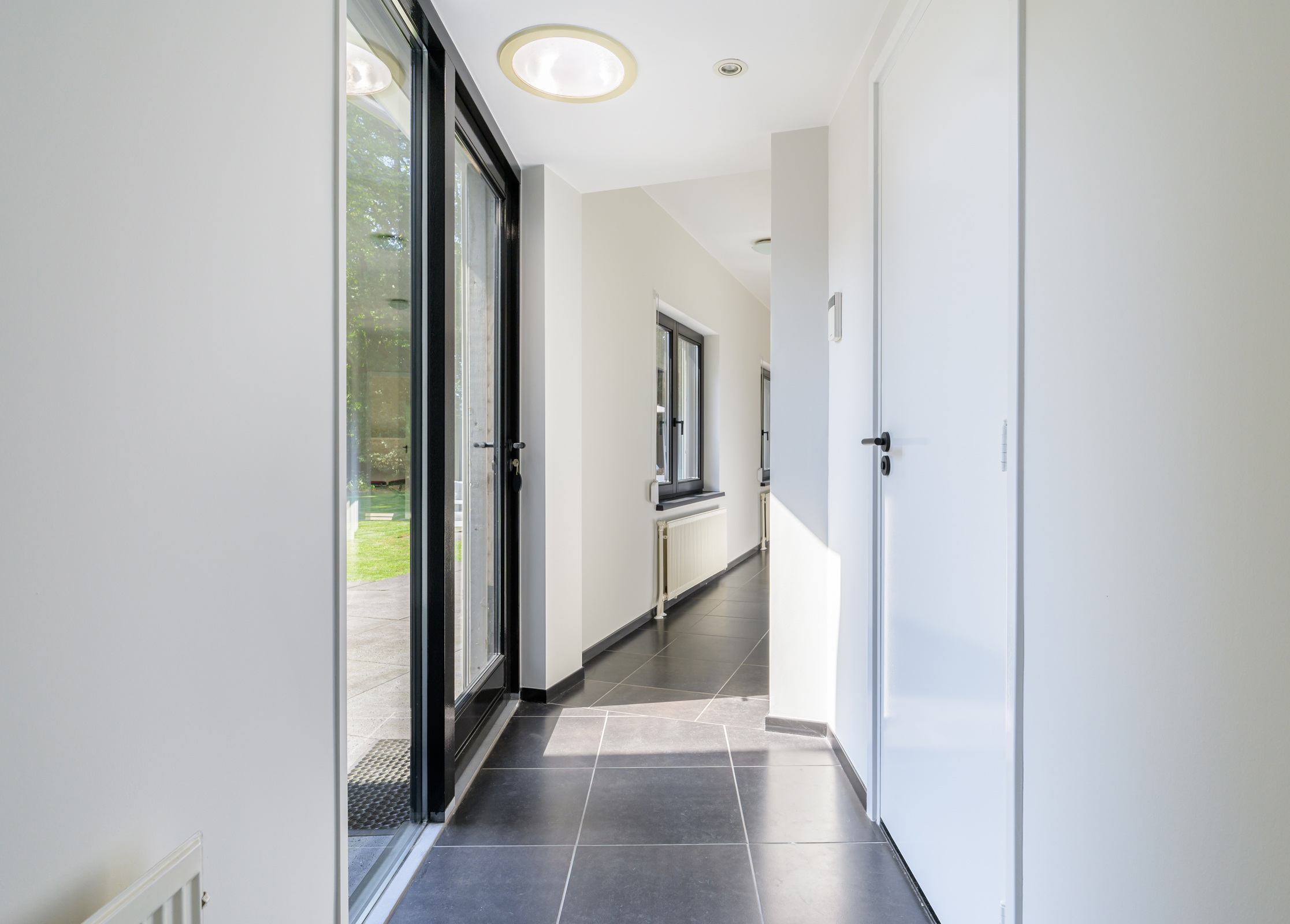 You enter the house through the spacious entrance, which features a slate tile floor. In the hall, you will find the meter cupboard (16 groups + 2 residual current circuit breakers and provisions for an electric car) and the wardrobe.