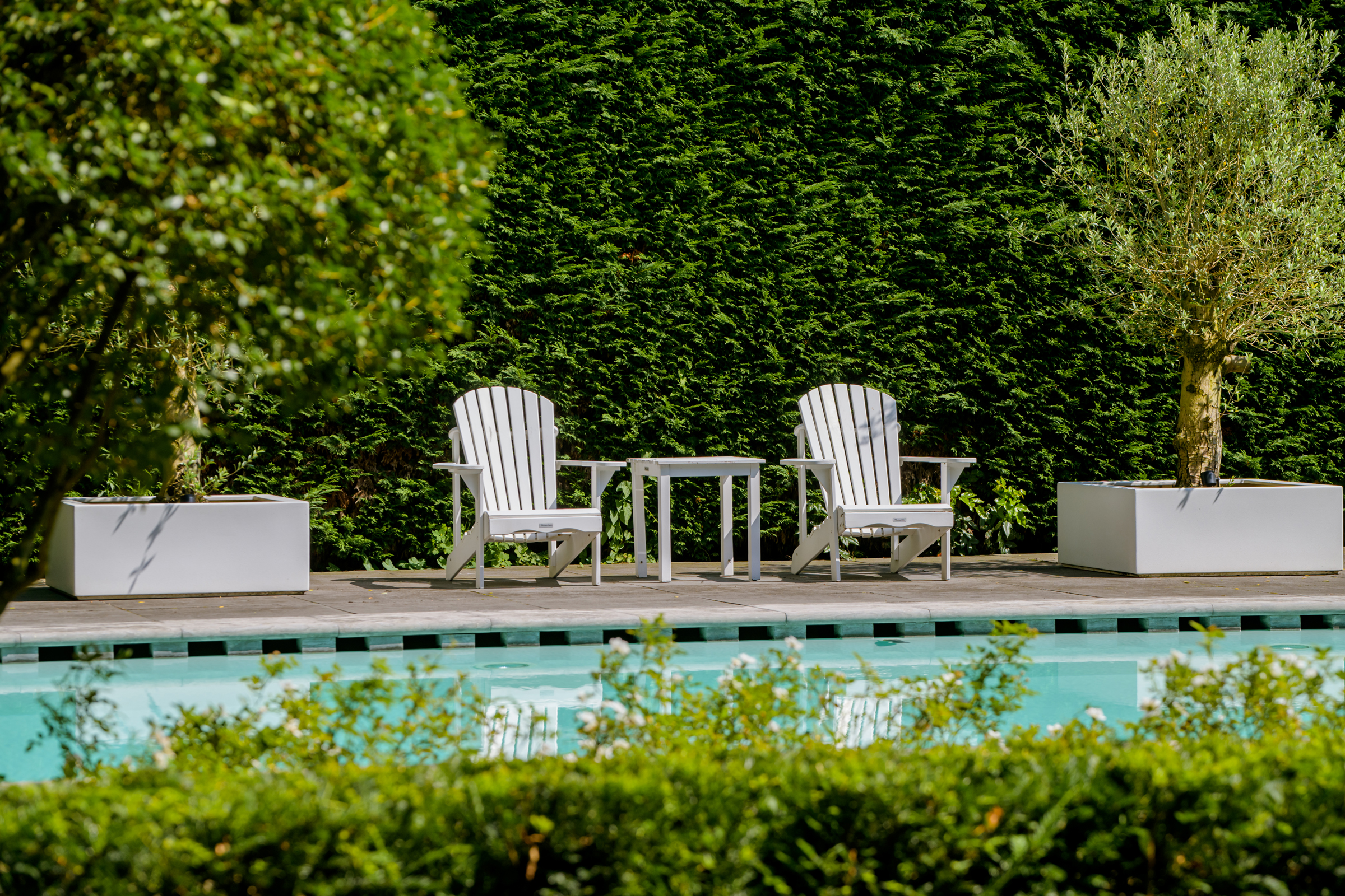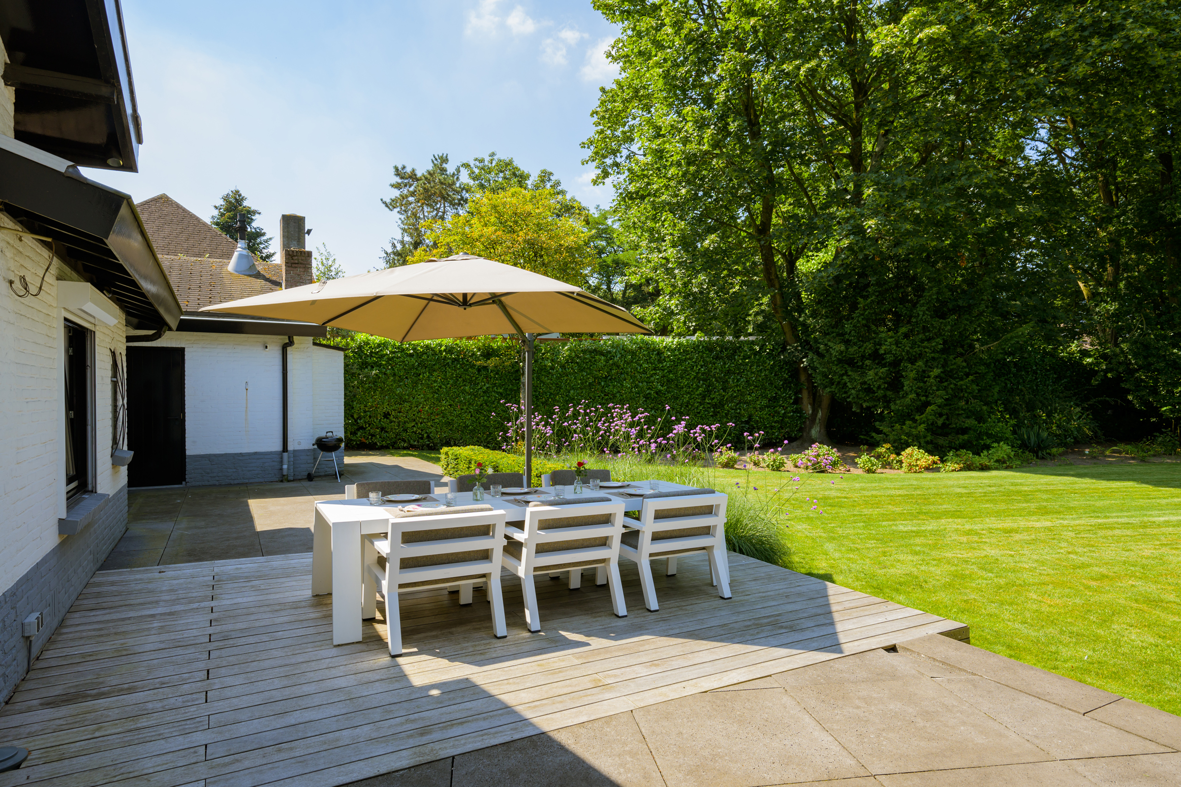 The beautifully landscaped garden offers optimal privacy and sun and shade spots throughout the day. The landscaping includes a large lawn, various terraces (made of large tiles and decking), beautiful trees, shrubs, and borders with very diverse planting.