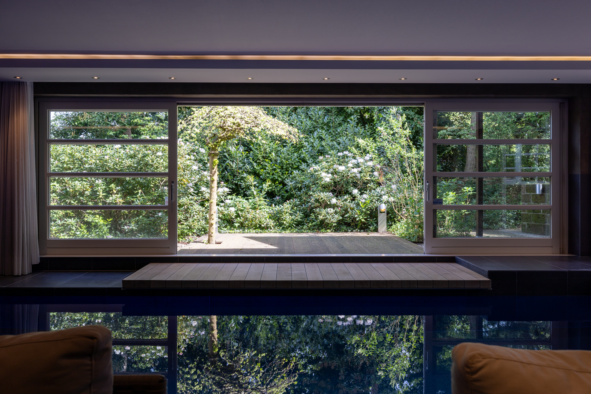This space is equipped with two large sliding doors that can be opened, giving you the feeling of an outdoor swimming pool. This also creates a beautiful integration with the terrace, the great outdoor space and the garden.