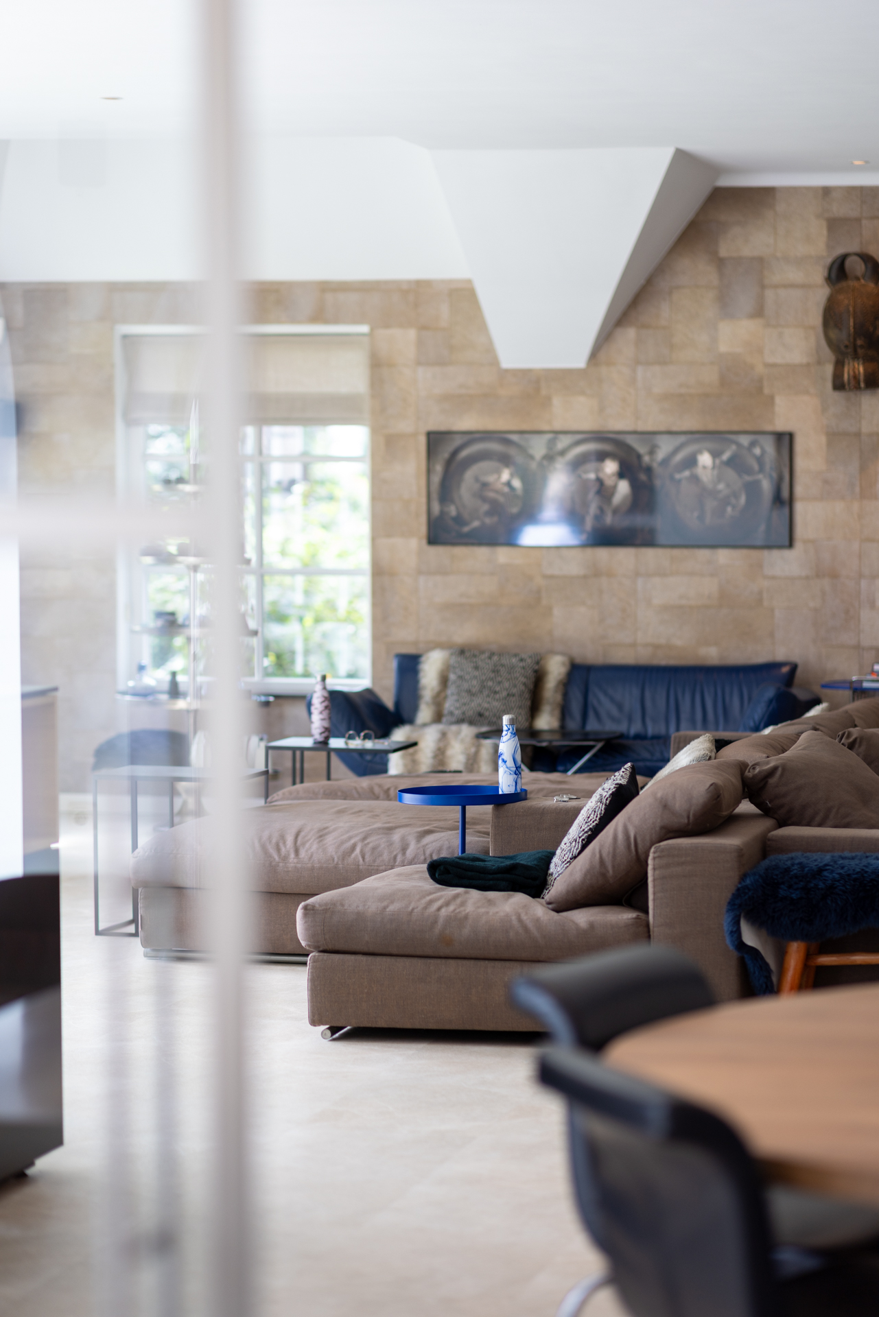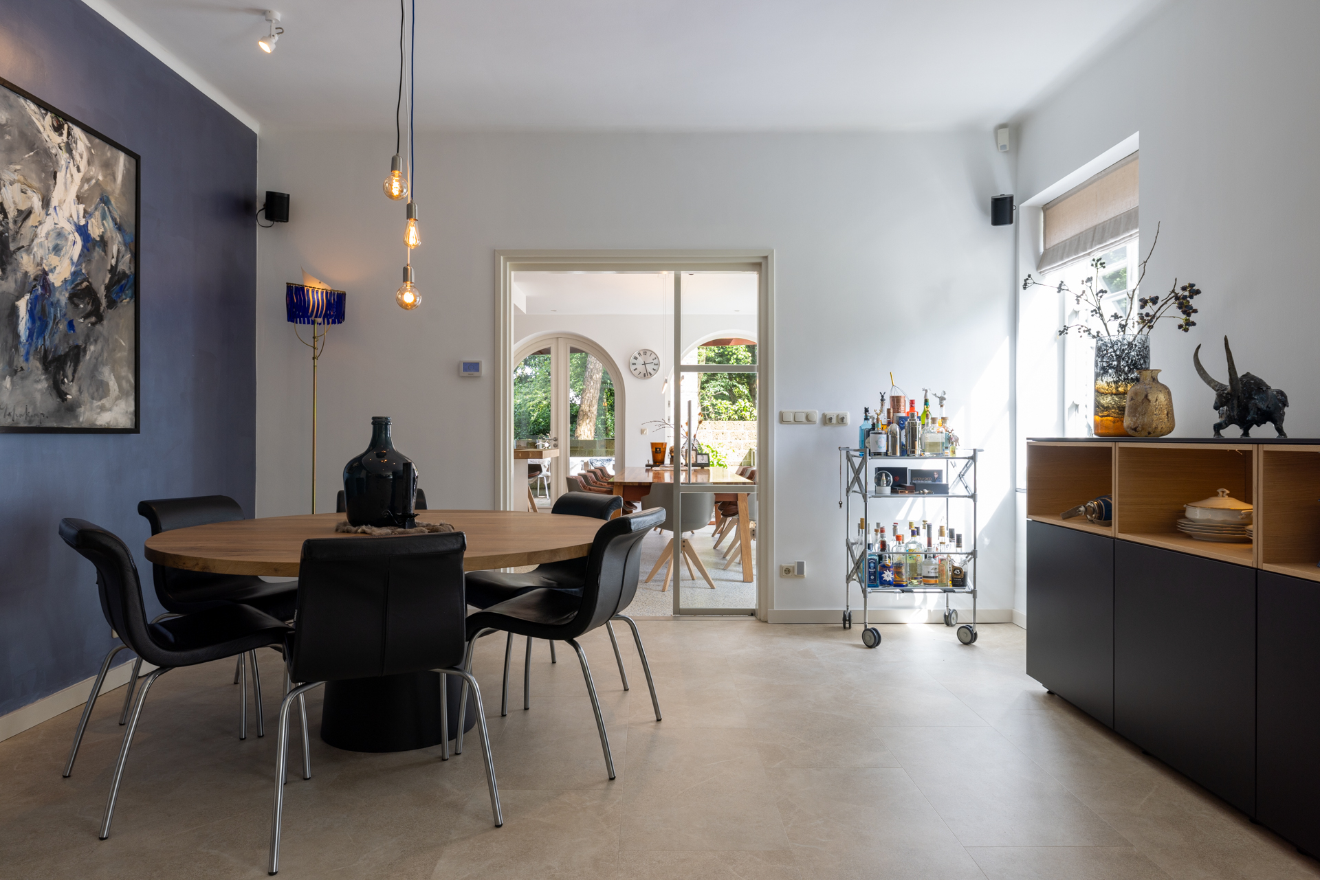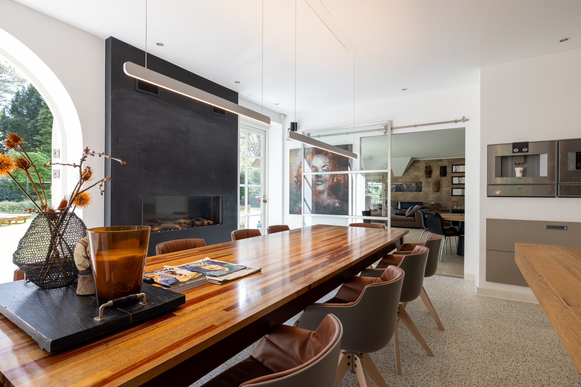 The kitchen has a gas fireplace, spacious dining area and double doors to the garden. This gives a nice connection with the garden and the outdoor kitchen. Here you bring the outside in.