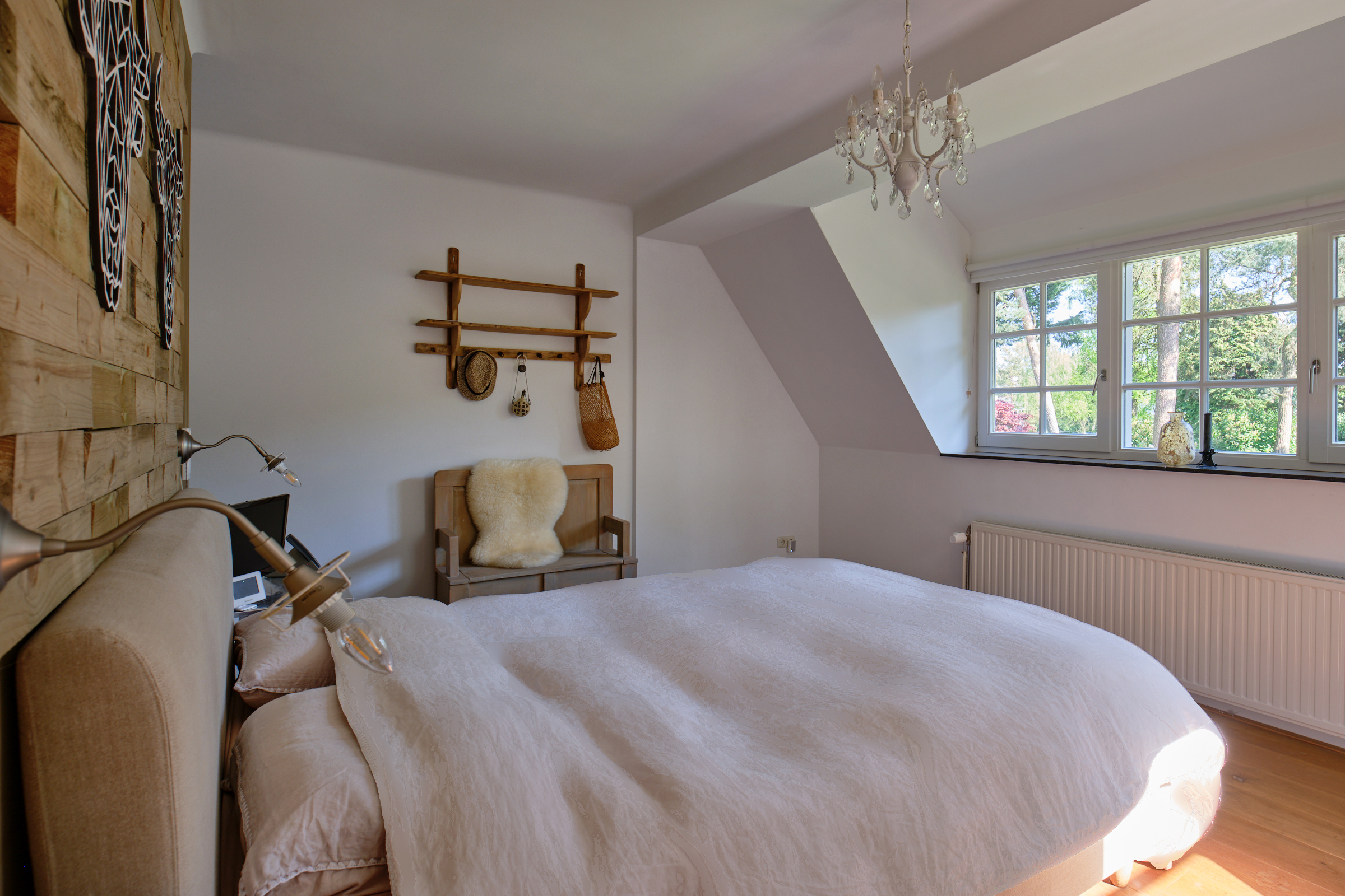 Master bedroom (approx. 3.60 x 5.35 m) with dormer window, large walk-in closet (approx. 2.10 x 4.00 m), ideal for conveniently storing clothes and accessories and access to the bathroom. The bedroom and dormer window are located above the extension of the living room. As a result, the dormer window is nicely integrated into the thatched roof.