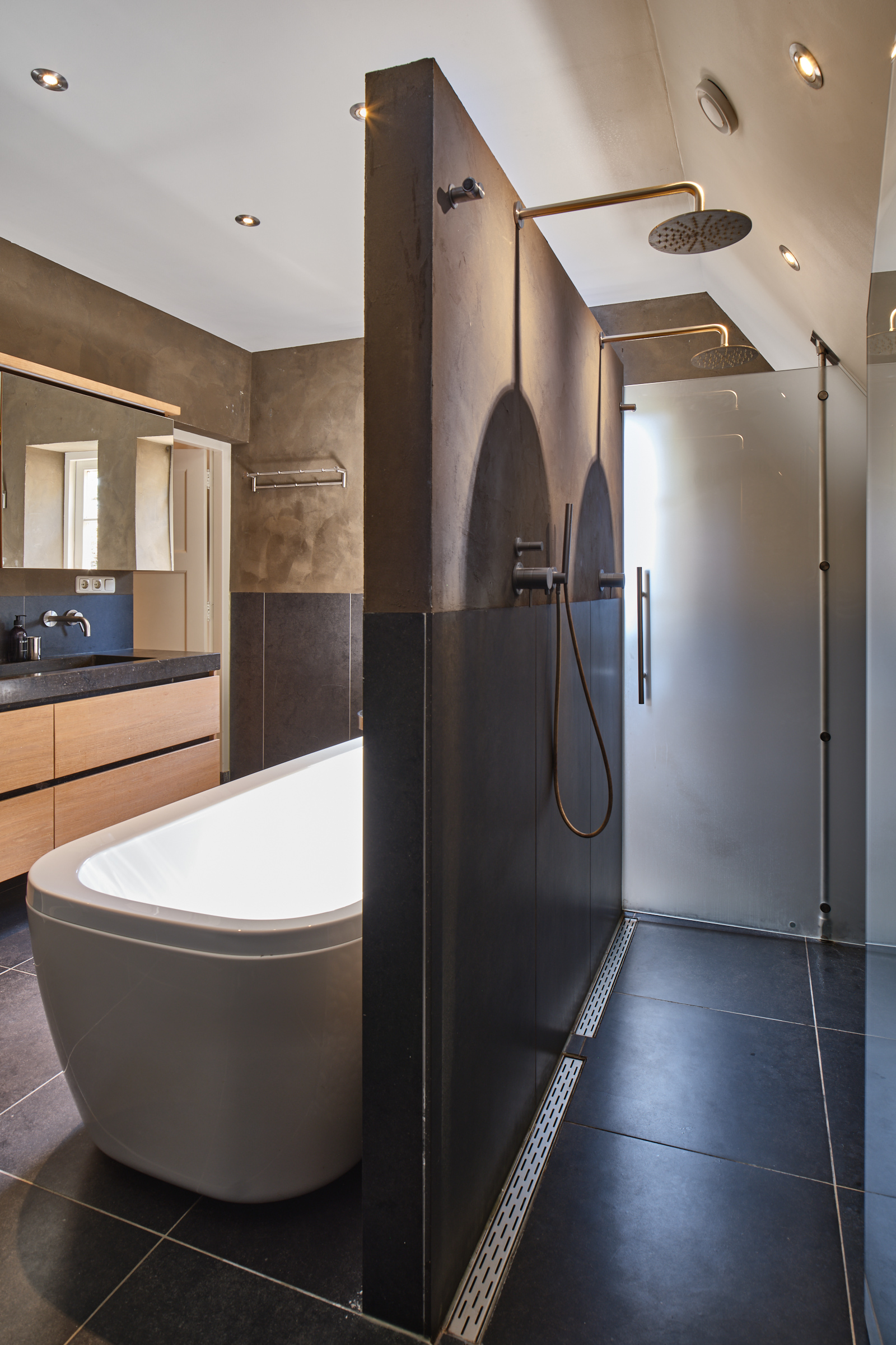 Spacious and luxurious bathroom (approx. 3.50 x 3.85/3.95 m) with a double sink, double walk-in shower, bath, toilet, design radiator, electric underfloor heating and mechanical ventilation. All bathroom furniture is custom made by Antonissen interior construction.