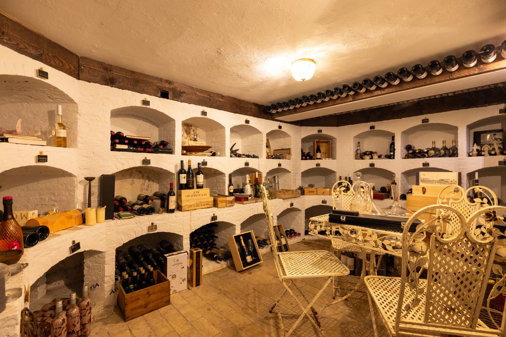 Cellar (approx. 4.85 x 4.55 m) at standing height with storage space for food and a beautiful wine room with plenty of space for wine storage. A space to celebrate the love of wine.