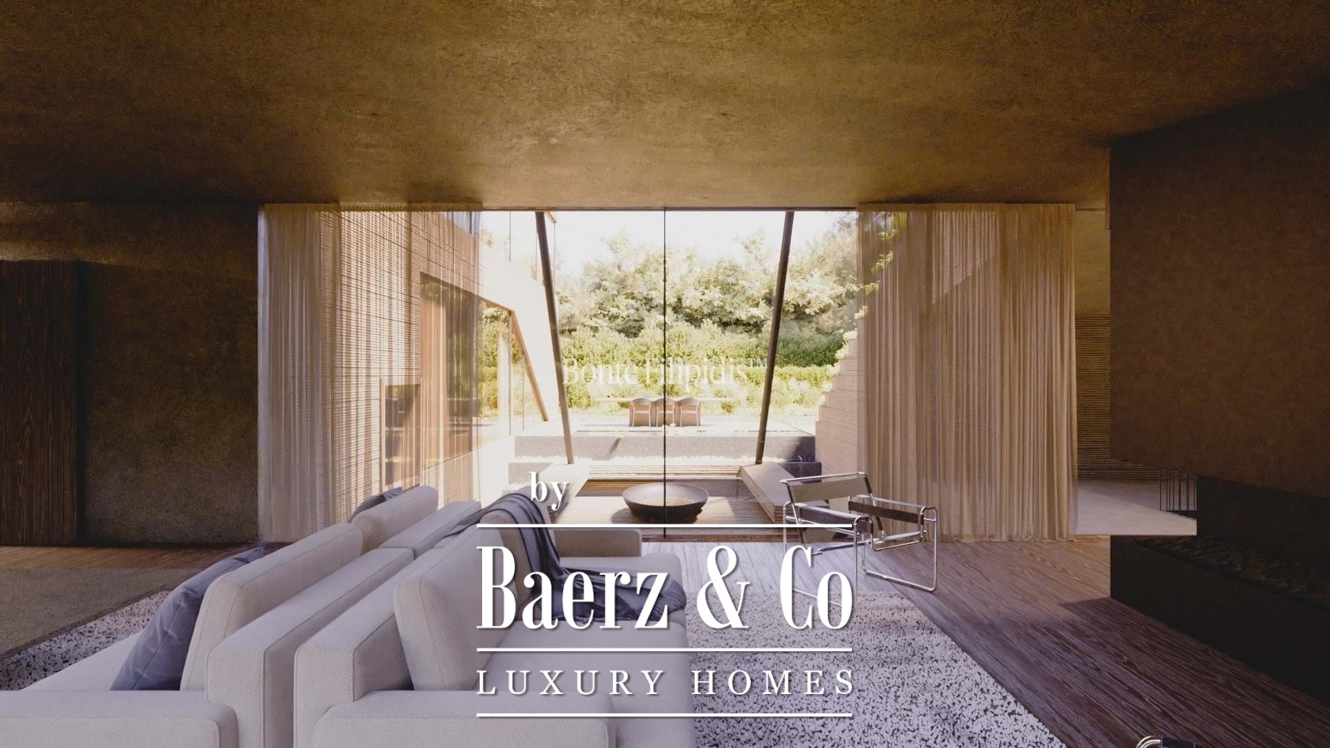 There are six en-suite bedrooms, including a master suite with private terrace and walk-in closet. The east and west-facing suites reveal serene views of landscaped gardens and water features. The lower level houses a gym, spa with sauna, laundry, technical areas, and a garage with electric gate for security.