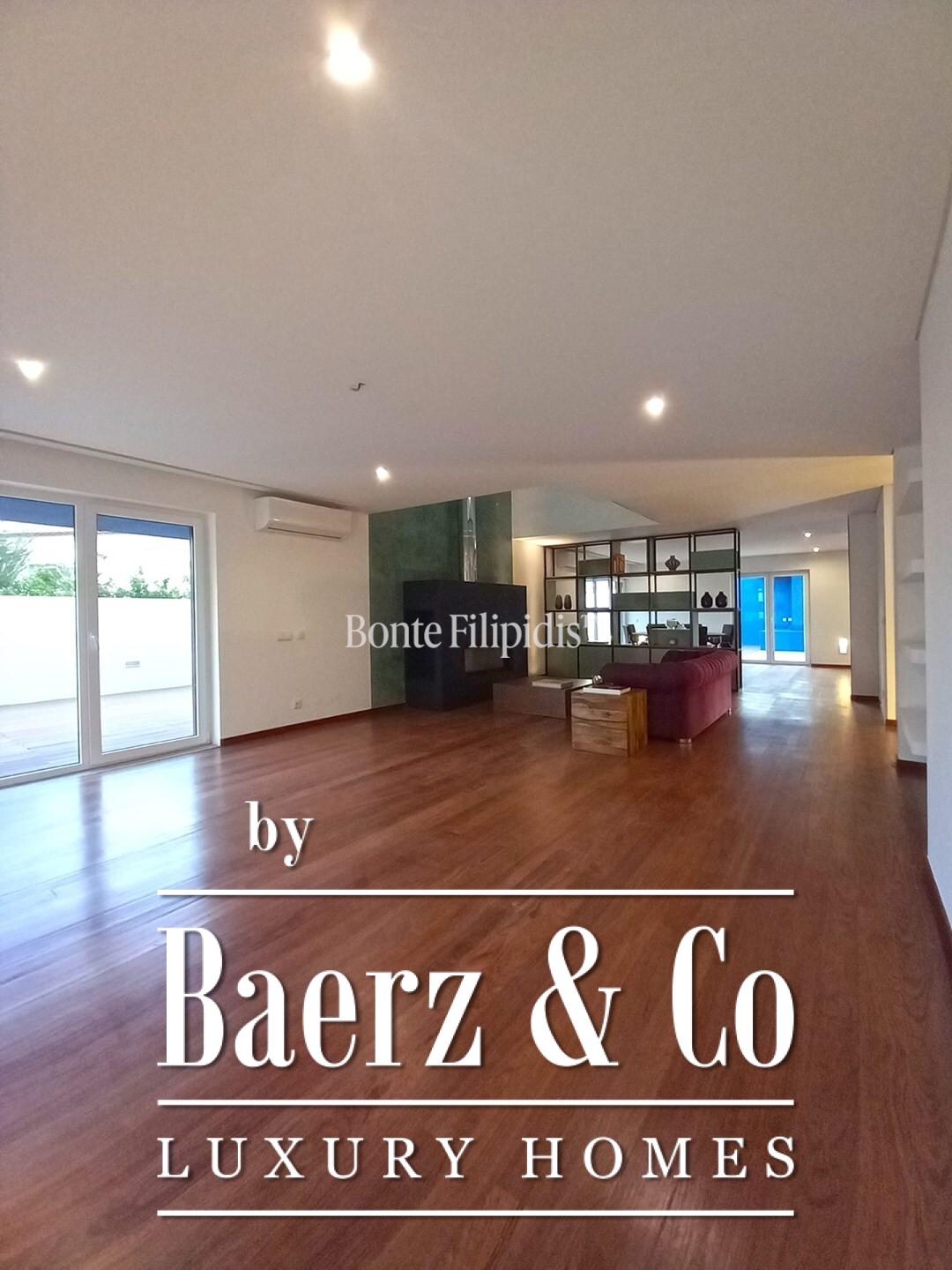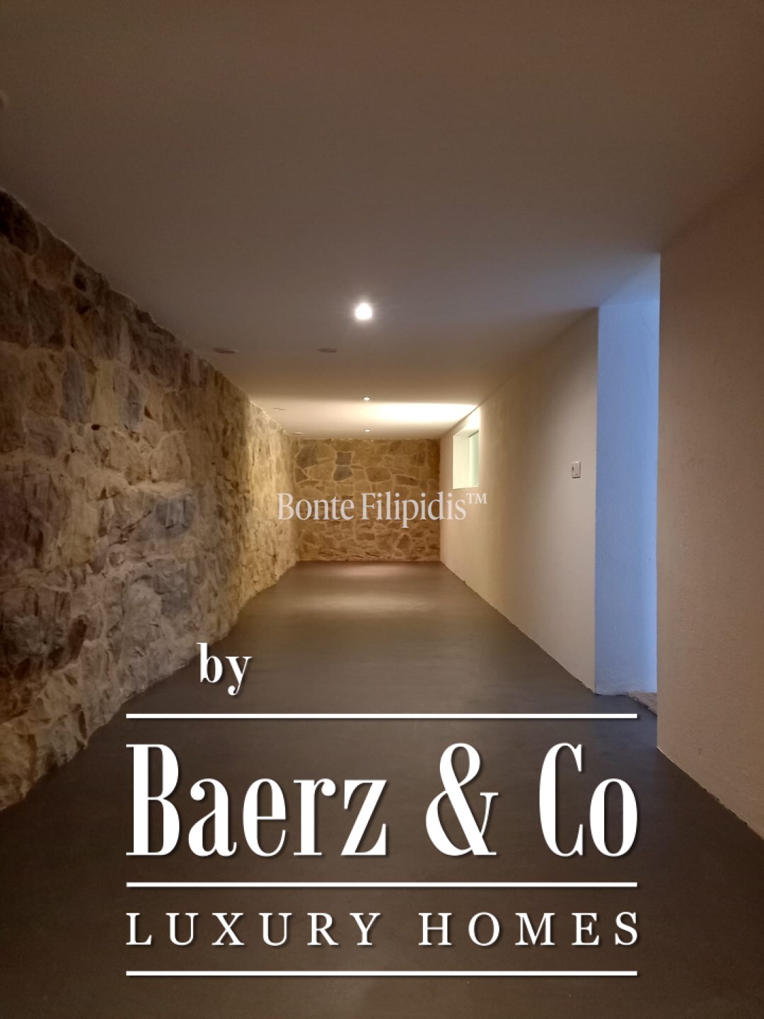 The upper floor holds three en-suite bedrooms, including a 36.25 m² primary suite. Each room is fitted with built-in wardrobes and private bathrooms, composing spaces where calm and discretion set the tone.