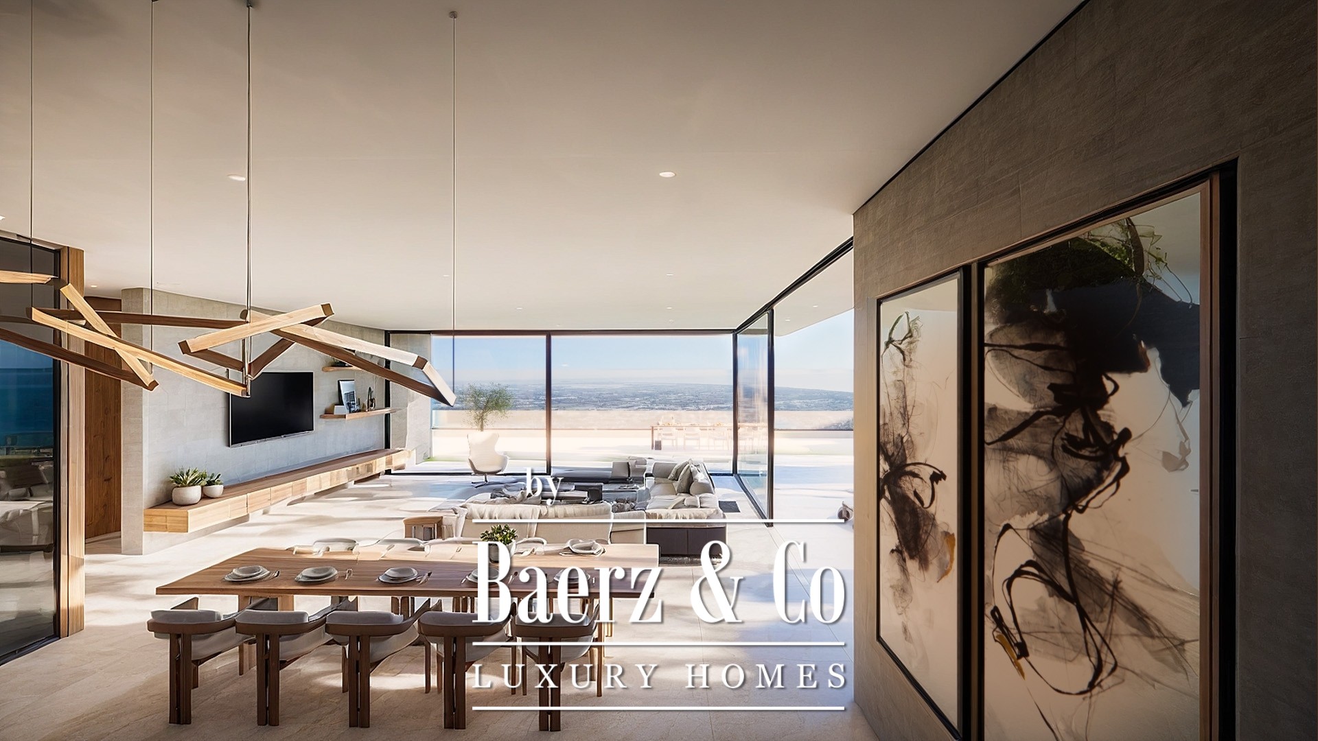 Light defines the main floor, where a living and dining space opens directly toward the sea, complemented by a designer kitchen that flows outward to the landscaped garden and an infinity pool. The main level guest suite provides discretion and privacy, with its own dressing room and bathroom, while a guest bathroom ensures convenience for visitors.