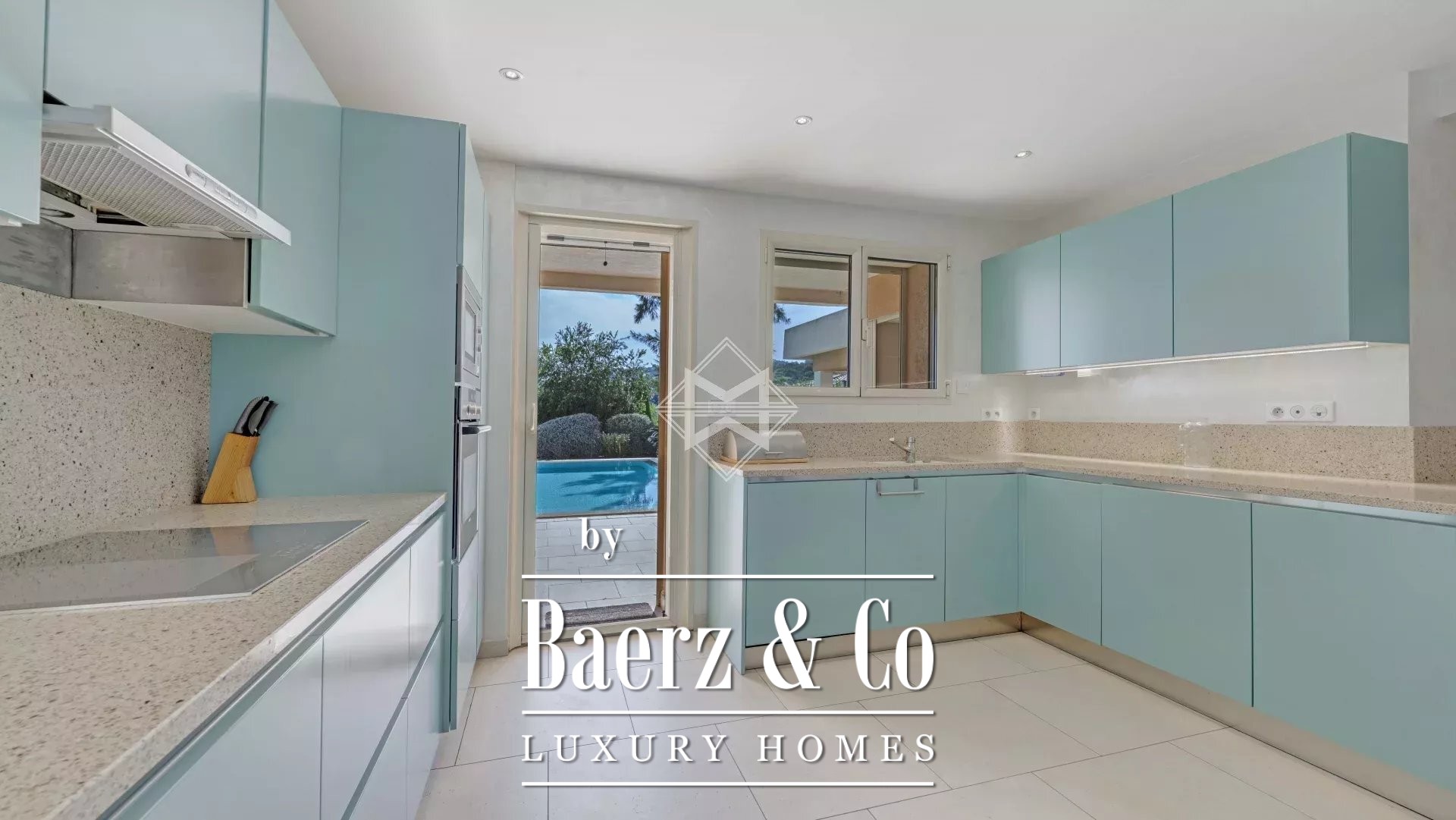 Nestled in a peaceful and privileged environment in Cavalaire-sur-Mer, within a secure and gated estate close to the beach, this South-West facing architect-designed villa combines elegance, space, and light, with beautiful open views and glimpses of the Mediterranean.