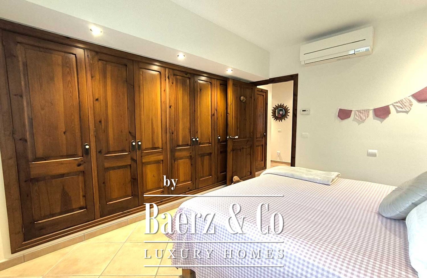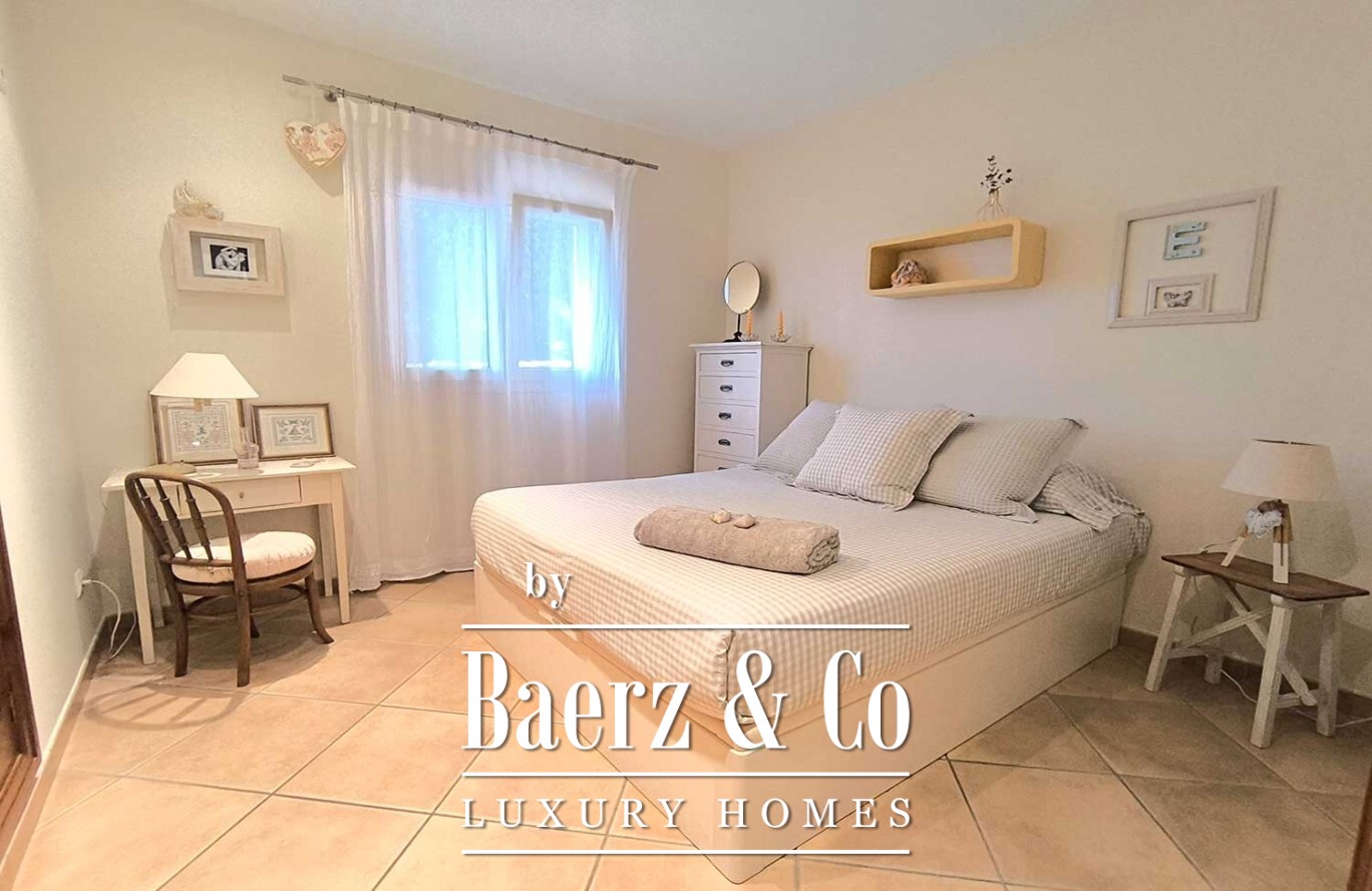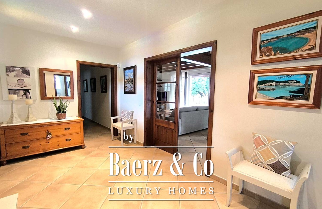 Outdoors, a generous swimming pool anchors a landscape unified by mature trees and immaculate artificial grass, creating both serenity and ease of care. The villa in Ciutadella de Menorca combines authenticity and privacy with immediate access to the Mediterranean coast, presenting a rare lifestyle opportunity.