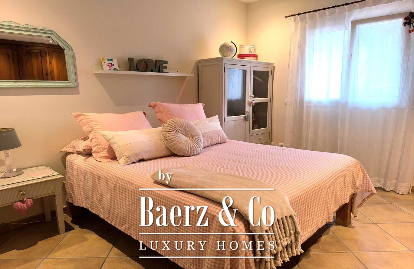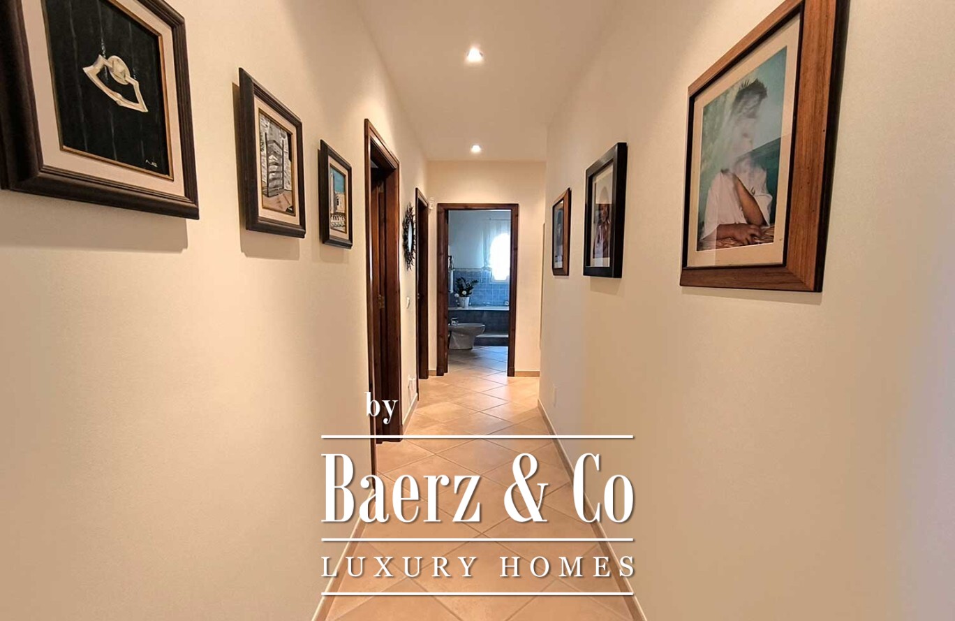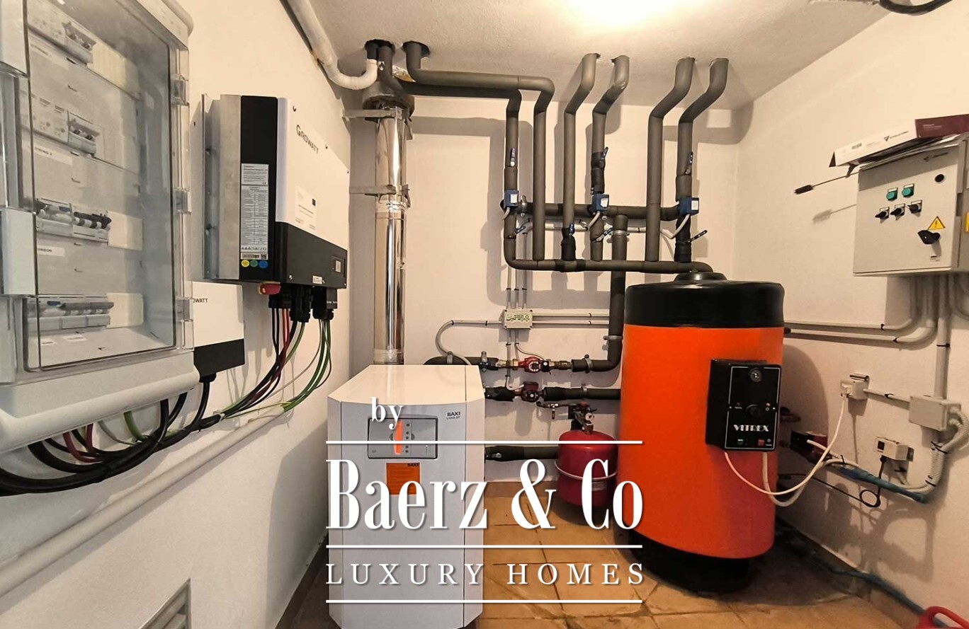 The villa’s basement extends beneath the footprint of the house, offering an exceptional garage area with capacity for multiple vehicles. Comprehensive climate control, including underfloor heating on the ground floor, central heating above, air conditioning, solar panels, and a centralized vacuum system, reflects a commitment to comfort and sustainability.