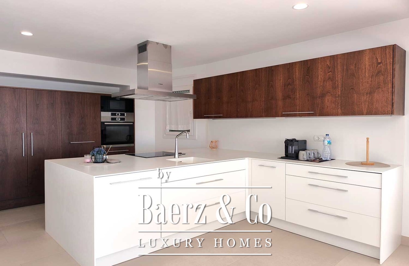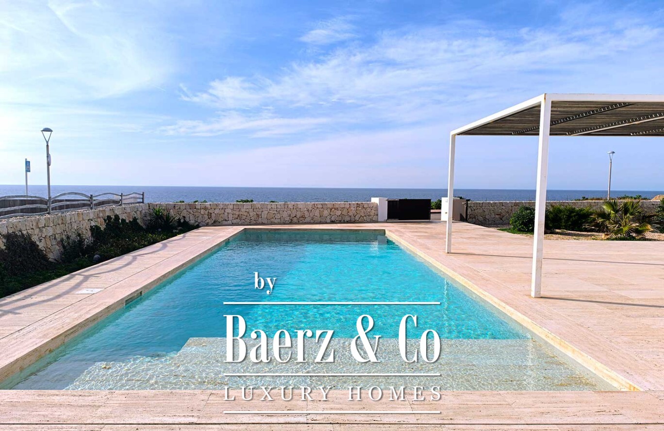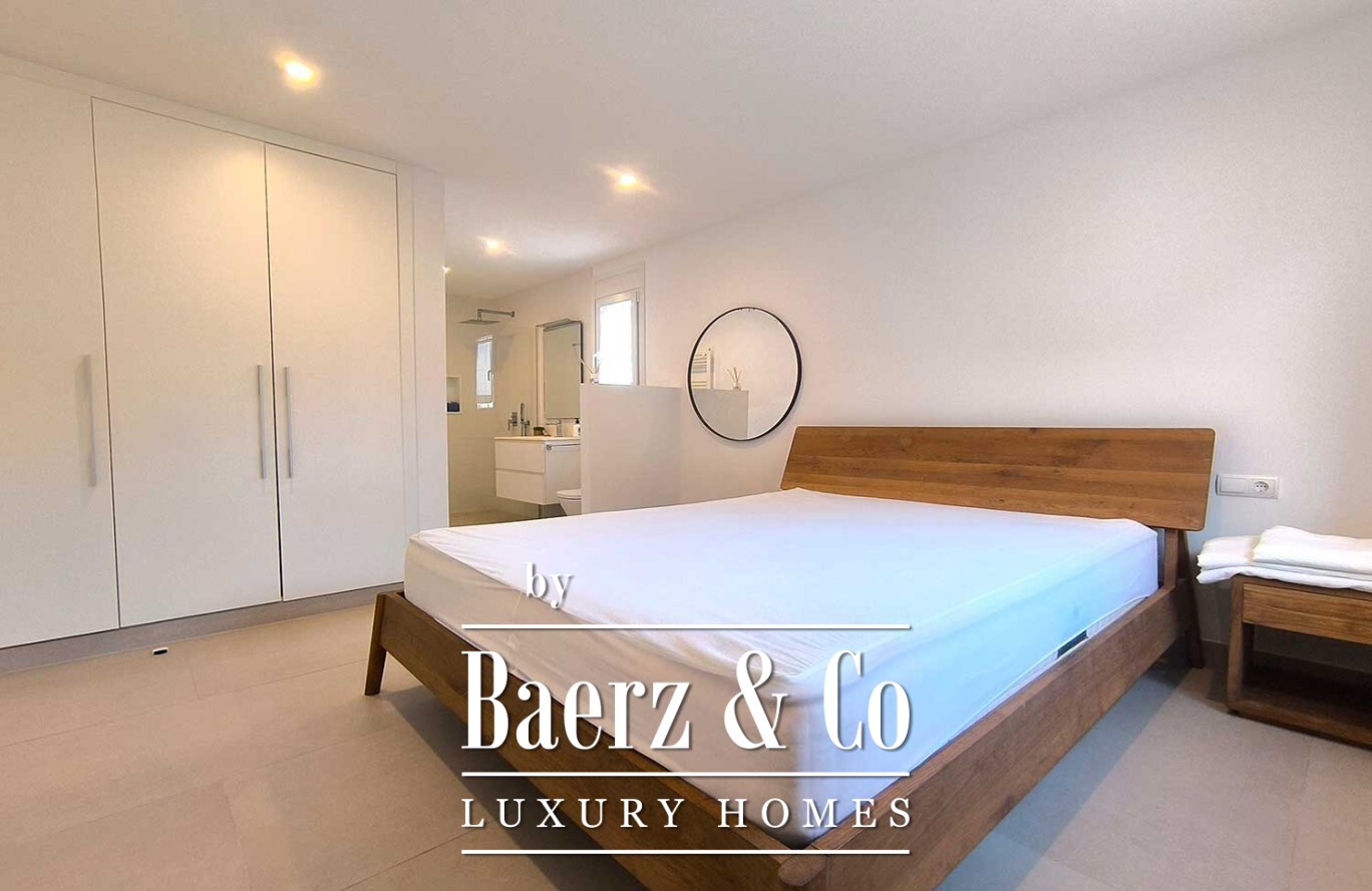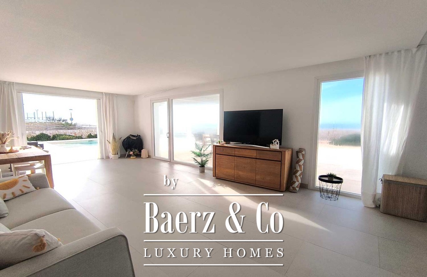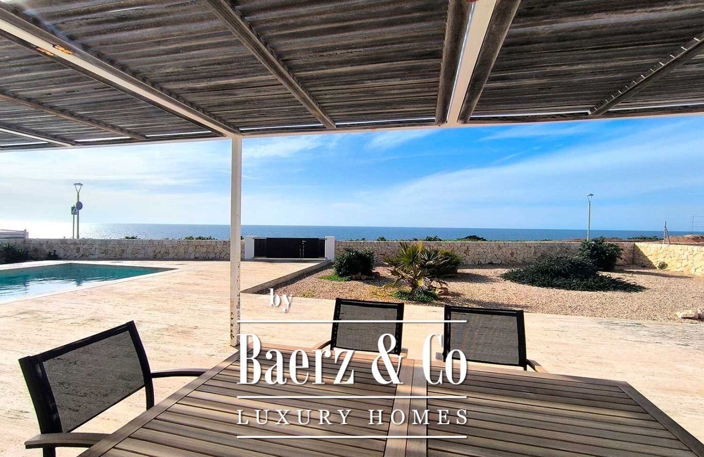 Stepping outside, the villa offers a lush garden and a magnificent pool, complemented by an expansive terrace with a pergola—perfect for embracing the warmth of the Mediterranean. With a living area of 160 m², three bedrooms, and three bathrooms, this contemporary villa in Ciutadella de Menorca embodies an elevated coastal lifestyle, deeply connected to its exceptional location and views.