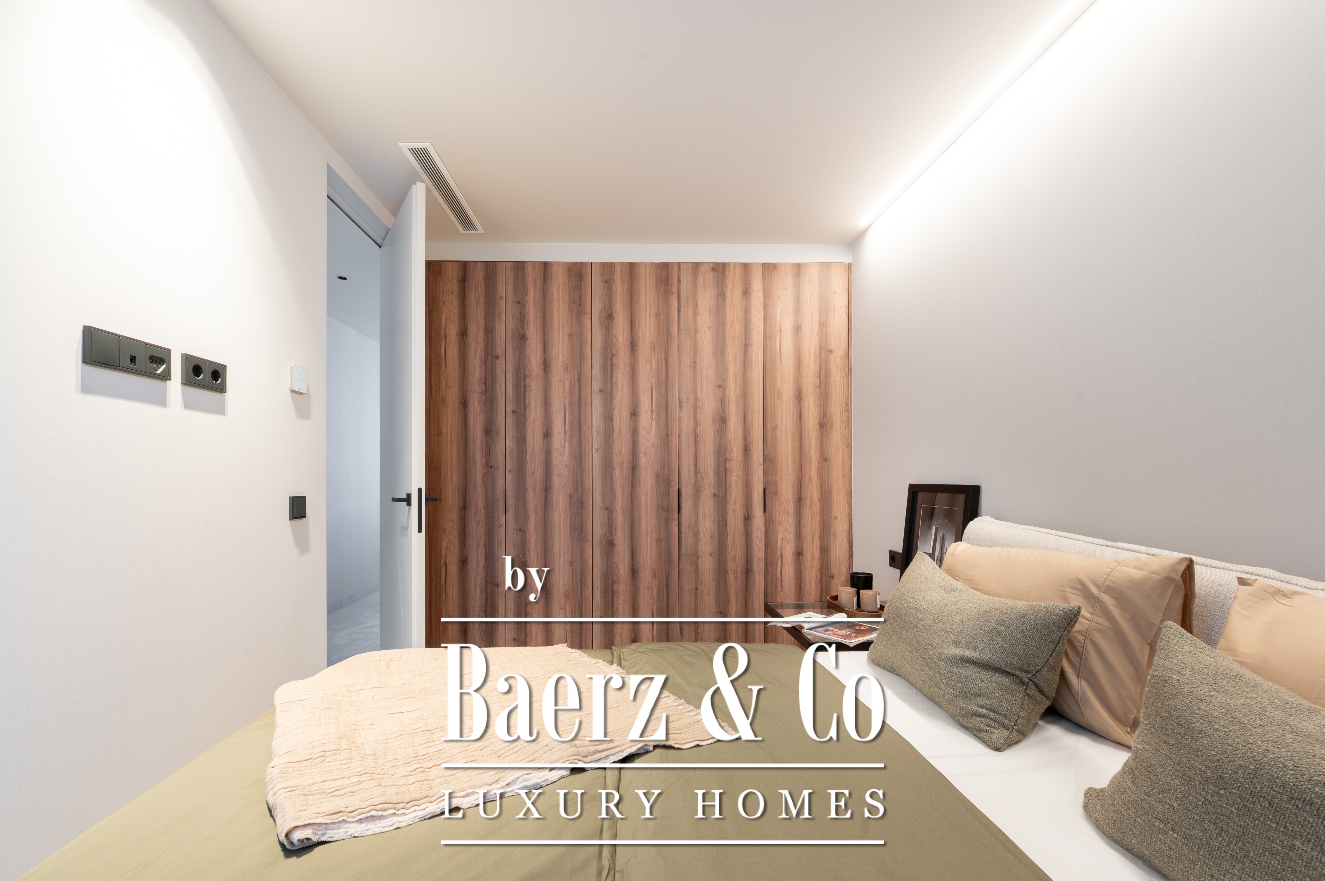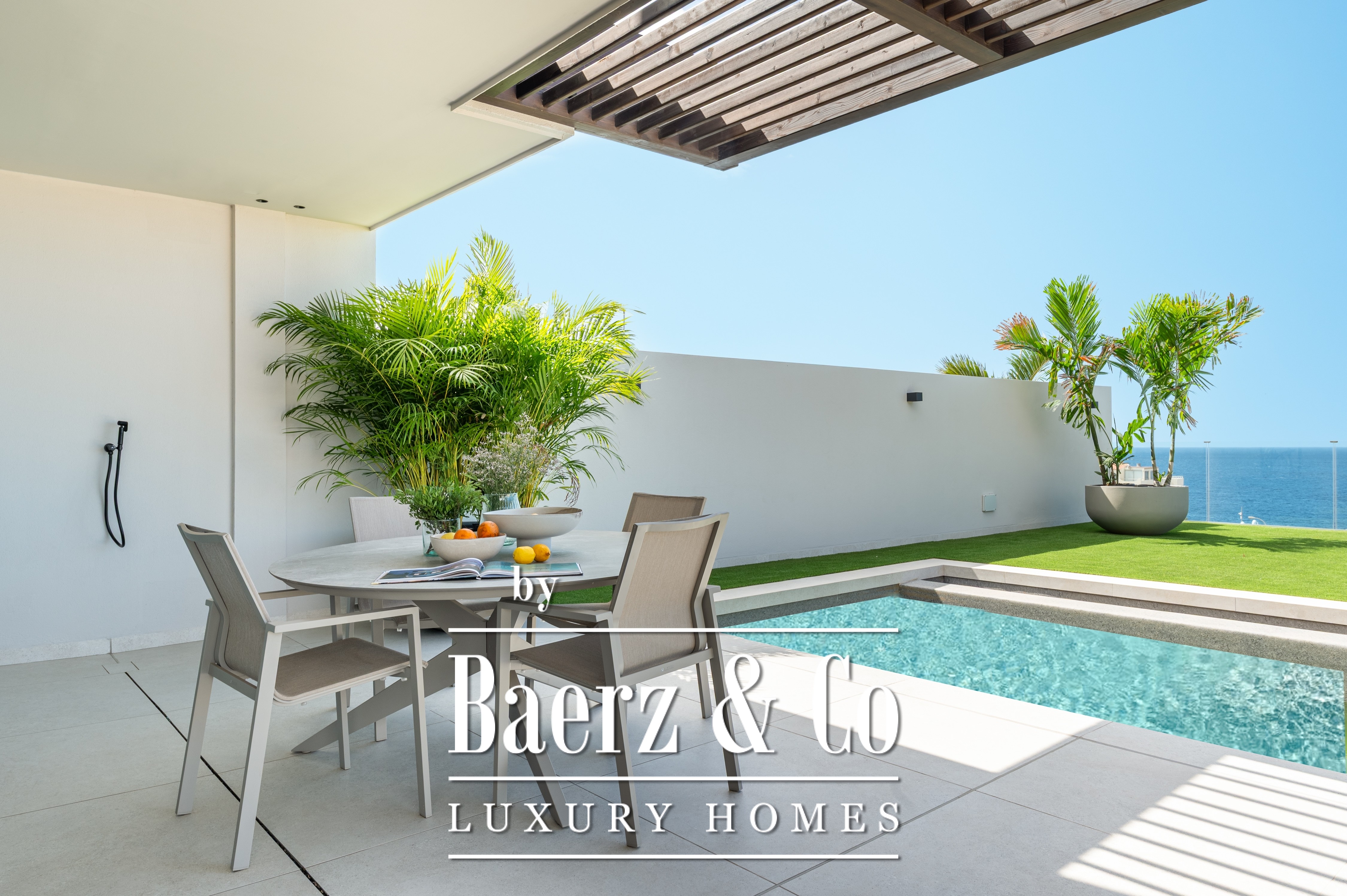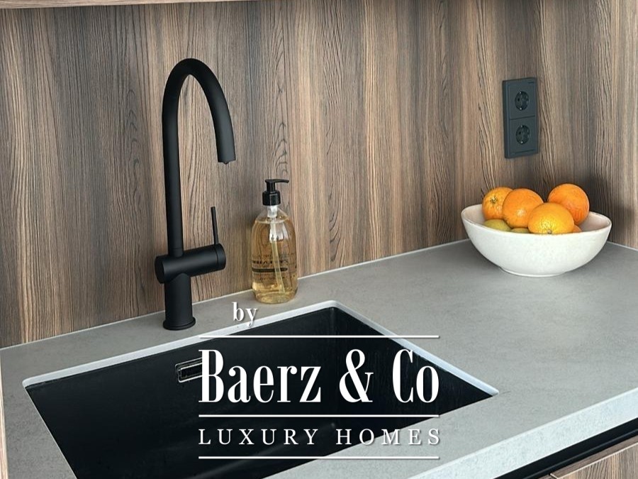 The interior spans 114 m², featuring two bedrooms and two bathrooms, thoughtfully designed for ease and privacy. A private heated swimming pool extends the living experience outdoors, while energy-efficient systems and heat pumps deliver both comfort and sustainability. The kitchen, outfitted with top-brand appliances, stands ready for both daily routines and impromptu gatherings, complemented by three fitted wardrobes for refined storage.