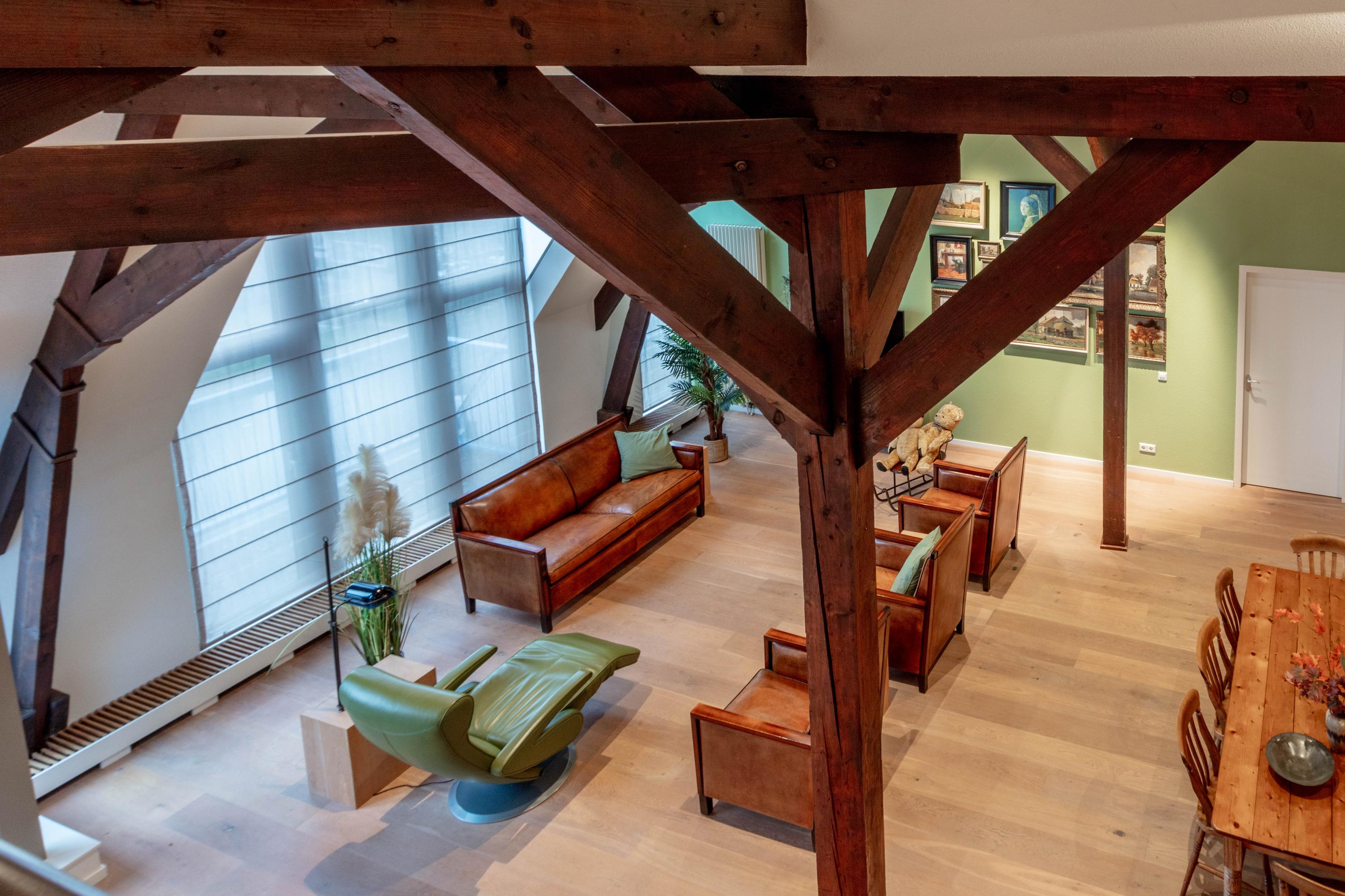 De bijzonder sfeervolle woonkamer is indrukwekkend door de unieke hoogte en fraaie zichtbare kapconstructie. De open keuken bevindt zich aan de achterzijde en beschikt over een kookeiland, volop kastruimte en diverse inbouwapparatuur. Vanuit de keuken is er prettig zicht op de woonkamer met een gezellig zitgedeelte en een apart eetgedeelte.