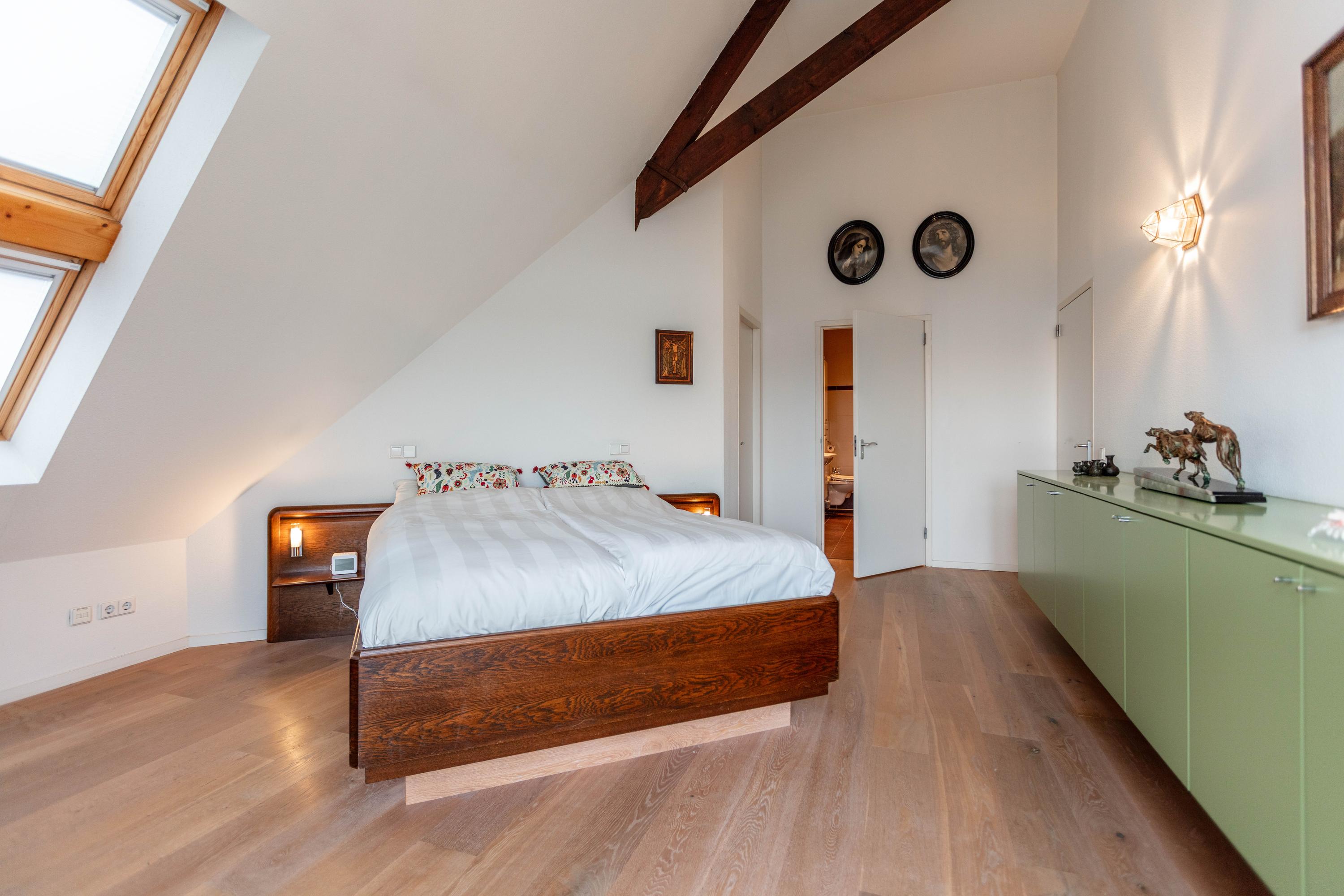 De tweede slaapkamer is ook voorzien van dakvensters en heeft eveneens een eigen badkamer met douche en wastafel.