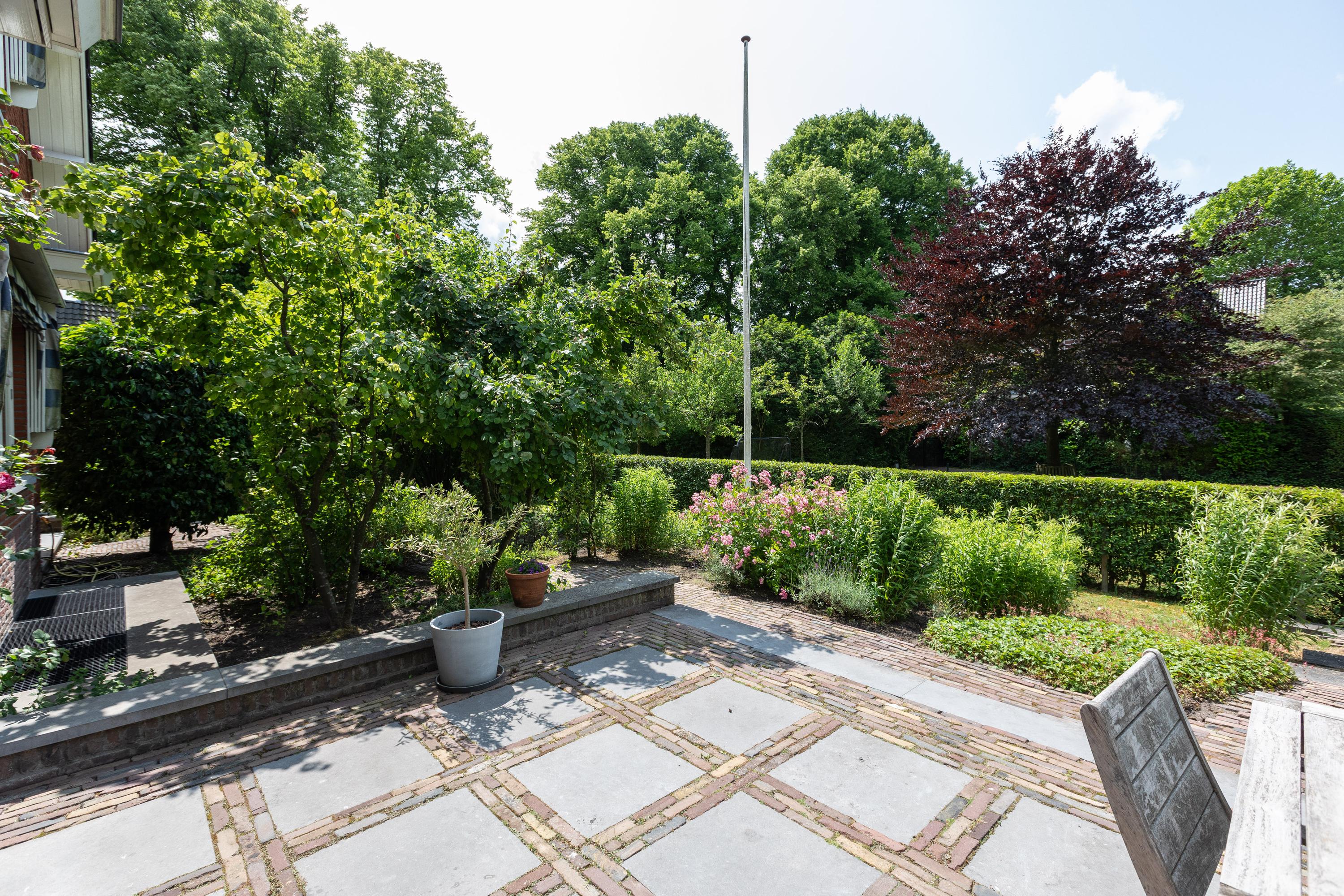 Entrance with wardrobe and meter cupboard. Spacious hallway with access to the study (3.80 x 3.40 m). Guest toilet. Living room with elegant herringbone parquet flooring and fireplace. Multiple French doors provide access to the surrounding garden. Large open-plan Siematic kitchen (4.18 x 5.30 m) equipped with an American-style fridge/freezer, 6-burner gas hob with oven, extractor hood, dishwasher, and a separate combi microwave/oven. Utility room with washing machine and dryer connections. Sunny, generous terrace (6.05 x 6.22 m).