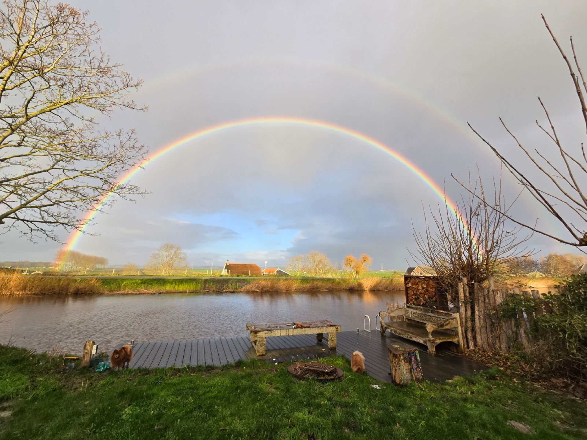 The waterfront garden is without doubt one of the highlights of this home. Located directly on open water, it offers complete privacy and uninterrupted views over the polder landscape. A covered outdoor seating area with a wood-burning stove – featuring original oven doors from the former bakery once located on this site – adds a unique and characterful touch.