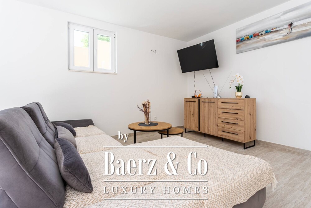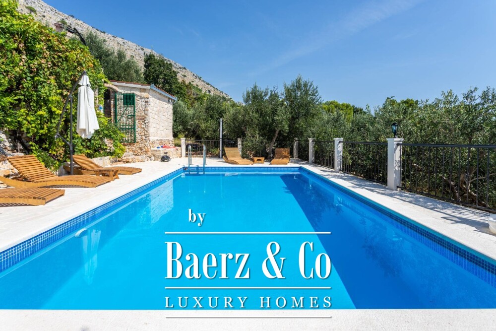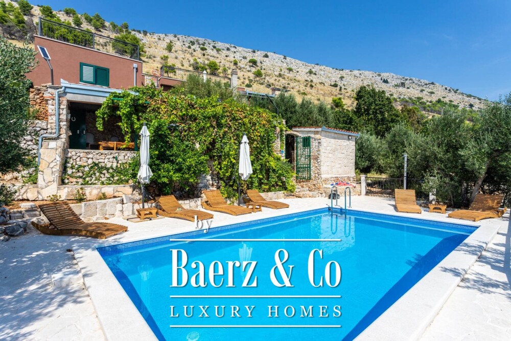Outdoor dining and a summer kitchen embrace a 28 m² swimming pool and sun terrace, encouraging effortless transitions between indoor spaces and the Mediterranean landscape. Proximity to a renowned local tavern at 500 m and convenient access to Split, Omiš, and excellent beaches supports a leisurely lifestyle within quiet natural surroundings. Four covered parking spaces, a dedicated tool room, water reservoir, and full solar readiness ensure autonomy and comfort. This villa in Jesenice is a rare synthesis of traditional craftsmanship and deliberate privacy, made for those seeking an immersive Croatian retreat.