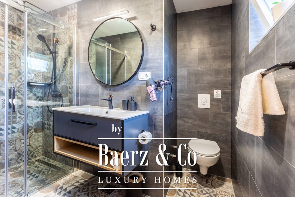The interior unfolds with original 50 cm stone walls, accented by modern comforts including a sauna, air conditioning in every room, and central heating installations. The main floor offers three refined bedrooms with en-suite bathrooms and a central living area, while a fourth suite occupies the upper floor alongside a rooftop jacuzzi and sunbathing space—ideal for stargazing or private relaxation.