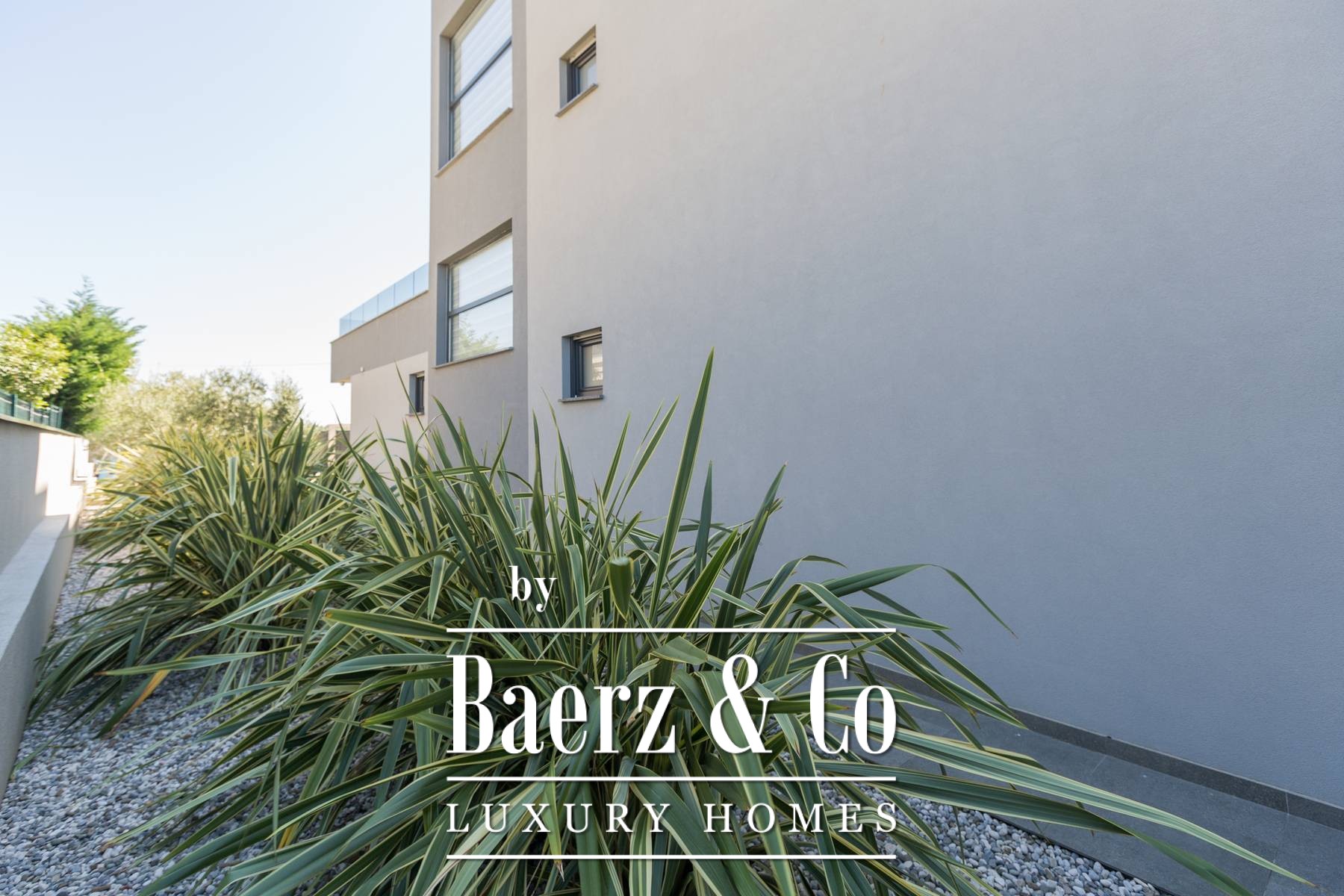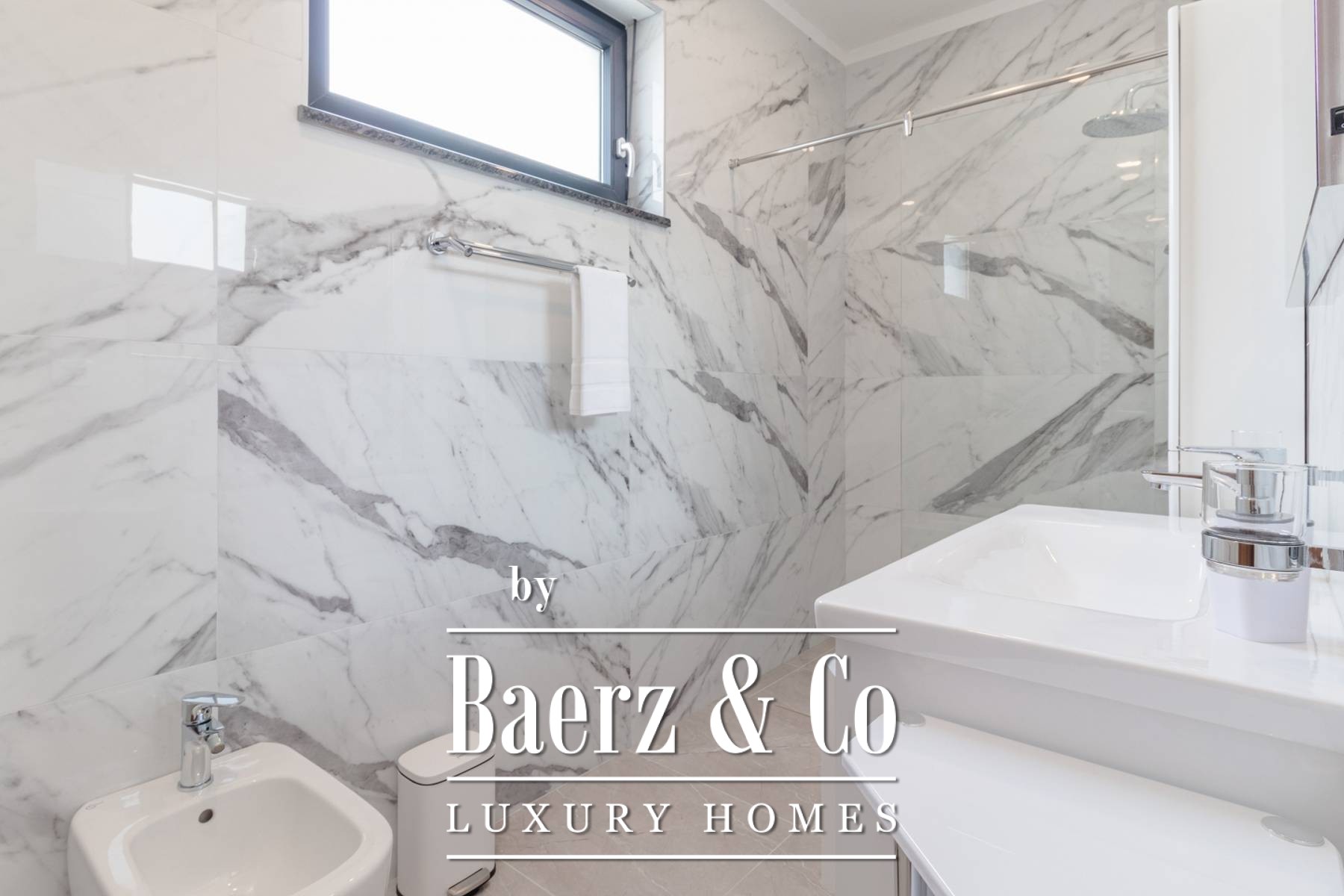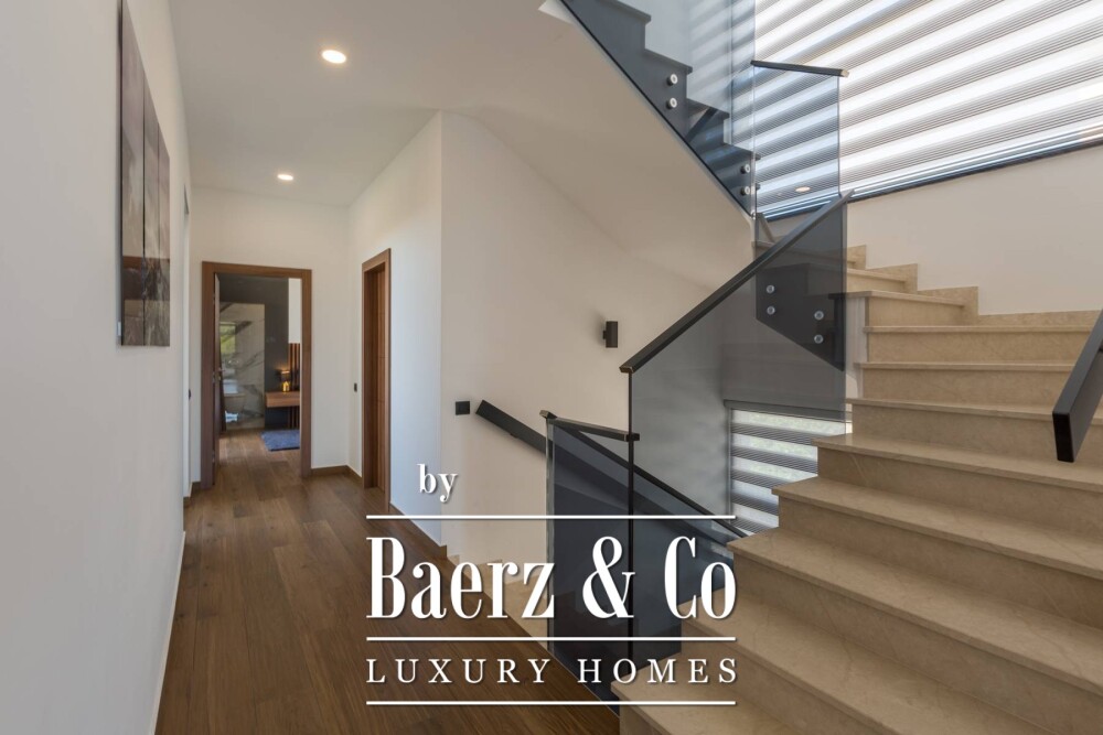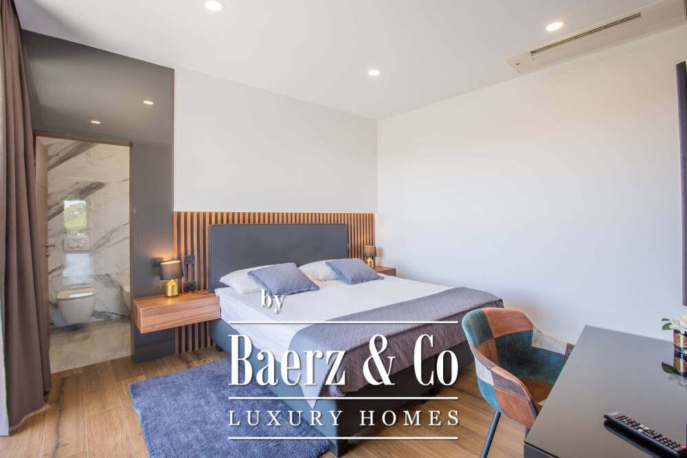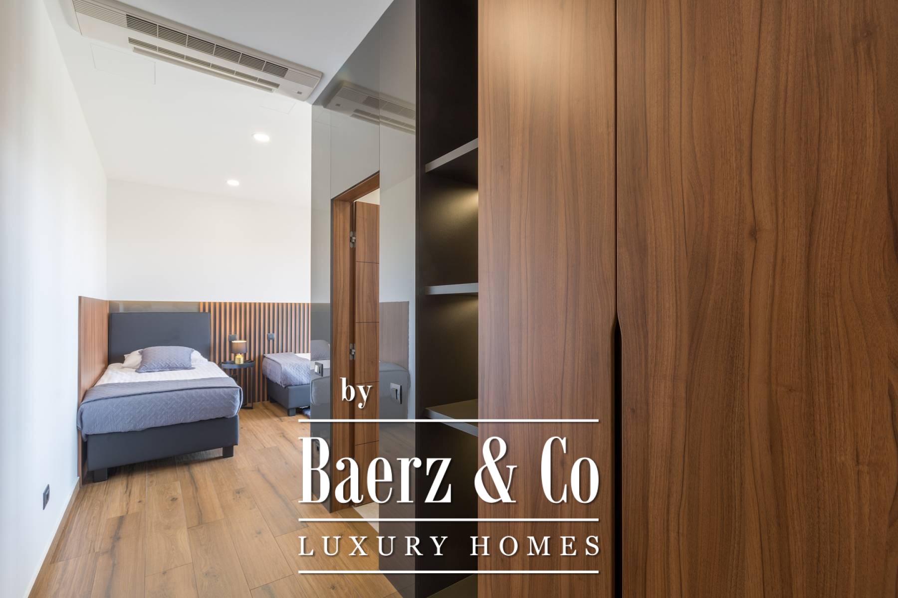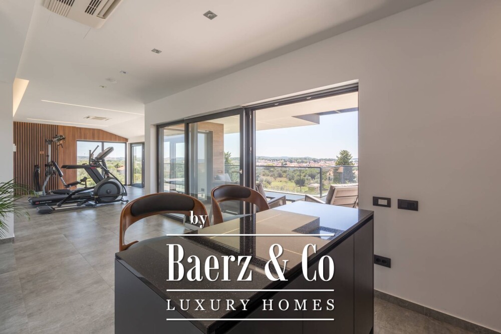 The villa balances privacy and conviviality, with four bedrooms each featuring en suite bathrooms and custom furnishings. Smart home controls extend seamlessly from climate to ambient shade, while underfloor heating and water-based heat pumps ensure comfort year-round. The principal bedroom on the ground floor is complemented by a utility room and modern kitchen with a central island. Upstairs, expansive terraces frame south-facing sea and garden vistas, while the top floor boasts a private fitness hall wrapped in glass, with a terrace prepared for a jacuzzi and sauna.