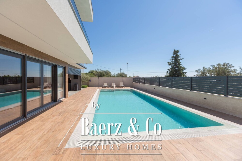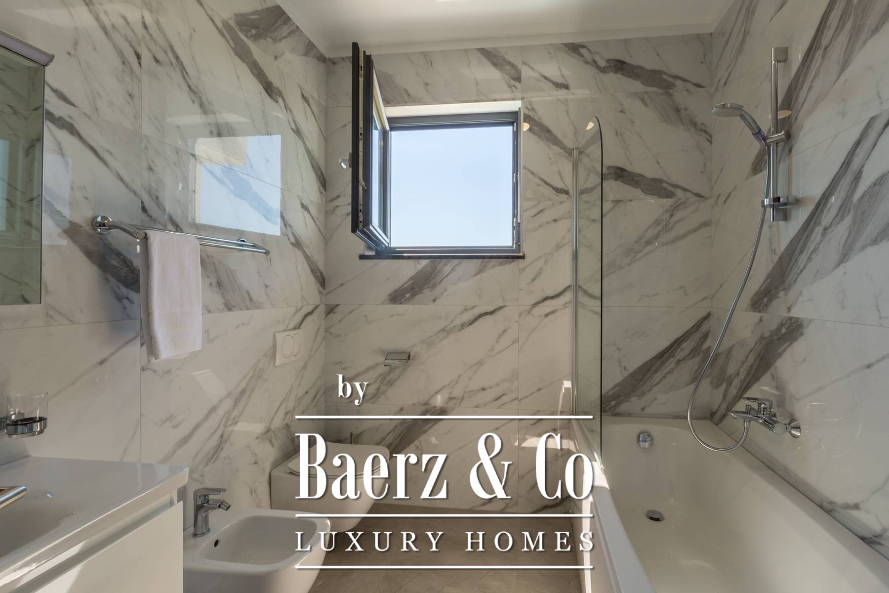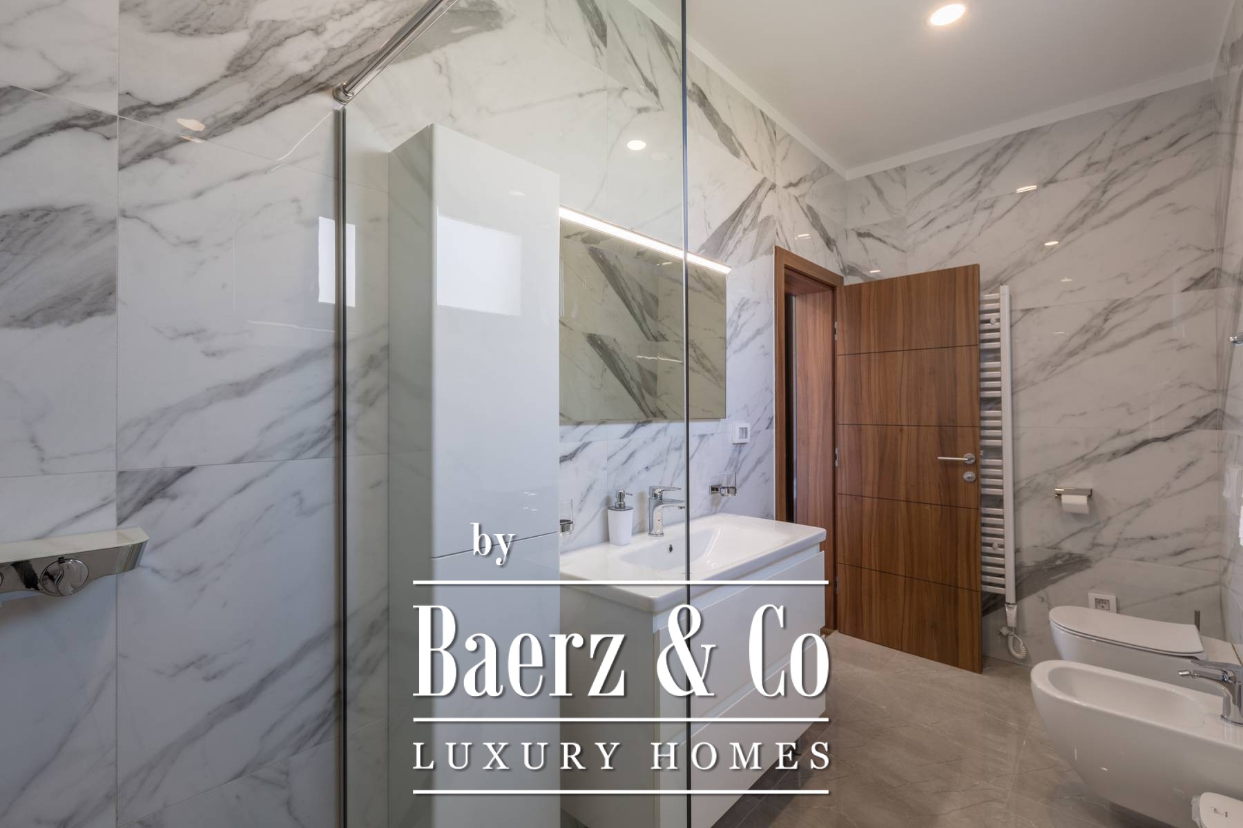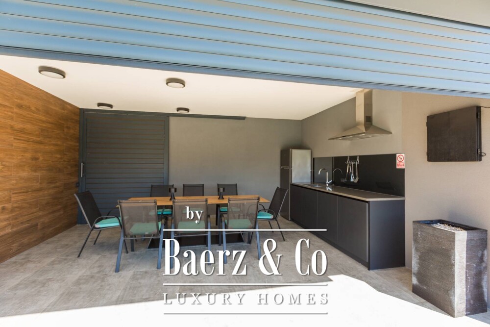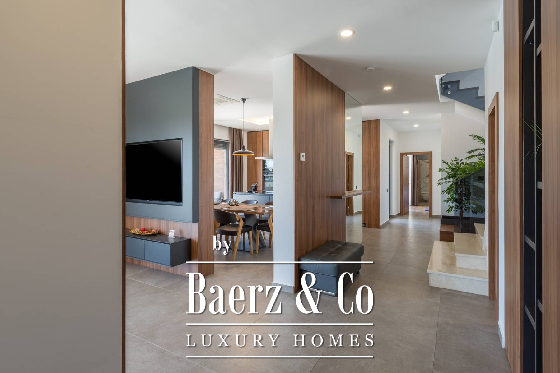The villa balances privacy and conviviality, with four bedrooms each featuring en suite bathrooms and custom furnishings. Smart home controls extend seamlessly from climate to ambient shade, while underfloor heating and water-based heat pumps ensure comfort year-round. The principal bedroom on the ground floor is complemented by a utility room and modern kitchen with a central island. Upstairs, expansive terraces frame south-facing sea and garden vistas, while the top floor boasts a private fitness hall wrapped in glass, with a terrace prepared for a jacuzzi and sauna.