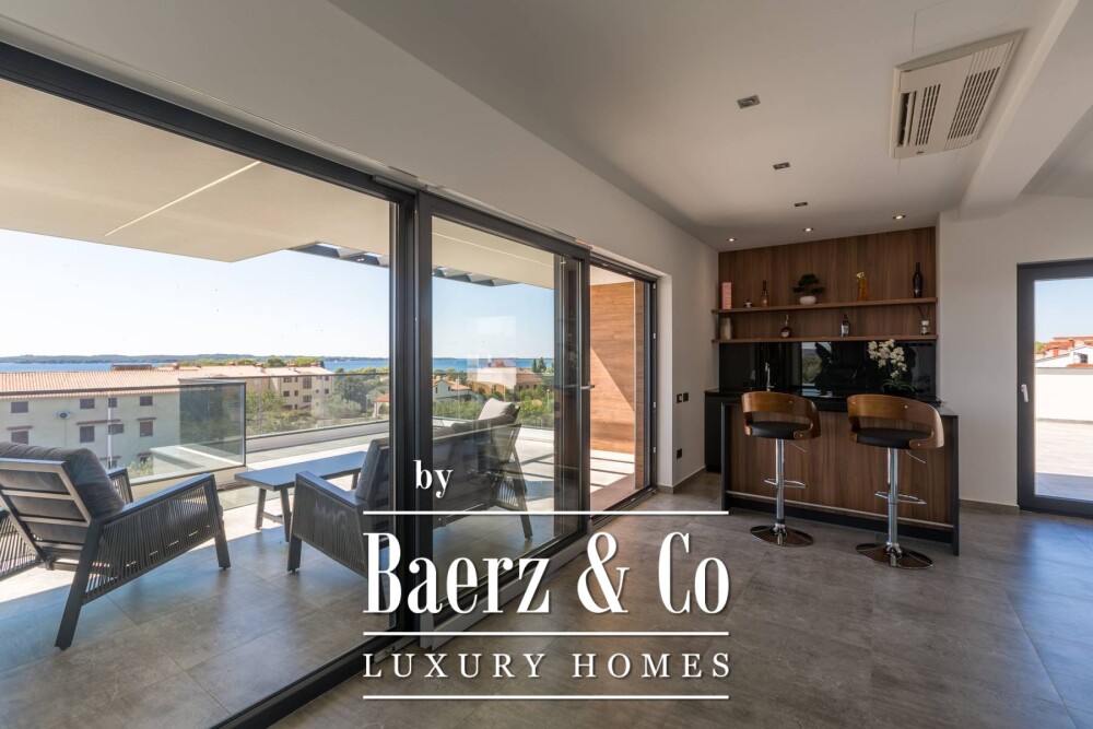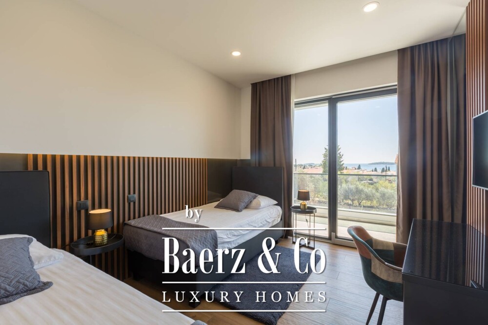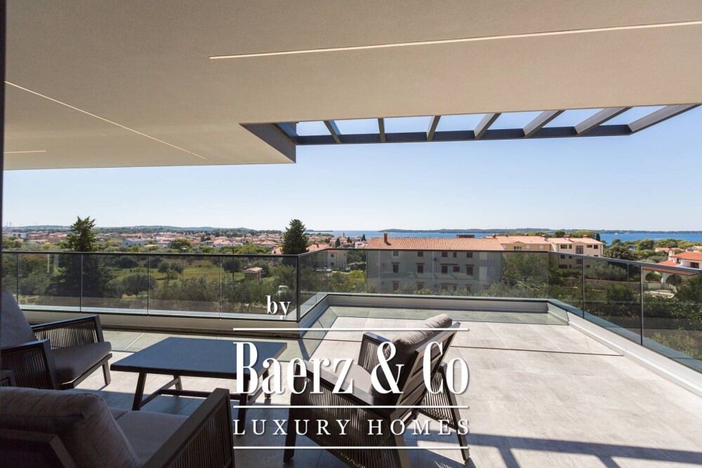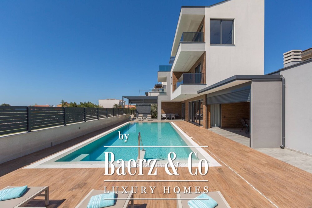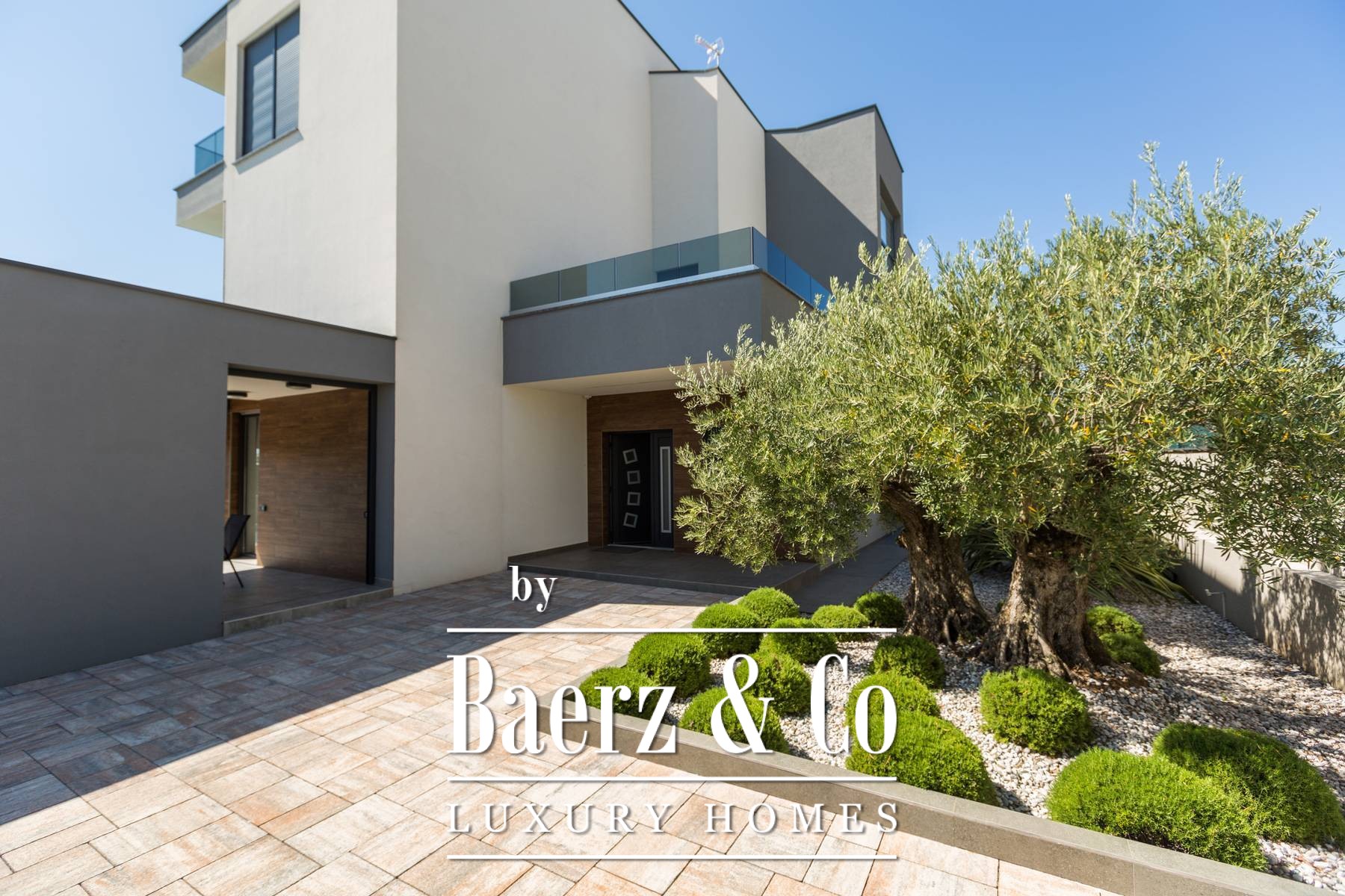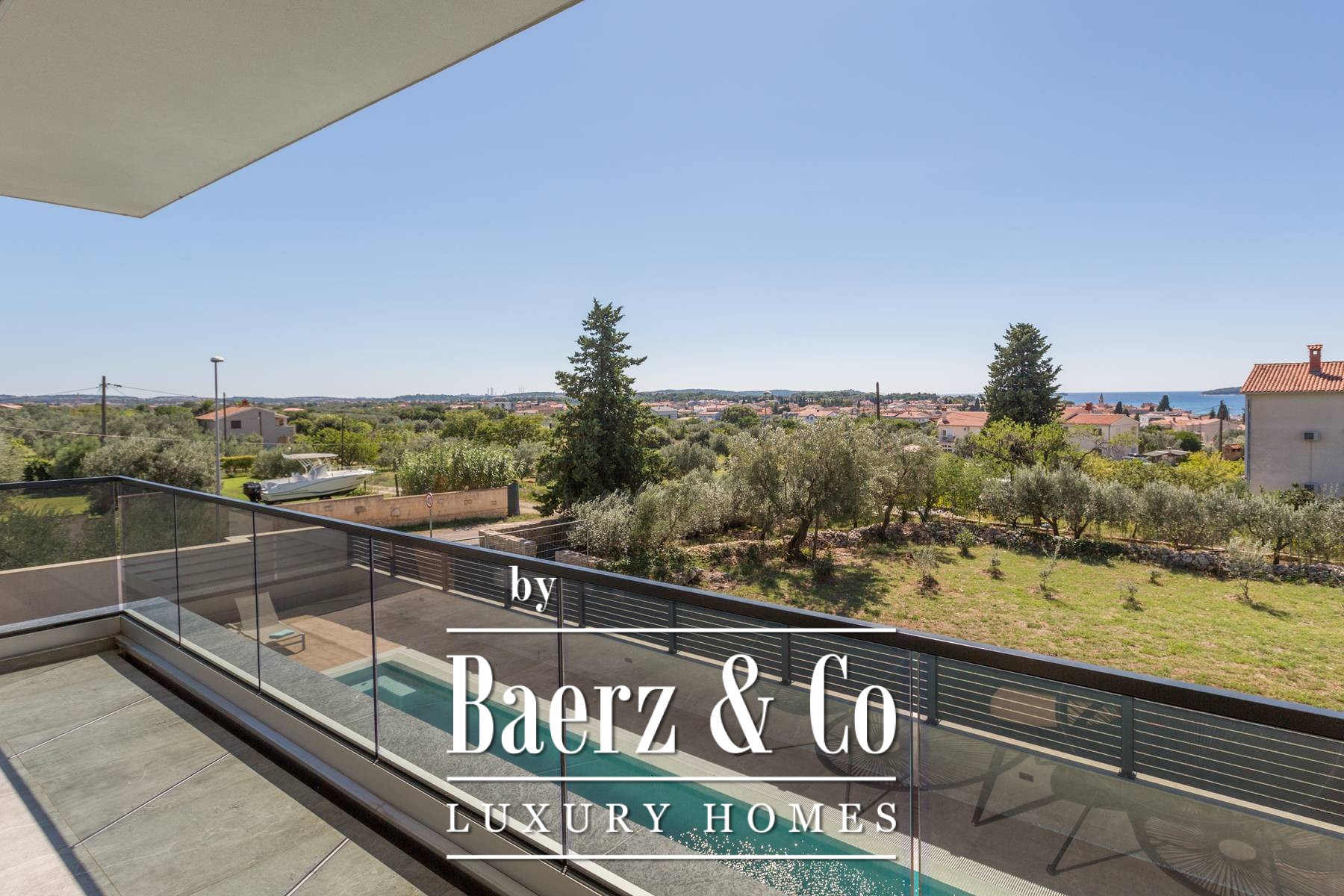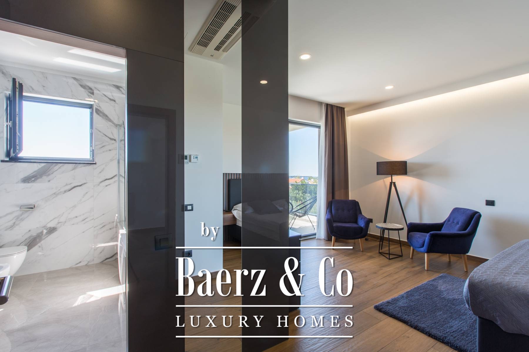 Villa Fažana with panoramic sea views invites refined living on the Adriatic. This villa in Fažana, Croatia, offers 450 m² of meticulously arranged space distributed across three floors, all oriented to maximize sunlight and an unobstructed view toward the Brijuni archipelago. Step into the ground floor, where a luminous living room unfolds beside a sculpted stone terrace and a 60 m² overflow pool. The large glass walls, ceiling-integrated air conditioners, and three point two meter ceilings enhance the sense of openness. The contrast of modern wood lines and centuries-old olive trees evokes both sophistication and warmth.