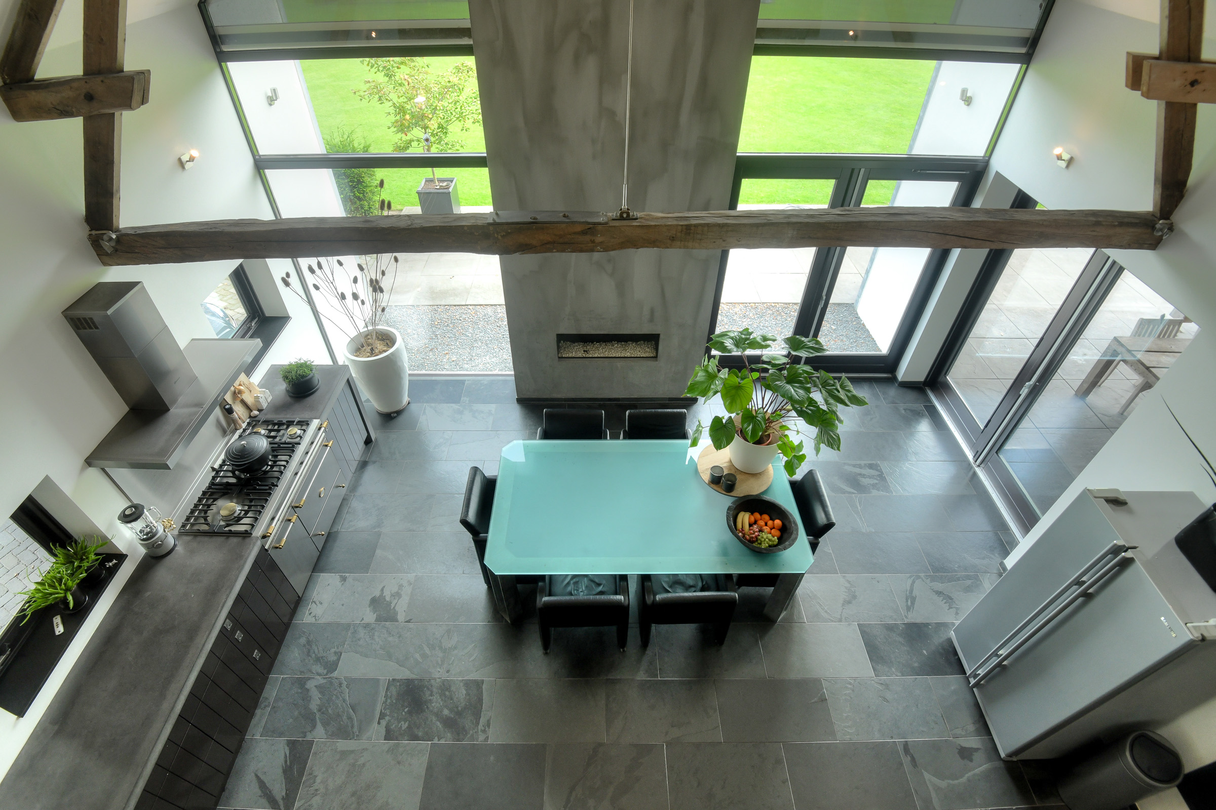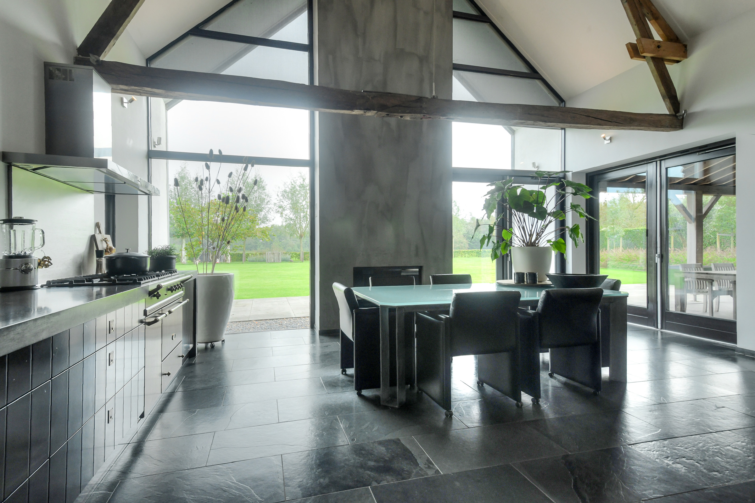 On the garden side, there are two sets of double garden doors and a large glass facade, offering beautiful views of the garden and the meadow/nature reserve beyond. A modern gas fireplace is built into the wall between the kitchen and garden.